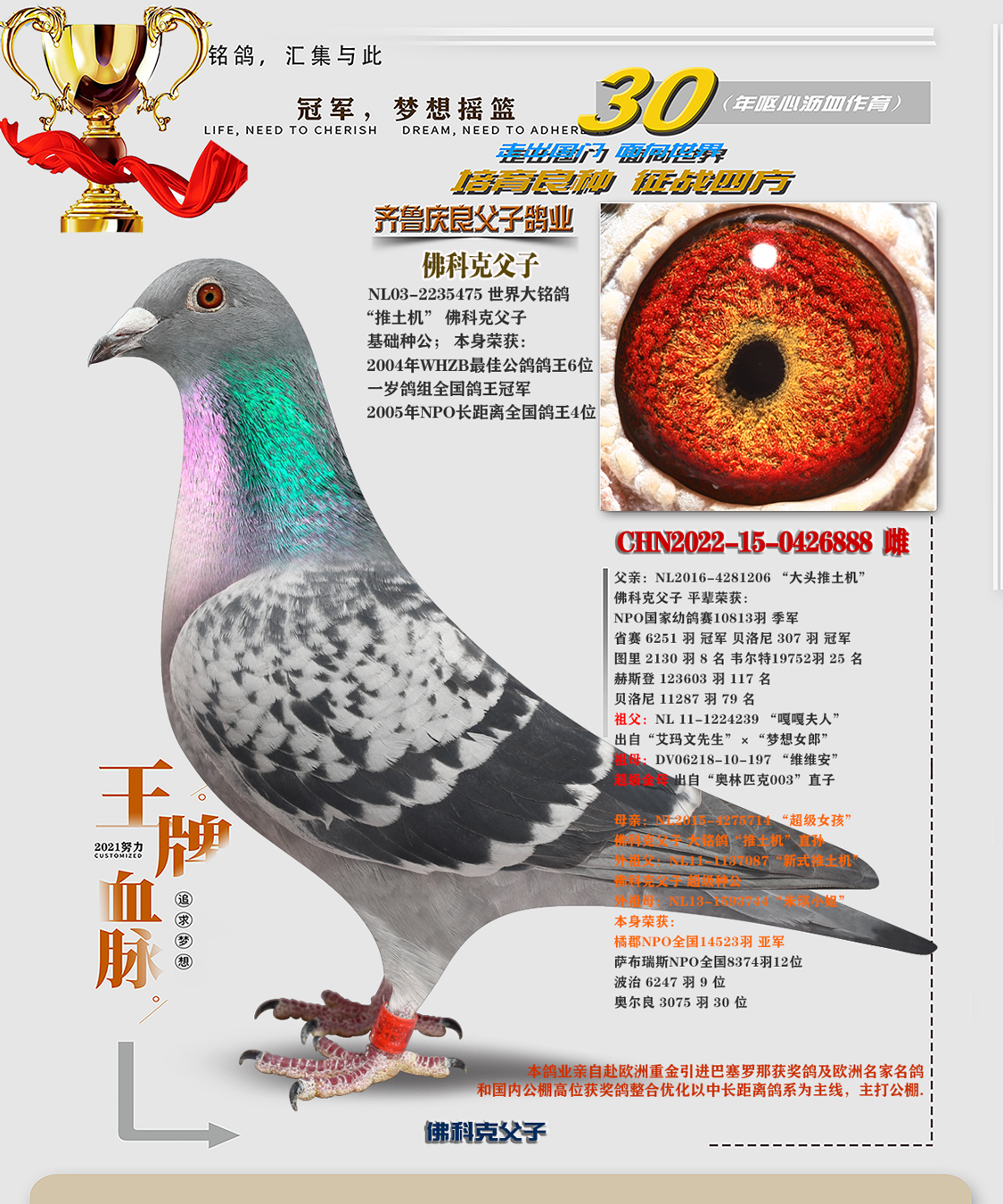 感謝齊魯良父子鴿業(yè)劉總支援巴賽羅那血統(tǒng)配我家彼得曼德斯血統(tǒng),在今年四關(guān)鴿王大賽斬獲5名,此鴿也是去年800特比小號只取10名的情況下飛進10名,獲獎金一萬元!再次感謝劉總。。