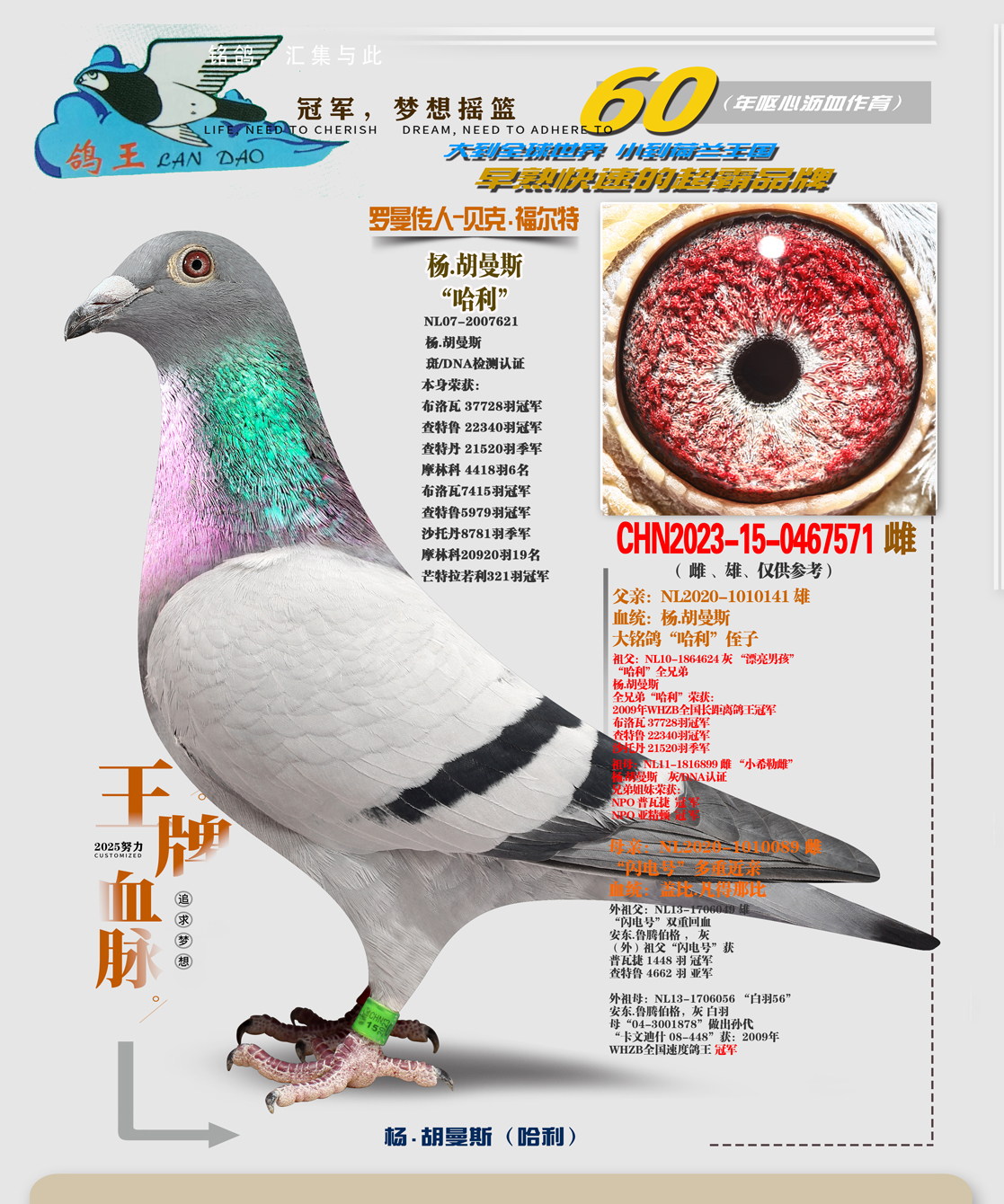 感謝齊魯良父子鴿業(yè)劉總支援巴賽羅那血統(tǒng)配我家彼得曼德斯血統(tǒng),在今年四關(guān)鴿王大賽斬獲5名,此鴿也是去年800特比小號(hào)只取10名的情況下飛進(jìn)10名,獲獎(jiǎng)金一萬(wàn)元!再次感謝劉總!。