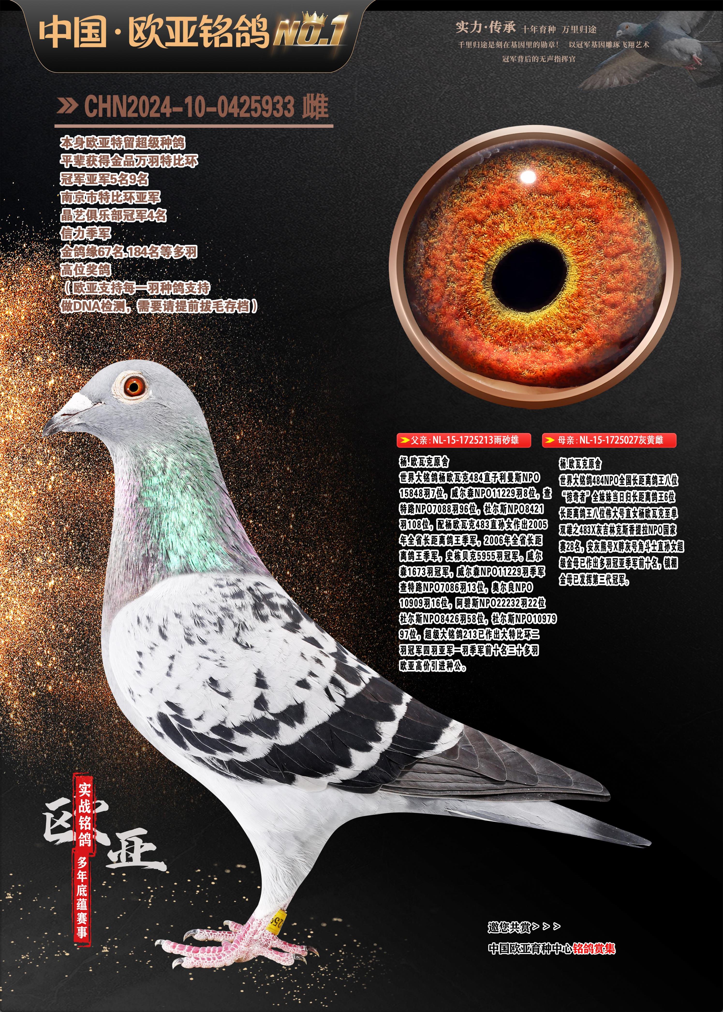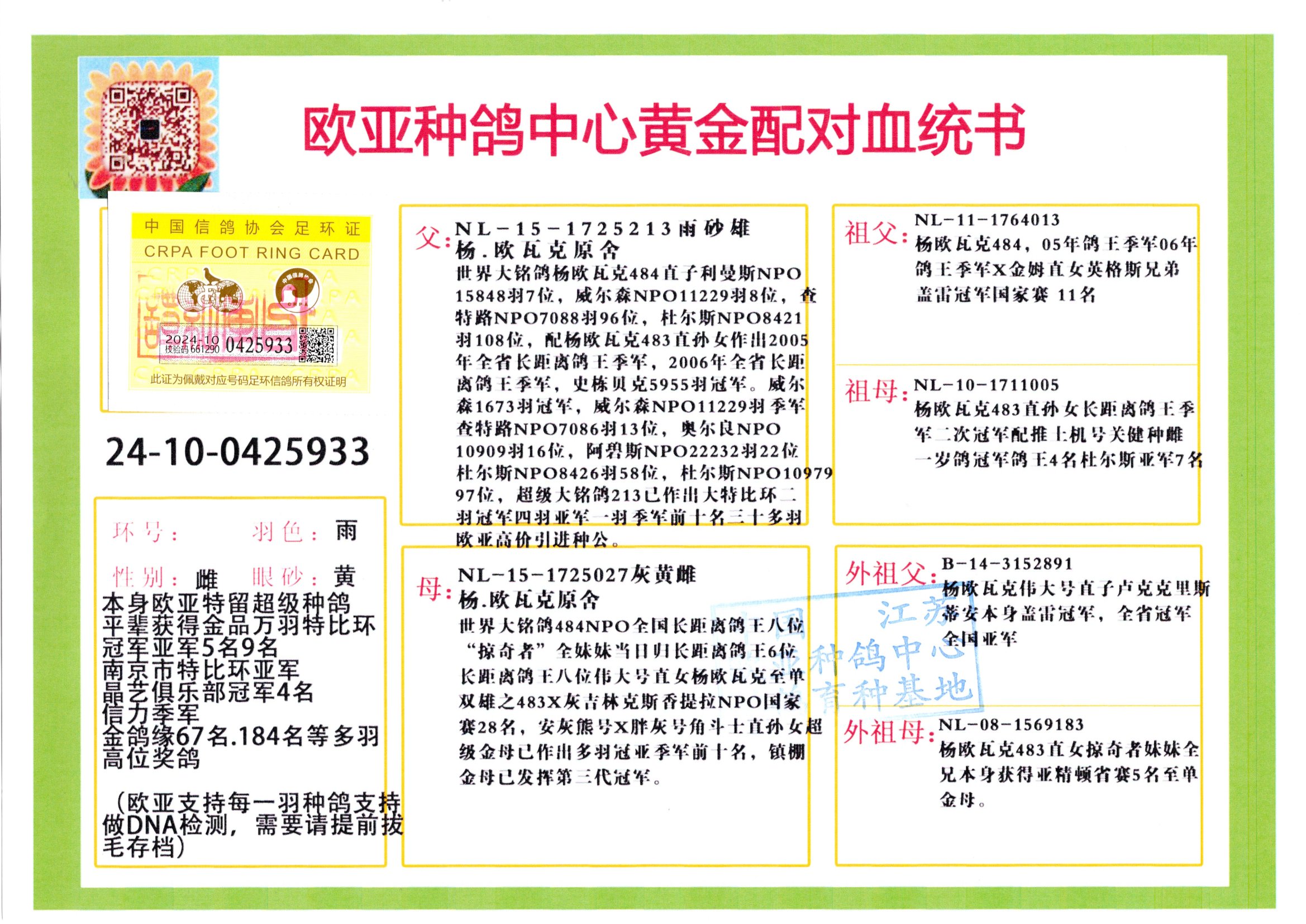 24年秋南京特比環(huán)歐亞榮獲大團體冠軍.小團體冠軍551公里大特比13名.14名.16名.19名.20名.21名.24名.26名.27名.28名.42名.52名.54名.57名.65名.66名.68名.70名.71名.72名.74名.76名.80名.82名.83名.84名.85名.86名.90名.92名.110名.116名.121名.122名.128名.131名.158名.161名.164名.165名.166名.172名.174名.177名.182名.195名.196名.201名.205名.208名.210名.216名.253名.269名.275名.276名.294名.296名.299名,,24年秋云南天南銅都公棚決賽415名.天南銅都小棚決賽409名.云南玉活公棚決賽102名.490名.團體32名上籠二羽進二羽,天南銅都大棚506公里決賽445名。熱烈祝賀河北省巨鹿縣李蘭生老師用歐亞泰山號血系連續(xù)十一年奪冠軍,河北省國家賽冠軍.全國季軍等多次前十名高位,揚州王軍王總用歐亞利奧24年春季獲山東翔宇公棚決賽33名蓋比53名。南京劉正龍劉總用歐亞蓋比獲得24年秋山東濰坊國際公棚決賽42名.精英賽30名.三關鴿王71名.決賽86名.加站賽16名.南京市特比環(huán)A組鴿王9名.B組鴿王5名.6名.C組鴿王5名.精英賽冠軍4名.技能賽A組冠軍4名.5名.秦淮區(qū)特比環(huán)榮獲15名.46名.48名.87名。四川西昌徐亮徐總用歐亞利奧獲得涼山州聚友決賽177名.第二關亞軍雙關鴿王19名.三關鴿王105名.云南豪庭公棚決賽603名。熱烈祝賀24年四川重慶翔園鴿舍用歐亞泰山號榮獲春季400公里冠軍.秋季500公里冠軍,河北王總用詹森X利奧獲得千羽千翔公棚400公里冠軍,廣東蔡楷煥榮獲24年秋愛好者 賽鴿俱樂部三關鴿王季軍.一關420公里99名.二關450公里11名.三關520公里32名.單關季軍.7名.12名,江西李衛(wèi)興榮獲貴州紅楓公棚8名.共翔俱樂部寄養(yǎng)棚四關綜合鴿王30名.一關400公里78名.二關500公里55名.三關520公里37名.四關500公里57名.同父母獲公棚18名.雷鳴獲得武漢黃浦育翔中心冠軍,四川陳文獲得四川明鴻俱樂部300公里夢幻2名.3名.4名.9名.10名.13名.14名.15名.31名.34名.40名.41名.42名.43名.69名.71名.72名.73名.74名.94名.95名.97名.98名.99名.419公里決賽榮獲總冠軍7名.總共歸巢9羽,四川徐亮獲豪庭決賽603名,山西鄭勇獲得山西泰鑫公棚決賽255名詹森紅狐,熱烈祝賀馬總獲得開爾(飛躍隊)決賽9名獲獎金1310000萬元.第一關52名,天津津福資賽180公里96名.獲獎金429543萬元,歐亞支持全國鴿友24年秋多人報喜 祝大家取得更好成績,給歐亞報喜鴿友歐亞決定給每人贈送一羽超級種鴿。歐亞俱樂部特比環(huán)多關鴿王成績:15年秋淮安特比環(huán)黑色星期一全會上籠9700多羽,當天無鴿歸巢,第二天全會歸巢357羽,本舍歸巢158羽.前十名八羽.前一百名歸巢57羽,16年春季獲五關鴿王總冠軍,總亞軍四名.六名.七名.九名.十名.晶藝俱樂部520公里冠亞季軍5名.6名.7名.9名.11名等,火車頭冠軍.季軍6名.8名.9名.10名,16年秋晶藝俱樂部特比環(huán)520公里亞軍.季軍4名.6名.7名.9名,15年春南京白下特比環(huán)冠軍.亞軍.季軍6名.7名.8名.9名.10名.指定鴿A B組獲得冠軍.亞軍.季軍4名.5名.,17年淮安特比環(huán)亞軍.4名.5名.7名.8名.10名.六關鴿王總冠軍.4名.6名.9名.10名,寄養(yǎng)棚宿遷劉總20羽特比環(huán)獲冠軍.季軍.4名.7名.8名.9名等。18年榮獲萬羽特比環(huán)六關鴿王總冠軍.總亞軍.總季軍.6名.8名.十名.單關四羽冠軍.二羽亞軍.四羽季軍.前十名27羽。19年秋萬羽特比環(huán)六關鴿王總亞軍.總季軍.5名.8名等,單關二羽冠軍.三羽亞軍.一羽季軍前十名31羽。20年秋淮安市鴿會四關特比環(huán)大賽風雨無阻鴿王亞軍.鴿王六名,金品俱樂部萬羽特比環(huán)六關鴿王總冠軍,總亞軍.四名.五名.六名.七名.八名.十名.前二百名鴿王35羽,單關冠亞季軍前十名四十多羽,火車頭五關鴿王季軍.六名.八名.前二百名鴿王十七羽。20年春榮獲淮安五區(qū)一市四關鴿王總冠軍.亞軍.四名.八名.九名。21年秋榮獲金品萬羽特比環(huán)大賽六關鴿王總亞軍.總季軍.四名.七名.九名.十名.單關冠亞軍季軍前十名三十多羽。火車頭協(xié)會鴿王六名.七名.十名.單關前十名十七羽。22年秋榮獲鴿王總冠軍.總亞軍.5名.7名.8名.9名.11名.單關冠亞季軍前十名三十多羽,第一關單關前二百名四十多羽,第二關前二百名三十多羽,第三關前二百名四十多羽,第四關前二百名四十多羽,第五關前一百名53羽。23年秋榮獲鴿王季軍.五名.八名.十名.13名.17名.20名.27名等多羽鴿王.單關前十名二十多羽。公棚.寄養(yǎng)棚部分成績:16年秋寧夏黃河公棚總冠軍電腦戈馬力指定通炮冠軍,17年送八羽參賽獲得鴿王八名進獎四名,支持韓總榮獲八名。支持鴿友榮獲寧夏中衛(wèi)公棚決賽總冠軍.精英賽冠軍,支持18年寧夏黃河公棚決賽冠軍詹森X泰山。安徽鼎博寄養(yǎng)棚院內外四關鴿王總冠軍.鴿王十七名.三十七名同窩,鴿王39名.42名.58名.67名。18年山東公棚預賽冠軍.決賽65名.送八羽進獎五羽.指定獲奔馳汽車一輛。支持鴿友獲得云南藍云公棚冠軍.蓋比X佛卡門。支持鴿友榮獲云南銀集公棚決賽冠軍 詹森427X520血系 速度賽6700羽冠軍。17年榮獲金馬俱樂部寄養(yǎng)棚四關鴿王總冠軍.季軍.六名.八名.第一關冠軍.亞軍.季軍四名.七名.十一名.金牌教練獎。支持鴿友18年北京費翔公棚預賽九名電腦X桑杰士,支持鴿友榮獲陜西威力公棚決賽11名.內蒙古臨河寄養(yǎng)棚四關鴿王六名.詹森配泰山,支持河北王總用歐亞詹森427配胡本喜獲20年秋開爾青年棚季軍。云南東榮公棚16年預賽冠軍.決賽77名.17年決賽12名.詹森紅狐X泰山,17年平安公棚決賽