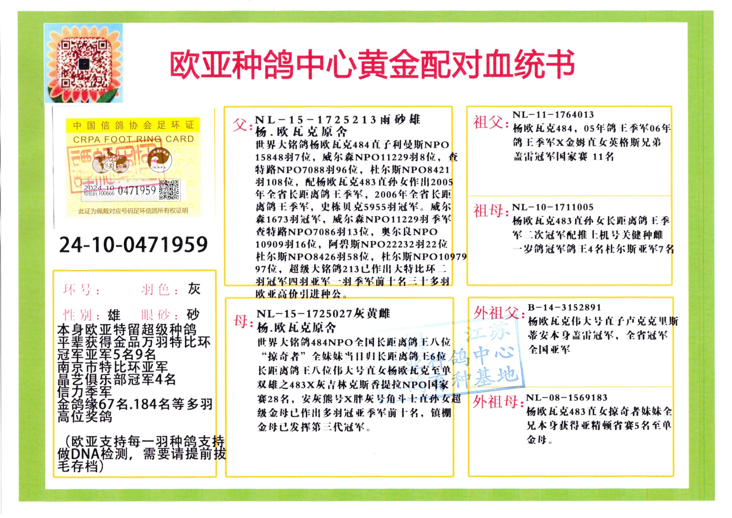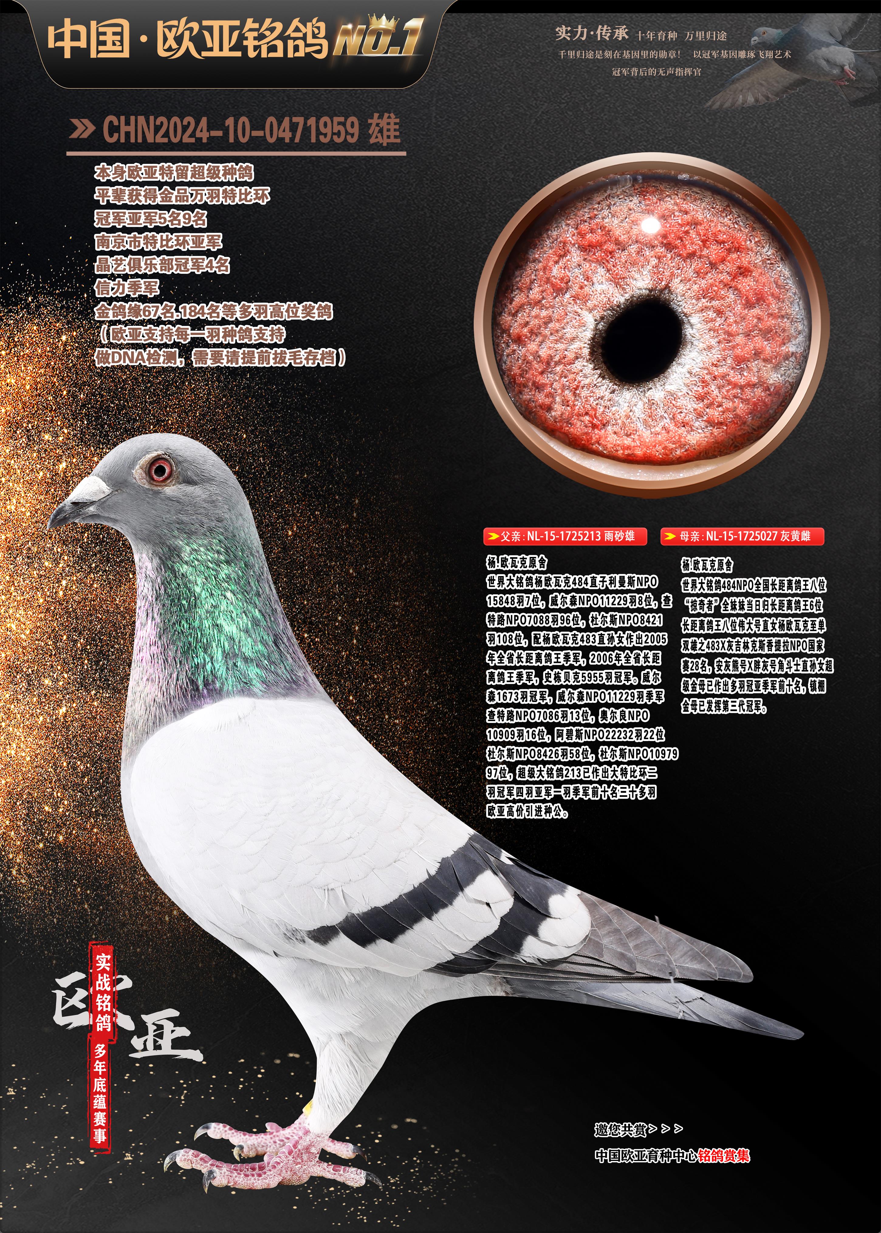24年秋南京特比環(huán)歐亞榮獲大團體冠軍.小團體冠軍551公里大特比13名.14名.16名.19名.20名.21名.24名.26名.27名.28名.42名.52名.54名.57名.65名.66名.68名.70名.71名.72名.74名.76名.80名.82名.83名.84名.85名.86名.90名.92名.110名.116名.121名.122名.128名.131名.158名.161名.164名.165名.166名.172名.174名.177名.182名.195名.196名.201名.205名.208名.210名.216名.253名.269名.275名.276名.294名.296名.299名,,24年秋云南天南銅都公棚決賽415名.天南銅都小棚決賽409名.云南玉活公棚決賽102名.490名.團體32名上籠二羽進二羽,天南銅都大棚506公里決賽445名。熱烈祝賀河北省巨鹿縣李蘭生老師用歐亞泰山號血系連續(xù)十一年奪冠軍,河北省國家賽冠軍.全國季軍等多次前十名高位,揚州王軍王總用歐亞利奧24年春季獲山東翔宇公棚決賽33名蓋比53名。南京劉正龍劉總用歐亞蓋比獲得24年秋山東濰坊國際公棚決賽42名.精英賽30名.三關鴿王71名.決賽86名.加站賽16名.南京市特比環(huán)A組鴿王9名.B組鴿王5名.6名.C組鴿王5名.精英賽冠軍4名.技能賽A組冠軍4名.5名.秦淮區(qū)特比環(huán)榮獲15名.46名.48名.87名。四川西昌徐亮徐總用歐亞利奧獲得涼山州聚友決賽177名.第二關亞軍雙關鴿王19名.三關鴿王105名.云南豪庭公棚決賽603名。熱烈祝賀24年四川重慶翔園鴿舍用歐亞泰山號榮獲春季400公里冠軍.秋季500公里冠軍,河北王總用詹森X利奧獲得千羽千翔公棚400公里冠軍,廣東蔡楷煥榮獲24年秋愛好者 賽鴿俱樂部三關鴿王季軍.一關420公里99名.二關450公里11名.三關520公里32名.單關季軍.7名.12名,江西李衛(wèi)興榮獲貴州紅楓公棚8名.共翔俱樂部寄養(yǎng)棚四關綜合鴿王30名.一關400公里78名.二關500公里55名.三關520公里37名.四關500公里57名.同父母獲公棚18名.雷鳴獲得武漢黃浦育翔中心冠軍,四川陳文獲得四川明鴻俱樂部300公里夢幻2名.3名.4名.9名.10名.13名.14名.15名.31名.34名.40名.41名.42名.43名.69名.71名.72名.73名.74名.94名.95名.97名.98名.99名.419公里決賽榮獲總冠軍7名.總共歸巢9羽,四川徐亮獲豪庭決賽603名,山西鄭勇獲得山西泰鑫公棚決賽255名詹森紅狐,熱烈祝賀馬總獲得開爾(飛躍隊)決賽9名獲獎金1310000萬元.第一關52名,天津津福資賽180公里96名.獲獎金429543萬元,歐亞支持全國鴿友24年秋多人報喜 祝大家取得更好成績,給歐亞報喜鴿友歐亞決定給每人贈送一羽超級種鴿。歐亞俱樂部特比環(huán)多關鴿王成績:15年秋淮安特比環(huán)黑色星期一全會上籠9700多羽,當天無鴿歸巢,第二天全會歸巢357羽,本舍歸巢158羽.前十名八羽.前一百名歸巢57羽,16年春季獲五關鴿王總冠軍,總亞軍四名.六名.七名.九名.十名.晶藝俱樂部520公里冠亞季軍5名.6名.7名.9名.11名等,火車頭冠軍.季軍6名.8名.9名.10名,16年秋晶藝俱樂部特比環(huán)520公里亞軍.季軍4名.6名.7名.9名,15年春南京白下特比環(huán)冠軍.亞軍.季軍6名.7名.8名.9名.10名.指定鴿A B組獲得冠軍.亞軍.季軍4名.5名.,17年淮安特比環(huán)亞軍.4名.5名.7名.8名.10名.六關鴿王總冠軍.4名.6名.9名.10名,寄養(yǎng)棚宿遷劉總20羽特比環(huán)獲冠軍.季軍.4名.7名.8名.9名等。18年榮獲萬羽特比環(huán)六關鴿王總冠軍.總亞軍.總季軍.6名.8名.十名.單關四羽冠軍.二羽亞軍.四羽季軍.前十名27羽。19年秋萬羽特比環(huán)六關鴿王總亞軍.總季軍.5名.8名等,單關二羽冠軍.三羽亞軍.一羽季軍前十名31羽。20年秋淮安市鴿會四關特比環(huán)大賽風雨無阻鴿王亞軍.鴿王六名,金品俱樂部萬羽特比環(huán)六關鴿王總冠軍,總亞軍.四名.五名.六名.七名.八名.十名.前二百名鴿王35羽,單關冠亞季軍前十名四十多羽,火車頭五關鴿王季軍.六名.八名.前二百名鴿王十七羽。20年春榮獲淮安五區(qū)一市四關鴿王總冠軍.亞軍.四名.八名.九名。21年秋榮獲金品萬羽特比環(huán)大賽六關鴿王總亞軍.總季軍.四名.七名.九名.十名.單關冠亞軍季軍前十名三十多羽;疖囶^協會鴿王六名.七名.十名.單關前十名十七羽。22年秋榮獲鴿王總冠軍.總亞軍.5名.7名.8名.9名.11名.單關冠亞季軍前十名三十多羽,第一關單關前二百名四十多羽,第二關前二百名三十多羽,第三關前二百名四十多羽,第四關前二百名四十多羽,第五關前一百名53羽。23年秋榮獲鴿王季軍.五名.八名.十名.13名.17名.20名.27名等多羽鴿王.單關前十名二十多羽。公棚.寄養(yǎng)棚部分成績:16年秋寧夏黃河公棚總冠軍電腦戈馬力指定通炮冠軍,17年送八羽參賽獲得鴿王八名進獎四名,支持韓總榮獲八名。支持鴿友榮獲寧夏中衛(wèi)公棚決賽總冠軍.精英賽冠軍,支持18年寧夏黃河公棚決賽冠軍詹森X泰山。安徽鼎博寄養(yǎng)棚院內外四關鴿王總冠軍.鴿王十七名.三十七名同窩,鴿王39名.42名.58名.67名。18年山東公棚預賽冠軍.決賽65名.送八羽進獎五羽.指定獲奔馳汽車一輛。支持鴿友獲得云南藍云公棚冠軍.蓋比X佛卡門。支持鴿友榮獲云南銀集公棚決賽冠軍 詹森427X520血系 速度賽6700羽冠軍。17年榮獲金馬俱樂部寄養(yǎng)棚四關鴿王總冠軍.季軍.六名.八名.第一關冠軍.亞軍.季軍四名.七名.十一名.金牌教練獎。支持鴿友18年北京費翔公棚預賽九名電腦X桑杰士,支持鴿友榮獲陜西威力公棚決賽11名.內蒙古臨河寄養(yǎng)棚四關鴿王六名.詹森配泰山,支持河北王總用歐亞詹森427配胡本喜獲20年秋開爾青年棚季軍。云南東榮公棚16年預賽冠軍.決賽77名.17年決賽12名.詹森紅狐X泰山,17年平安公棚決賽4名 詹
