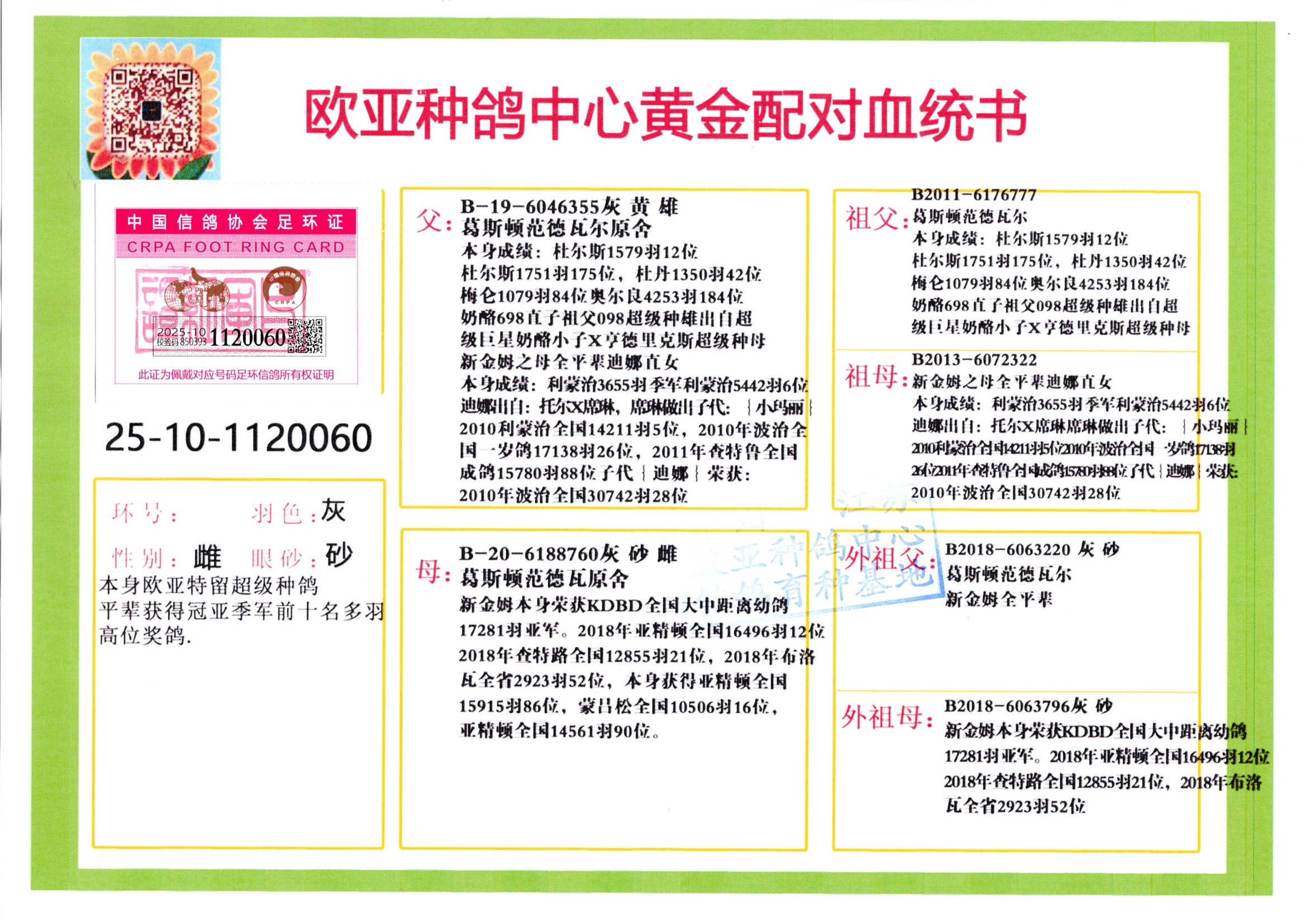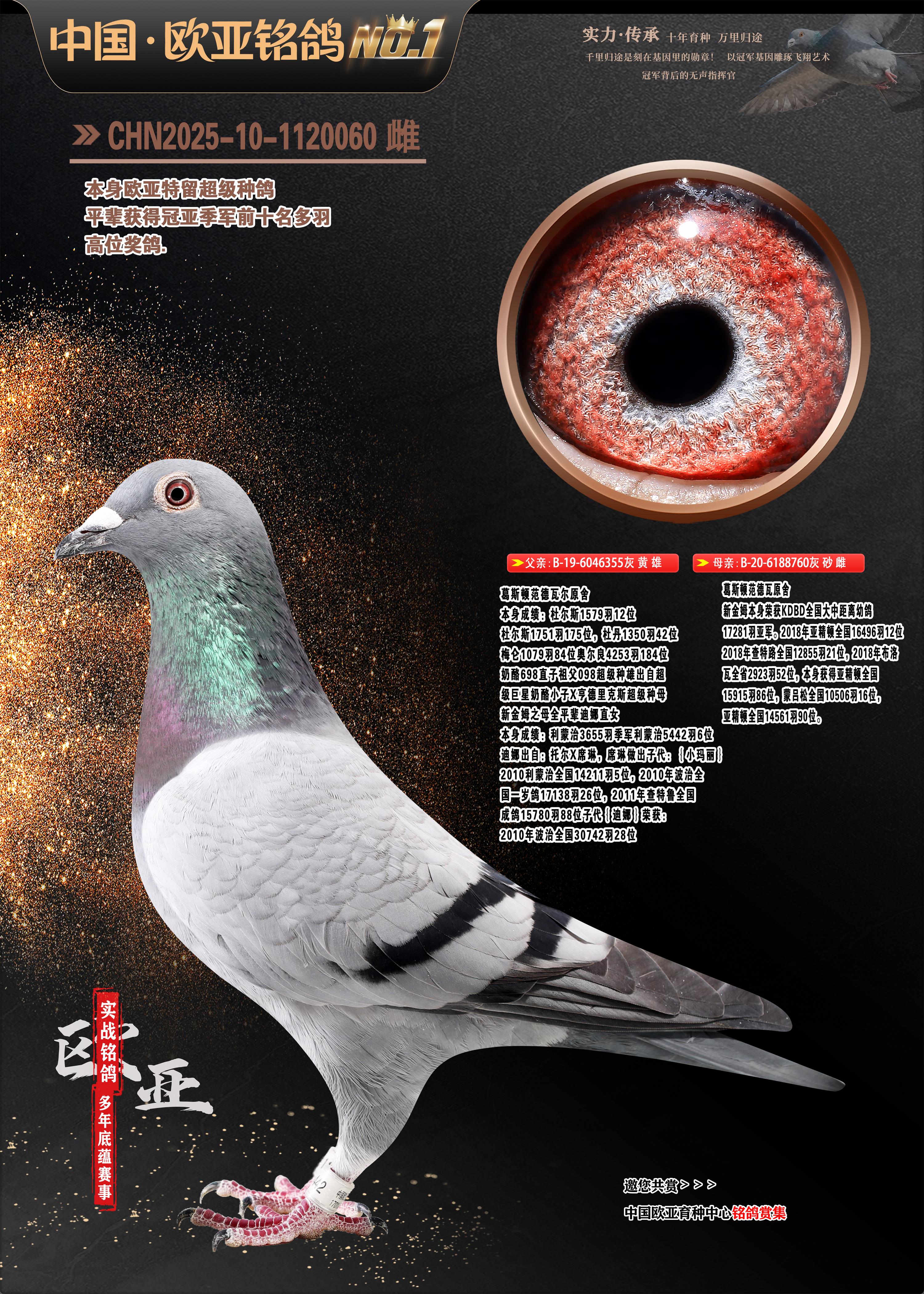24年秋南京特比環(huán)歐亞榮獲大團(tuán)體冠軍.小團(tuán)體冠軍551公里大特比13名.14名.16名.19名.20名.21名.24名.26名.27名.28名.42名.52名.54名.57名.65名.66名.68名.70名.71名.72名.74名.76名.80名.82名.83名.84名.85名.86名.90名.92名.110名.116名.121名.122名.128名.131名.158名.161名.164名.165名.166名.172名.174名.177名.182名.195名.196名.201名.205名.208名.210名.216名.253名.269名.275名.276名.294名.296名.299名,,24年秋云南天南銅都公棚決賽415名.天南銅都小棚決賽409名.云南玉活公棚決賽102名.490名.團(tuán)體32名上籠二羽進(jìn)二羽,天南銅都大棚506公里決賽445名。熱烈祝賀河北省巨鹿縣李蘭生老師用歐亞泰山號(hào)血系連續(xù)十一年奪冠軍,河北省國(guó)家賽冠軍.全國(guó)季軍等多次前十名高位,揚(yáng)州王軍王總用歐亞利奧24年春季獲山東翔宇公棚決賽33名蓋比53名。南京劉正龍劉總用歐亞蓋比獲得24年秋山東濰坊國(guó)際公棚決賽42名.精英賽30名.三關(guān)鴿王71名.決賽86名.加站賽16名.南京市特比環(huán)A組鴿王9名.B組鴿王5名.6名.C組鴿王5名.精英賽冠軍4名.技能賽A組冠軍4名.5名.秦淮區(qū)特比環(huán)榮獲15名.46名.48名.87名。四川西昌徐亮徐總用歐亞利奧獲得涼山州聚友決賽177名.第二關(guān)亞軍雙關(guān)鴿王19名.三關(guān)鴿王105名.云南豪庭公棚決賽603名。熱烈祝賀24年四川重慶翔園鴿舍用歐亞泰山號(hào)榮獲春季400公里冠軍.秋季500公里冠軍,河北王總用詹森X利奧獲得千羽千翔公棚400公里冠軍,廣東蔡楷煥榮獲24年秋愛好者 賽鴿俱樂部三關(guān)鴿王季軍.一關(guān)420公里99名.二關(guān)450公里11名.三關(guān)520公里32名.單關(guān)季軍.7名.12名,江西李衛(wèi)興榮獲貴州紅楓公棚8名.共翔俱樂部寄養(yǎng)棚四關(guān)綜合鴿王30名.一關(guān)400公里78名.二關(guān)500公里55名.三關(guān)520公里37名.四關(guān)500公里57名.同父母獲公棚18名.雷鳴獲得武漢黃浦育翔中心冠軍,四川陳文獲得四川明鴻俱樂部300公里夢(mèng)幻2名.3名.4名.9名.10名.13名.14名.15名.31名.34名.40名.41名.42名.43名.69名.71名.72名.73名.74名.94名.95名.97名.98名.99名.419公里決賽榮獲總冠軍7名.總共歸巢9羽,四川徐亮獲豪庭決賽603名,山西鄭勇獲得山西泰鑫公棚決賽255名詹森紅狐,熱烈祝賀馬總獲得開爾(飛躍隊(duì))決賽9名獲獎(jiǎng)金1310000萬元.第一關(guān)52名,天津津福資賽180公里96名.獲獎(jiǎng)金429543萬元,歐亞支持全國(guó)鴿友24年秋多人報(bào)喜 祝大家取得更好成績(jī),給歐亞報(bào)喜鴿友歐亞決定給每人贈(zèng)送一羽超級(jí)種鴿。歐亞俱樂部特比環(huán)多關(guān)鴿王成績(jī):15年秋淮安特比環(huán)黑色星期一全會(huì)上籠9700多羽,當(dāng)天無鴿歸巢,第二天全會(huì)歸巢357羽,本舍歸巢158羽.前十名八羽.前一百名歸巢57羽,16年春季獲五關(guān)鴿王總冠軍,總亞軍四名.六名.七名.九名.十名.晶藝俱樂部520公里冠亞季軍5名.6名.7名.9名.11名等,火車頭冠軍.季軍6名.8名.9名.10名,16年秋晶藝俱樂部特比環(huán)520公里亞軍.季軍4名.6名.7名.9名,15年春南京白下特比環(huán)冠軍.亞軍.季軍6名.7名.8名.9名.10名.指定鴿A B組獲得冠軍.亞軍.季軍4名.5名.,17年淮安特比環(huán)亞軍.4名.5名.7名.8名.10名.六關(guān)鴿王總冠軍.4名.6名.9名.10名,寄養(yǎng)棚宿遷劉總20羽特比環(huán)獲冠軍.季軍.4名.7名.8名.9名等。18年榮獲萬羽特比環(huán)六關(guān)鴿王總冠軍.總亞軍.總季軍.6名.8名.十名.單關(guān)四羽冠軍.二羽亞軍.四羽季軍.前十名27羽。19年秋萬羽特比環(huán)六關(guān)鴿王總亞軍.總季軍.5名.8名等,單關(guān)二羽冠軍.三羽亞軍.一羽季軍前十名31羽。20年秋淮安市鴿會(huì)四關(guān)特比環(huán)大賽風(fēng)雨無阻鴿王亞軍.鴿王六名,金品俱樂部萬羽特比環(huán)六關(guān)鴿王總冠軍,總亞軍.四名.五名.六名.七名.八名.十名.前二百名鴿王35羽,單關(guān)冠亞季軍前十名四十多羽,火車頭五關(guān)鴿王季軍.六名.八名.前二百名鴿王十七羽。20年春榮獲淮安五區(qū)一市四關(guān)鴿王總冠軍.亞軍.四名.八名.九名。21年秋榮獲金品萬羽特比環(huán)大賽六關(guān)鴿王總亞軍.總季軍.四名.七名.九名.十名.單關(guān)冠亞軍季軍前十名三十多羽;疖囶^協(xié)會(huì)鴿王六名.七名.十名.單關(guān)前十名十七羽。22年秋榮獲鴿王總冠軍.總亞軍.5名.7名.8名.9名.11名.單關(guān)冠亞季軍前十名三十多羽,第一關(guān)單關(guān)前二百名四十多羽,第二關(guān)前二百名三十多羽,第三關(guān)前二百名四十多羽,第四關(guān)前二百名四十多羽,第五關(guān)前一百名53羽。23年秋榮獲鴿王季軍.五名.八名.十名.13名.17名.20名.27名等多羽鴿王.單關(guān)前十名二十多羽。公棚.寄養(yǎng)棚部分成績(jī):16年秋寧夏黃河公棚總冠軍電腦戈馬力指定通炮冠軍,17年送八羽參賽獲得鴿王八名進(jìn)獎(jiǎng)四名,支持韓總榮獲八名。支持鴿友榮獲寧夏中衛(wèi)公棚決賽總冠軍.精英賽冠軍,支持18年寧夏黃河公棚決賽冠軍詹森X泰山。安徽鼎博寄養(yǎng)棚院內(nèi)外四關(guān)鴿王總冠軍.鴿王十七名.三十七名同窩,鴿王39名.42名.58名.67名。18年山東公棚預(yù)賽冠軍.決賽65名.送八羽進(jìn)獎(jiǎng)五羽.指定獲奔馳汽車一輛。支持鴿友獲得云南藍(lán)云公棚冠軍.蓋比X佛卡門。支持鴿友榮獲云南銀集公棚決賽冠軍 詹森427X520血系 速度賽6700羽冠軍。17年榮獲金馬俱樂部寄養(y