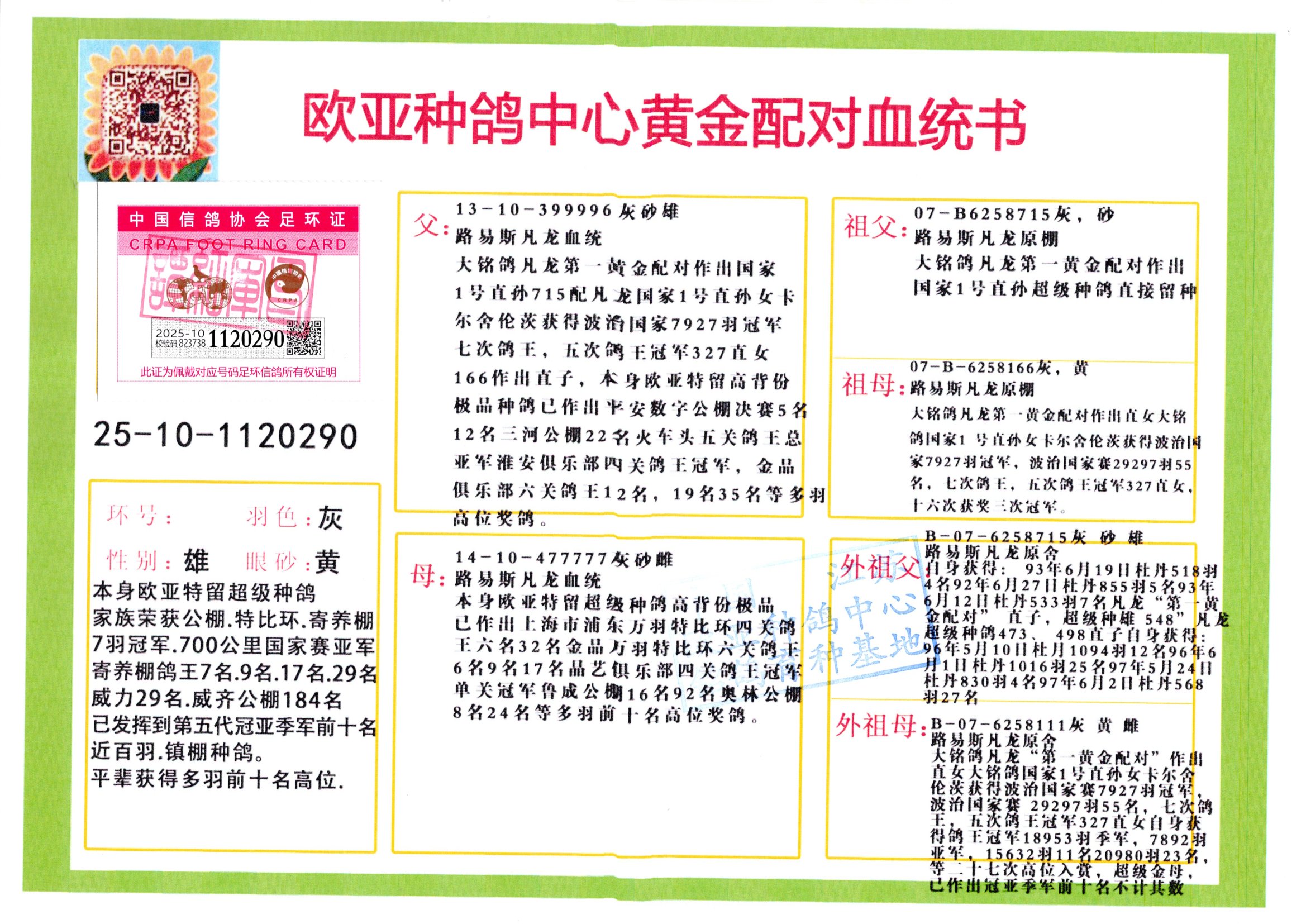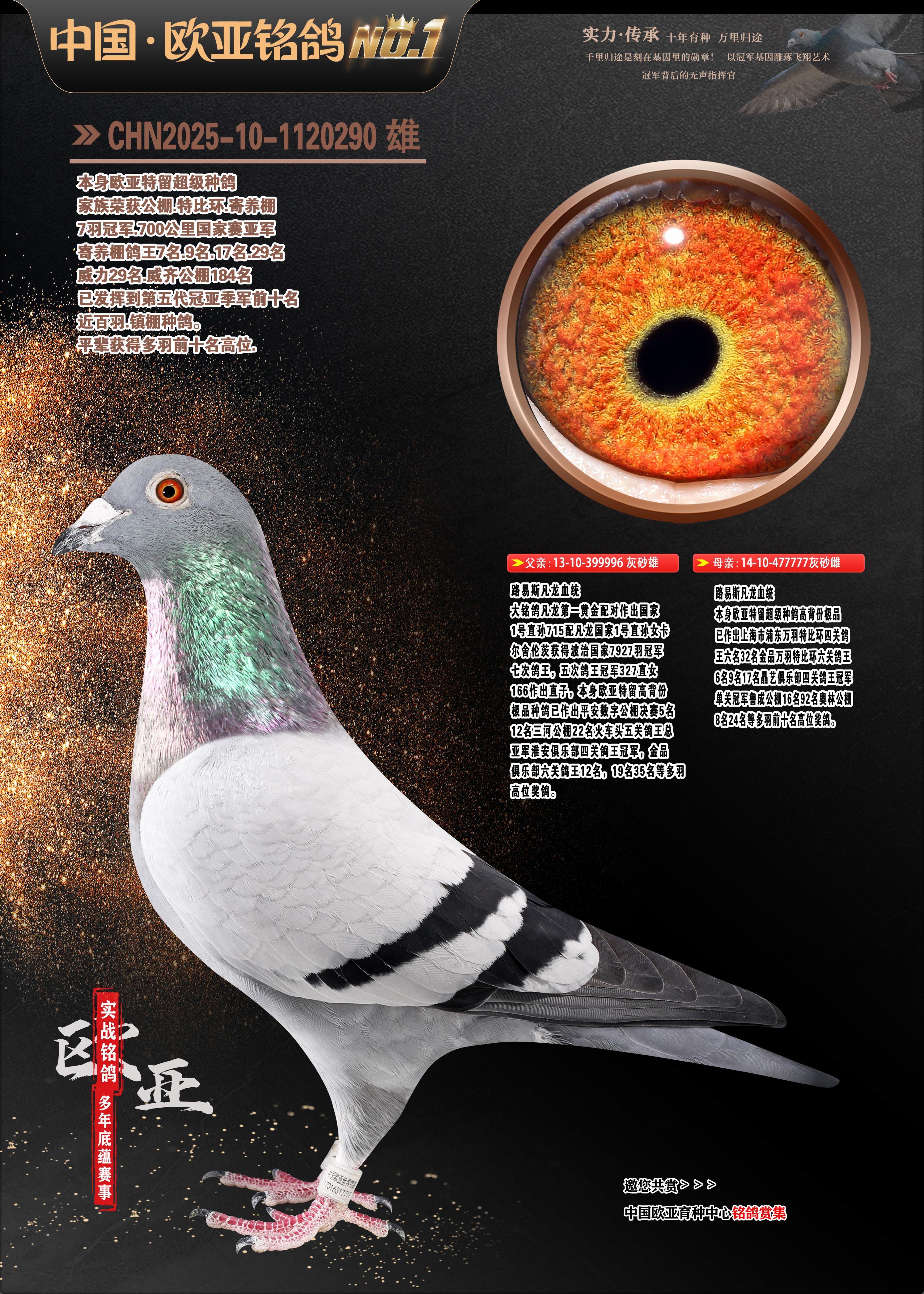 24年秋南京特比環(huán)歐亞榮獲大團(tuán)體冠軍.小團(tuán)體冠軍551公里大特比13名.14名.16名.19名.20名.21名.24名.26名.27名.28名.42名.52名.54名.57名.65名.66名.68名.70名.71名.72名.74名.76名.80名.82名.83名.84名.85名.86名.90名.92名.110名.116名.121名.122名.128名.131名.158名.161名.164名.165名.166名.172名.174名.177名.182名.195名.196名.201名.205名.208名.210名.216名.253名.269名.275名.276名.294名.296名.299名,,24年秋云南天南銅都公棚決賽415名.天南銅都小棚決賽409名.云南玉活公棚決賽102名.490名.團(tuán)體32名上籠二羽進(jìn)二羽,天南銅都大棚506公里決賽445名。熱烈祝賀河北省巨鹿縣李蘭生老師用歐亞泰山號血系連續(xù)十一年奪冠軍,河北省國家賽冠軍.全國季軍等多次前十名高位,揚(yáng)州王軍王總用歐亞利奧24年春季獲山東翔宇公棚決賽33名蓋比53名。南京劉正龍劉總用歐亞蓋比獲得24年秋山東濰坊國際公棚決賽42名.精英賽30名.三關(guān)鴿王71名.決賽86名.加站賽16名.南京市特比環(huán)A組鴿王9名.B組鴿王5名.6名.C組鴿王5名.精英賽冠軍4名.技能賽A組冠軍4名.5名.秦淮區(qū)特比環(huán)榮獲15名.46名.48名.87名。四川西昌徐亮徐總用歐亞利奧獲得涼山州聚友決賽177名.第二關(guān)亞軍雙關(guān)鴿王19名.三關(guān)鴿王105名.云南豪庭公棚決賽603名。熱烈祝賀24年四川重慶翔園鴿舍用歐亞泰山號榮獲春季400公里冠軍.秋季500公里冠軍,河北王總用詹森X利奧獲得千羽千翔公棚400公里冠軍,廣東蔡楷煥榮獲24年秋愛好者 賽鴿俱樂部三關(guān)鴿王季軍.一關(guān)420公里99名.二關(guān)450公里11名.三關(guān)520公里32名.單關(guān)季軍.7名.12名,江西李衛(wèi)興榮獲貴州紅楓公棚8名.共翔俱樂部寄養(yǎng)棚四關(guān)綜合鴿王30名.一關(guān)400公里78名.二關(guān)500公里55名.三關(guān)520公里37名.四關(guān)500公里57名.同父母獲公棚18名.雷鳴獲得武漢黃浦育翔中心冠軍,四川陳文獲得四川明鴻俱樂部300公里夢幻2名.3名.4名.9名.10名.13名.14名.15名.31名.34名.40名.41名.42名.43名.69名.71名.72名.73名.74名.94名.95名.97名.98名.99名.419公里決賽榮獲總冠軍7名.總共歸巢9羽,四川徐亮獲豪庭決賽603名,山西鄭勇獲得山西泰鑫公棚決賽255名詹森紅狐,熱烈祝賀馬總獲得開爾(飛躍隊(duì))決賽9名獲獎金1310000萬元.第一關(guān)52名,天津津福資賽180公里96名.獲獎金429543萬元,歐亞支持全國鴿友24年秋多人報喜 祝大家取得更好成績,給歐亞報喜鴿友歐亞決定給每人贈送一羽超級種鴿。歐亞俱樂部特比環(huán)多關(guān)鴿王成績:15年秋淮安特比環(huán)黑色星期一全會上籠9700多羽,當(dāng)天無鴿歸巢,第二天全會歸巢357羽,本舍歸巢158羽.前十名八羽.前一百名歸巢57羽,16年春季獲五關(guān)鴿王總冠軍,總亞軍四名.六名.七名.九名.十名.晶藝俱樂部520公里冠亞季軍5名.6名.7名.9名.11名等,火車頭冠軍.季軍6名.8名.9名.10名,16年秋晶藝俱樂部特比環(huán)520公里亞軍.季軍4名.6名.7名.9名,15年春南京白下特比環(huán)冠軍.亞軍.季軍6名.7名.8名.9名.10名.指定鴿A B組獲得冠軍.亞軍.季軍4名.5名.,17年淮安特比環(huán)亞軍.4名.5名.7名.8名.10名.六關(guān)鴿王總冠軍.4名.6名.9名.10名,寄養(yǎng)棚宿遷劉總20羽特比環(huán)獲冠軍.季軍.4名.7名.8名.9名等。18年榮獲萬羽特比環(huán)六關(guān)鴿王總冠軍.總亞軍.總季軍.6名.8名.十名.單關(guān)四羽冠軍.二羽亞軍.四羽季軍.前十名27羽。19年秋萬羽特比環(huán)六關(guān)鴿王總亞軍.總季軍.5名.8名等,單關(guān)二羽冠軍.三羽亞軍.一羽季軍前十名31羽。20年秋淮安市鴿會四關(guān)特比環(huán)大賽風(fēng)雨無阻鴿王亞軍.鴿王六名,金品俱樂部萬羽特比環(huán)六關(guān)鴿王總冠軍,總亞軍.四名.五名.六名.七名.八名.十名.前二百名鴿王35羽,單關(guān)冠亞季軍前十名四十多羽,火車頭五關(guān)鴿王季軍.六名.八名.前二百名鴿王十七羽。20年春榮獲淮安五區(qū)一市四關(guān)鴿王總冠軍.亞軍.四名.八名.九名。21年秋榮獲金品萬羽特比環(huán)大賽六關(guān)鴿王總亞軍.總季軍.四名.七名.九名.十名.單關(guān)冠亞軍季軍前十名三十多羽;疖囶^協(xié)會鴿王六名.七名.十名.單關(guān)前十名十七羽。22年秋榮獲鴿王總冠軍.總亞軍.5名.7名.8名.9名.11名.單關(guān)冠亞季軍前十名三十多羽,第一關(guān)單關(guān)前二百名四十多羽,第二關(guān)前二百名三十多羽,第三關(guān)前二百名四十多羽,第四關(guān)前二百名四十多羽,第五關(guān)前一百名53羽。23年秋榮獲鴿王季軍.五名.八名.十名.13名.17名.20名.27名等多羽鴿王.單關(guān)前十名二十多羽。公棚.寄養(yǎng)棚部分成績:16年秋寧夏黃河公棚總冠軍電腦戈馬力指定通炮冠軍,17年送八羽參賽獲得鴿王八名進(jìn)獎四名,支持韓總榮獲八名。支持鴿友榮獲寧夏中衛(wèi)公棚決賽總冠軍.精英賽冠軍,支持18年寧夏黃河公棚決賽冠軍詹森X泰山。安徽鼎博寄養(yǎng)棚院內(nèi)外四關(guān)鴿王總冠軍.鴿王十七名.三十七名同窩,鴿王39名.42名.58名.67名。18年山東公棚預(yù)賽冠軍.決賽65名.送八羽進(jìn)獎五羽.指定獲奔馳汽車一輛。支持鴿友獲得云南藍(lán)云公棚冠軍.蓋比X佛卡門。支持鴿友榮獲云南銀集公棚決賽冠軍 詹森427X520血系 速度賽6700羽冠軍。17年榮獲金馬俱樂部寄養(yǎng)棚四關(guān)鴿王總冠軍.季軍.六名.八名.第一關(guān)冠軍.亞軍.季軍四名.七名.十一名.金牌教練獎。支