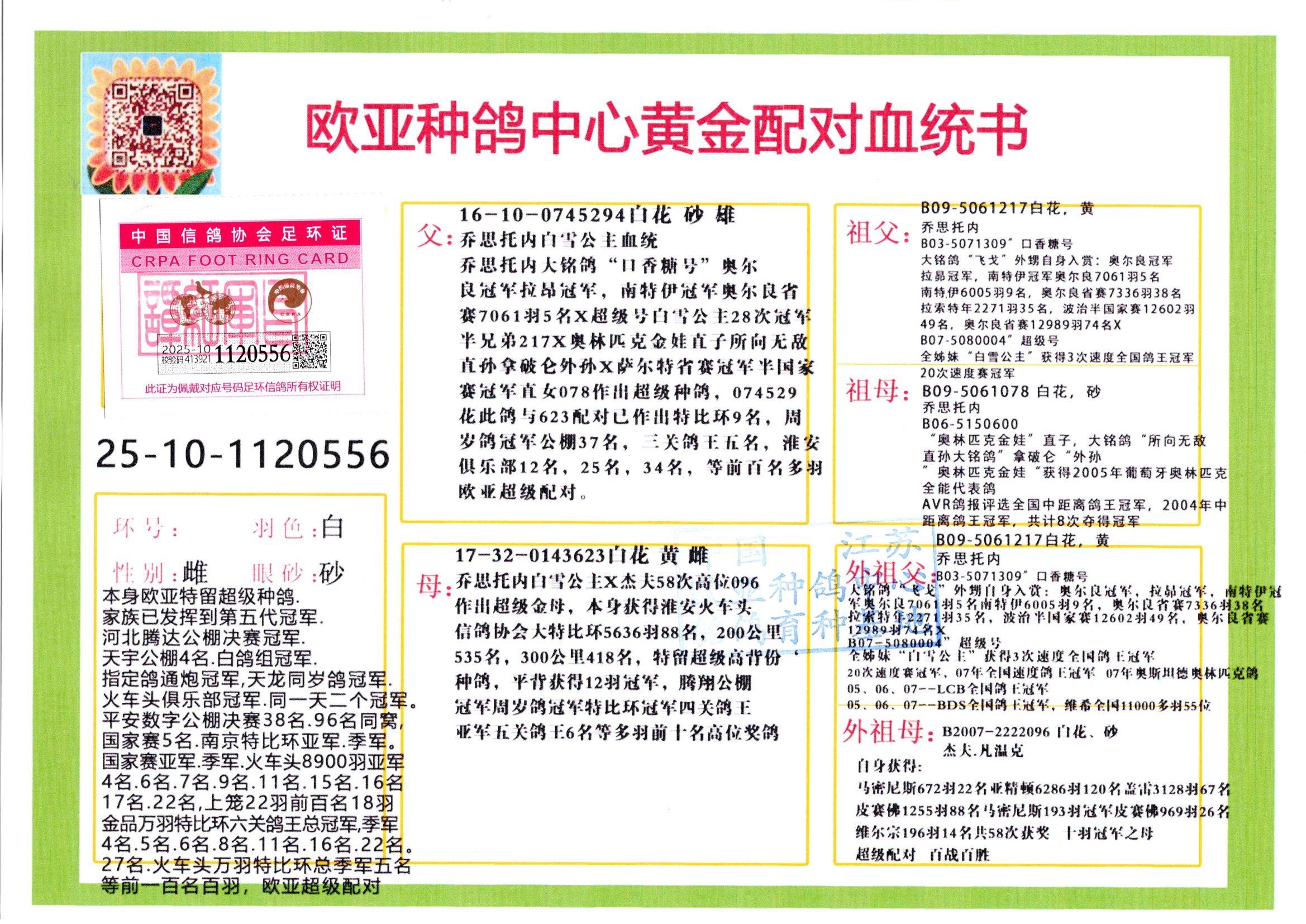 24年秋南京特比環(huán)歐亞榮獲大團體冠軍.小團體冠軍551公里大特比13名.14名.16名.19名.20名.21名.24名.26名.27名.28名.42名.52名.54名.57名.65名.66名.68名.70名.71名.72名.74名.76名.80名.82名.83名.84名.85名.86名.90名.92名.110名.116名.121名.122名.128名.131名.158名.161名.164名.165名.166名.172名.174名.177名.182名.195名.196名.201名.205名.208名.210名.216名.253名.269名.275名.276名.294名.296名.299名,,24年秋云南天南銅都公棚決賽415名.天南銅都小棚決賽409名.云南玉活公棚決賽102名.490名.團體32名上籠二羽進二羽,天南銅都大棚506公里決賽445名。熱烈祝賀河北省巨鹿縣李蘭生老師用歐亞泰山號血系連續(xù)十一年奪冠軍,河北省國家賽冠軍.全國季軍等多次前十名高位,揚州王軍王總用歐亞利奧24年春季獲山東翔宇公棚決賽33名蓋比53名。南京劉正龍劉總用歐亞蓋比獲得24年秋山東濰坊國際公棚決賽42名.精英賽30名.三關鴿王71名.決賽86名.加站賽16名.南京市特比環(huán)A組鴿王9名.B組鴿王5名.6名.C組鴿王5名.精英賽冠軍4名.技能賽A組冠軍4名.5名.秦淮區(qū)特比環(huán)榮獲15名.46名.48名.87名。四川西昌徐亮徐總用歐亞利奧獲得涼山州聚友決賽177名.第二關亞軍雙關鴿王19名.三關鴿王105名.云南豪庭公棚決賽603名。熱烈祝賀24年四川重慶翔園鴿舍用歐亞泰山號榮獲春季400公里冠軍.秋季500公里冠軍,河北王總用詹森X利奧獲得千羽千翔公棚400公里冠軍,廣東蔡楷煥榮獲24年秋愛好者 賽鴿俱樂部三關鴿王季軍.一關420公里99名.二關450公里11名.三關520公里32名.單關季軍.7名.12名,江西李衛(wèi)興榮獲貴州紅楓公棚8名.共翔俱樂部寄養(yǎng)棚四關綜合鴿王30名.一關400公里78名.二關500公里55名.三關520公里37名.四關500公里57名.同父母獲公棚18名.雷鳴獲得武漢黃浦育翔中心冠軍,四川陳文獲得四川明鴻俱樂部300公里夢幻2名.3名.4名.9名.10名.13名.14名.15名.31名.34名.40名.41名.42名.43名.69名.71名.72名.73名.74名.94名.95名.97名.98名.99名.419公里決賽榮獲總冠軍7名.總共歸巢9羽,四川徐亮獲豪庭決賽603名,山西鄭勇獲得山西泰鑫公棚決賽255名詹森紅狐,熱烈祝賀馬總獲得開爾(飛躍隊)決賽9名獲獎金1310000萬元.第一關52名,天津津福資賽180公里96名.獲獎金429543萬元,歐亞支持全國鴿友24年秋多人報喜 祝大家取得更好成績,給歐亞報喜鴿友歐亞決定給每人贈送一羽超級種鴿。歐亞俱樂部特比環(huán)多關鴿王成績:15年秋淮安特比環(huán)黑色星期一全會上籠9700多羽,當天無鴿歸巢,第二天全會歸巢357羽,本舍歸巢158羽.前十名八羽.前一百名歸巢57羽,16年春季獲五關鴿王總冠軍,總亞軍四名.六名.七名.九名.十名.晶藝俱樂部520公里冠亞季軍5名.6名.7名.9名.11名等,火車頭冠軍.季軍6名.8名.9名.10名,16年秋晶藝俱樂部特比環(huán)520公里亞軍.季軍4名.6名.7名.9名,15年春南京白下特比環(huán)冠軍.亞軍.季軍6名.7名.8名.9名.10名.指定鴿A B組獲得冠軍.亞軍.季軍4名.5名.,17年淮安特比環(huán)亞軍.4名.5名.7名.8名.10名.六關鴿王總冠軍.4名.6名.9名.10名,寄養(yǎng)棚宿遷劉總20羽特比環(huán)獲冠軍.季軍.4名.7名.8名.9名等。18年榮獲萬羽特比環(huán)六關鴿王總冠軍.總亞軍.總季軍.6名.8名.十名.單關四羽冠軍.二羽亞軍.四羽季軍.前十名27羽。19年秋萬羽特比環(huán)六關鴿王總亞軍.總季軍.5名.8名等,單關二羽冠軍.三羽亞軍.一羽季軍前十名31羽。20年秋淮安市鴿會四關特比環(huán)大賽風雨無阻鴿王亞軍.鴿王六名,金品俱樂部萬羽特比環(huán)六關鴿王總冠軍,總亞軍.四名.五名.六名.七名.八名.十名.前二百名鴿王35羽,單關冠亞季軍前十名四十多羽,火車頭五關鴿王季軍.六名.八名.前二百名鴿王十七羽。20年春榮獲淮安五區(qū)一市四關鴿王總冠軍.亞軍.四名.八名.九名。21年秋榮獲金品萬羽特比環(huán)大賽六關鴿王總亞軍.總季軍.四名.七名.九名.十名.單關冠亞軍季軍前十名三十多羽;疖囶^協(xié)會鴿王六名.七名.十名.單關前十名十七羽。22年秋榮獲鴿王總冠軍.總亞軍.5名.7名.8名.9名.11名.單關冠亞季軍前十名三十多羽,第一關單關前二百名四十多羽,第二關前二百名三十多羽,第三關前二百名四十多羽,第四關前二百名四十多羽,第五關前一百名53羽。23年秋榮獲鴿王季軍.五名.八名.十名.13名.17名.20名.27名等多羽鴿王.單關前十名二十多羽。公棚.寄養(yǎng)棚部分成績:16年秋寧夏黃河公棚總冠軍電腦戈馬力指定通炮冠軍,17年送八羽參賽獲得鴿王八名進獎四名,支持韓總榮獲八名。支持鴿友榮獲寧夏中衛(wèi)公棚決賽總冠軍.精英賽冠軍,支持18年寧夏黃河公棚決賽冠軍詹森X泰山。安徽鼎博寄養(yǎng)棚院內外四關鴿王總冠軍.鴿王十七名.三十七名同窩,鴿王39名.42名.58名.67名。18年山東公棚預賽冠軍.決賽65名.送八羽進獎五羽.指定獲奔馳汽車一輛。支持鴿友獲得云南藍云公棚冠軍.蓋比X佛卡門。支持鴿友榮獲云南銀集公棚決賽冠軍 詹森427X520血系 速度賽6700羽冠軍。17年榮獲金馬俱樂部寄養(yǎng)棚四關鴿王總冠軍.季軍.六名.八名.第一關冠軍.亞軍.季軍四名.七名.十一名.金牌教練獎。支持鴿友18年北京費翔公棚預賽九名電腦X桑杰士,支持鴿友榮獲陜西威力公棚決賽11名.內蒙古臨河寄養(yǎng)棚四關鴿王六名.詹森配泰山,支持河北王總用歐亞詹森427配胡本喜獲20年秋開爾青年棚季軍。云南東榮公棚16年預賽冠軍.決賽77名.17年決賽12名.詹森紅狐X泰山,17年平安公棚決賽4名