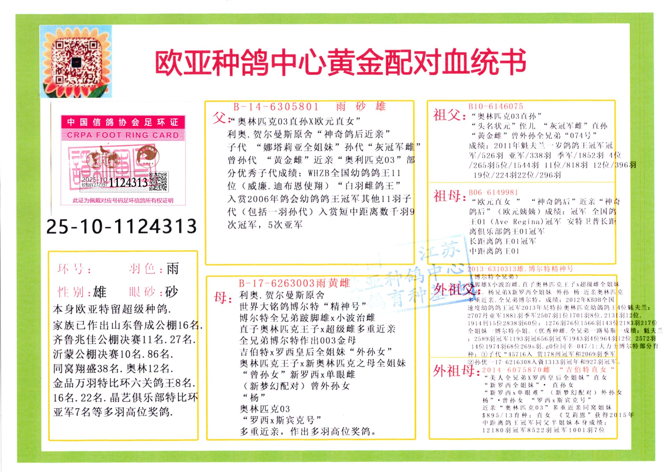 24年秋南京特比環(huán)歐亞榮獲大團(tuán)體冠軍.小團(tuán)體冠軍551公里大特比13名.14名.16名.19名.20名.21名.24名.26名.27名.28名.42名.52名.54名.57名.65名.66名.68名.70名.71名.72名.74名.76名.80名.82名.83名.84名.85名.86名.90名.92名.110名.116名.121名.122名.128名.131名.158名.161名.164名.165名.166名.172名.174名.177名.182名.195名.196名.201名.205名.208名.210名.216名.253名.269名.275名.276名.294名.296名.299名,,24年秋云南天南銅都公棚決賽415名.天南銅都小棚決賽409名.云南玉活公棚決賽102名.490名.團(tuán)體32名上籠二羽進(jìn)二羽,天南銅都大棚506公里決賽445名。熱烈祝賀河北省巨鹿縣李蘭生老師用歐亞泰山號(hào)血系連續(xù)十一年奪冠軍,河北省國(guó)家賽冠軍.全國(guó)季軍等多次前十名高位,揚(yáng)州王軍王總用歐亞利奧24年春季獲山東翔宇公棚決賽33名蓋比53名。南京劉正龍劉總用歐亞蓋比獲得24年秋山東濰坊國(guó)際公棚決賽42名.精英賽30名.三關(guān)鴿王71名.決賽86名.加站賽16名.南京市特比環(huán)A組鴿王9名.B組鴿王5名.6名.C組鴿王5名.精英賽冠軍4名.技能賽A組冠軍4名.5名.秦淮區(qū)特比環(huán)榮獲15名.46名.48名.87名。四川西昌徐亮徐總用歐亞利奧獲得涼山州聚友決賽177名.第二關(guān)亞軍雙關(guān)鴿王19名.三關(guān)鴿王105名.云南豪庭公棚決賽603名。熱烈祝賀24年四川重慶翔園鴿舍用歐亞泰山號(hào)榮獲春季400公里冠軍.秋季500公里冠軍,河北王總用詹森X利奧獲得千羽千翔公棚400公里冠軍,廣東蔡楷煥榮獲24年秋愛(ài)好者 賽鴿俱樂(lè)部三關(guān)鴿王季軍.一關(guān)420公里99名.二關(guān)450公里11名.三關(guān)520公里32名.單關(guān)季軍.7名.12名,江西李衛(wèi)興榮獲貴州紅楓公棚8名.共翔俱樂(lè)部寄養(yǎng)棚四關(guān)綜合鴿王30名.一關(guān)400公里78名.二關(guān)500公里55名.三關(guān)520公里37名.四關(guān)500公里57名.同父母獲公棚18名.雷鳴獲得武漢黃浦育翔中心冠軍,四川陳文獲得四川明鴻俱樂(lè)部300公里夢(mèng)幻2名.3名.4名.9名.10名.13名.14名.15名.31名.34名.40名.41名.42名.43名.69名.71名.72名.73名.74名.94名.95名.97名.98名.99名.419公里決賽榮獲總冠軍7名.總共歸巢9羽,四川徐亮獲豪庭決賽603名,山西鄭勇獲得山西泰鑫公棚決賽255名詹森紅狐,熱烈祝賀馬總獲得開(kāi)爾(飛躍隊(duì))決賽9名獲獎(jiǎng)金1310000萬(wàn)元.第一關(guān)52名,天津津福資賽180公里96名.獲獎(jiǎng)金429543萬(wàn)元,歐亞支持全國(guó)鴿友24年秋多人報(bào)喜 祝大家取得更好成績(jī),給歐亞報(bào)喜鴿友歐亞決定給每人贈(zèng)送一羽超級(jí)種鴿。歐亞俱樂(lè)部特比環(huán)多關(guān)鴿王成績(jī):15年秋淮安特比環(huán)黑色星期一全會(huì)上籠9700多羽,當(dāng)天無(wú)鴿歸巢,第二天全會(huì)歸巢357羽,本舍歸巢158羽.前十名八羽.前一百名歸巢57羽,16年春季獲五關(guān)鴿王總冠軍,總亞軍四名.六名.七名.九名.十名.晶藝俱樂(lè)部520公里冠亞季軍5名.6名.7名.9名.11名等,火車(chē)頭冠軍.季軍6名.8名.9名.10名,16年秋晶藝俱樂(lè)部特比環(huán)520公里亞軍.季軍4名.6名.7名.9名,15年春南京白下特比環(huán)冠軍.亞軍.季軍6名.7名.8名.9名.10名.指定鴿A B組獲得冠軍.亞軍.季軍4名.5名.,17年淮安特比環(huán)亞軍.4名.5名.7名.8名.10名.六關(guān)鴿王總冠軍.4名.6名.9名.10名,寄養(yǎng)棚宿遷劉總20羽特比環(huán)獲冠軍.季軍.4名.7名.8名.9名等。18年榮獲萬(wàn)羽特比環(huán)六關(guān)鴿王總冠軍.總亞軍.總季軍.6名.8名.十名.單關(guān)四羽冠軍.二羽亞軍.四羽季軍.前十名27羽。19年秋萬(wàn)羽特比環(huán)六關(guān)鴿王總亞軍.總季軍.5名.8名等,單關(guān)二羽冠軍.三羽亞軍.一羽季軍前十名31羽。20年秋淮安市鴿會(huì)四關(guān)特比環(huán)大賽風(fēng)雨無(wú)阻鴿王亞軍.鴿王六名,金品俱樂(lè)部萬(wàn)羽特比環(huán)六關(guān)鴿王總冠軍,總亞軍.四名.五名.六名.七名.八名.十名.前二百名鴿王35羽,單關(guān)冠亞季軍前十名四十多羽,火車(chē)頭五關(guān)鴿王季軍.六名.八名.前二百名鴿王十七羽。20年春榮獲淮安五區(qū)一市四關(guān)鴿王總冠軍.亞軍.四名.八名.九名。21年秋榮獲金品萬(wàn)羽特比環(huán)大賽六關(guān)鴿王總亞軍.總季軍.四名.七名.九名.十名.單關(guān)冠亞軍季軍前十名三十多羽;疖(chē)頭協(xié)會(huì)鴿王六名.七名.十名.單關(guān)前十名十七羽。22年秋榮獲鴿王總冠軍.總亞軍.5名.7名.8名.9名.11名.單關(guān)冠亞季軍前十名三十多羽,第一關(guān)單關(guān)前二百名四十多羽,第二關(guān)前二百名三十多羽,第三關(guān)前二百名四十多羽,第四關(guān)前二百名四十多羽,第五關(guān)前一百名53羽。23年秋榮獲鴿王季軍.五名.八名.十名.13名.17名.20名.27名等多羽鴿王.單關(guān)前十名二十多羽。公棚.寄養(yǎng)棚部分成績(jī):16年秋寧夏黃河公棚總冠軍電腦戈馬力指定通炮冠軍,17年送八羽參賽獲得鴿王八名進(jìn)獎(jiǎng)四名,支持韓總榮獲八名。支持鴿友榮獲寧夏中衛(wèi)公棚決賽總冠軍.精英賽冠軍,支持18年寧夏黃河公棚決賽冠軍詹森X泰山。安徽鼎博寄養(yǎng)棚院內(nèi)外四關(guān)鴿王總冠軍.鴿王十七名.三十七名同窩,鴿王39名.42名.58名.67名。18年山東公棚預(yù)賽冠軍.決賽65名.送八羽進(jìn)獎(jiǎng)五羽.指定獲奔馳汽車(chē)一輛。支持鴿友獲得云南藍(lán)云公棚冠軍.蓋比X佛卡門(mén)。支持