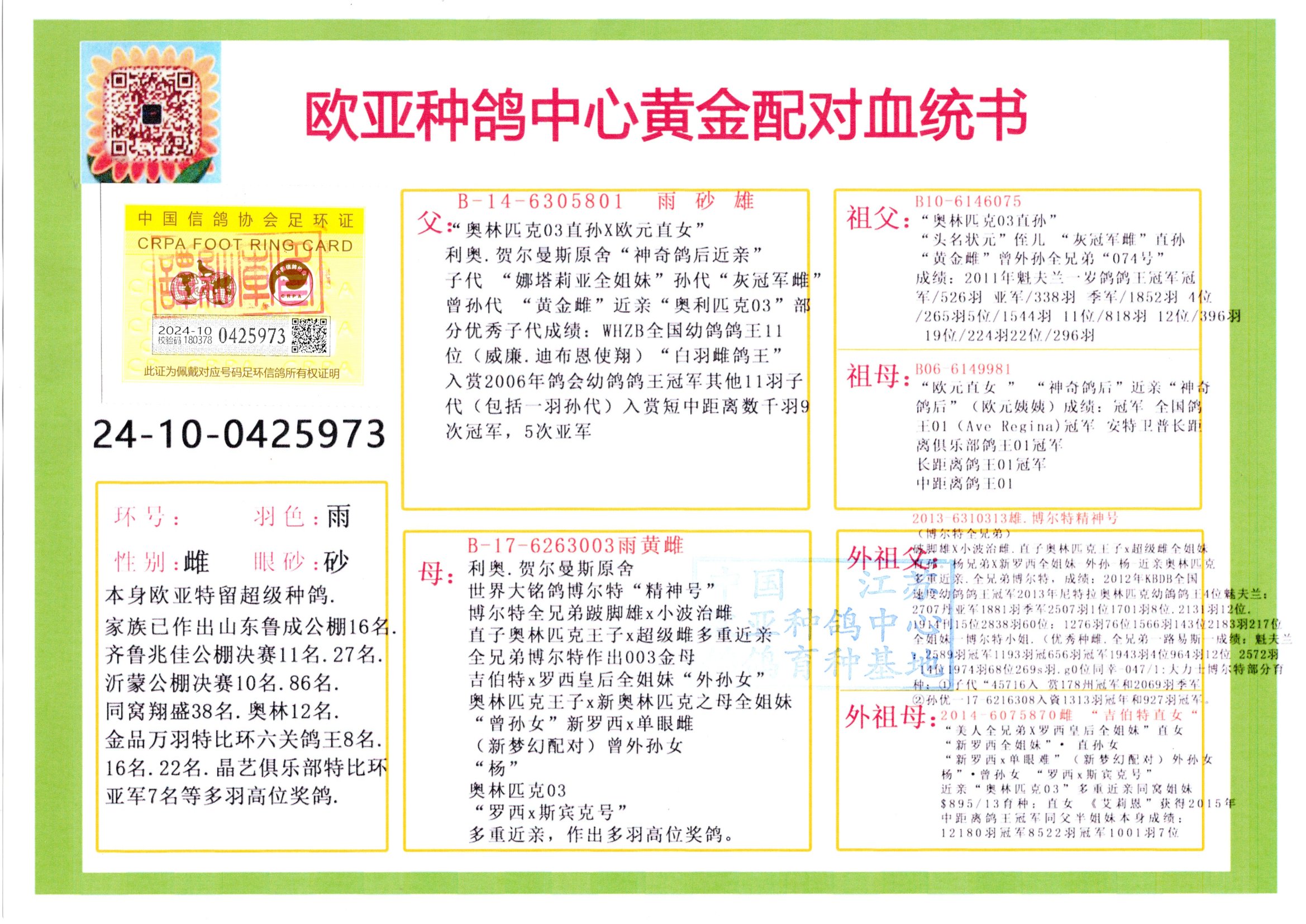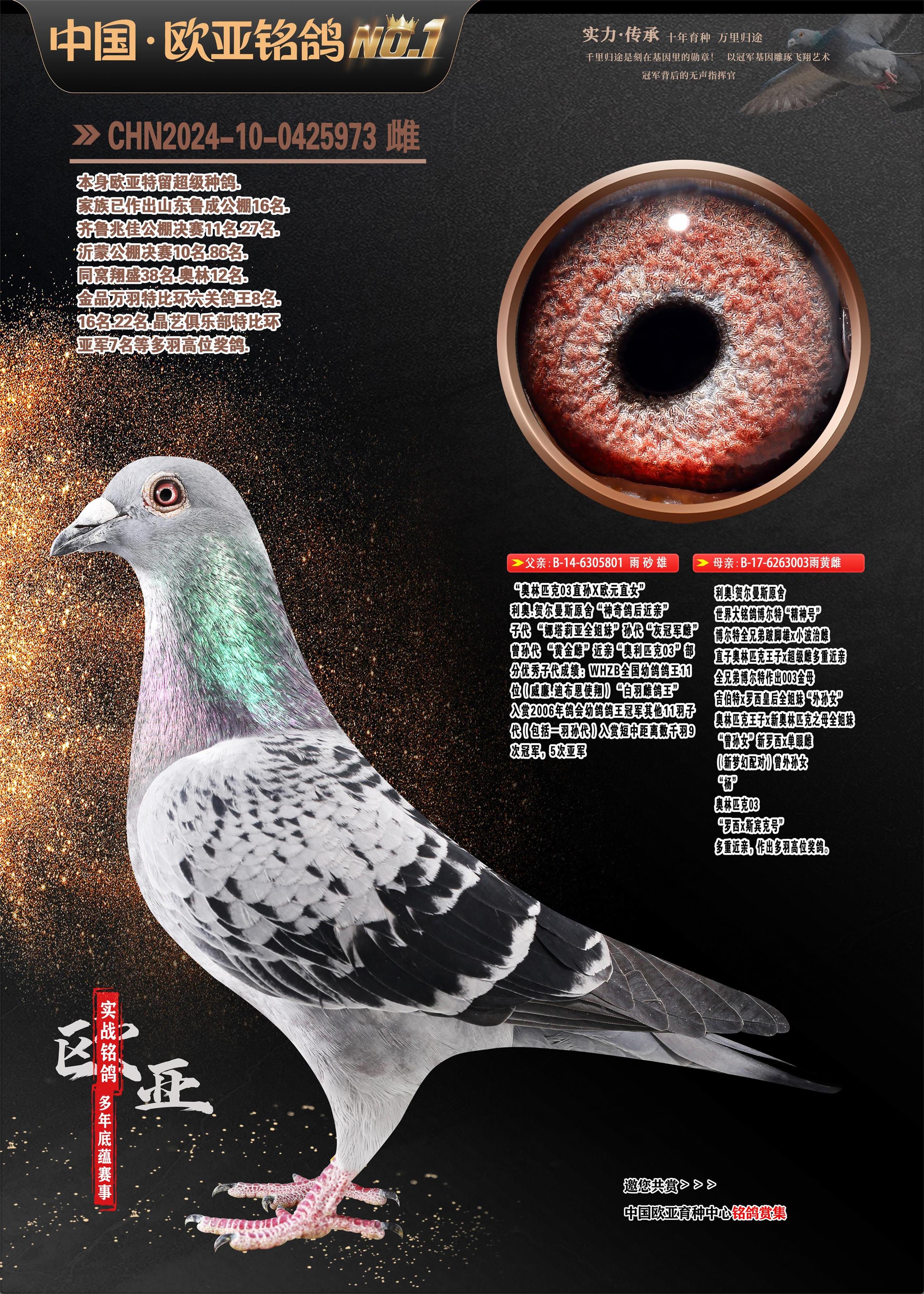 24年秋南京特比環(huán)歐亞榮獲大團體冠軍.小團體冠軍551公里大特比13名.14名.16名.19名.20名.21名.24名.26名.27名.28名.42名.52名.54名.57名.65名.66名.68名.70名.71名.72名.74名.76名.80名.82名.83名.84名.85名.86名.90名.92名.110名.116名.121名.122名.128名.131名.158名.161名.164名.165名.166名.172名.174名.177名.182名.195名.196名.201名.205名.208名.210名.216名.253名.269名.275名.276名.294名.296名.299名,,24年秋云南天南銅都公棚決賽415名.天南銅都小棚決賽409名.云南玉活公棚決賽102名.490名.團體32名上籠二羽進二羽,天南銅都大棚506公里決賽445名。熱烈祝賀河北省巨鹿縣李蘭生老師用歐亞泰山號血系連續(xù)十一年奪冠軍,河北省國家賽冠軍.全國季軍等多次前十名高位,揚州王軍王總用歐亞利奧24年春季獲山東翔宇公棚決賽33名蓋比53名。南京劉正龍劉總用歐亞蓋比獲得24年秋山東濰坊國際公棚決賽42名.精英賽30名.三關(guān)鴿王71名.決賽86名.加站賽16名.南京市特比環(huán)A組鴿王9名.B組鴿王5名.6名.C組鴿王5名.精英賽冠軍4名.技能賽A組冠軍4名.5名.秦淮區(qū)特比環(huán)榮獲15名.46名.48名.87名。四川西昌徐亮徐總用歐亞利奧獲得涼山州聚友決賽177名.第二關(guān)亞軍雙關(guān)鴿王19名.三關(guān)鴿王105名.云南豪庭公棚決賽603名。熱烈祝賀24年四川重慶翔園鴿舍用歐亞泰山號榮獲春季400公里冠軍.秋季500公里冠軍,河北王總用詹森X利奧獲得千羽千翔公棚400公里冠軍,廣東蔡楷煥榮獲24年秋愛好者 賽鴿俱樂部三關(guān)鴿王季軍.一關(guān)420公里99名.二關(guān)450公里11名.三關(guān)520公里32名.單關(guān)季軍.7名.12名,江西李衛(wèi)興榮獲貴州紅楓公棚8名.共翔俱樂部寄養(yǎng)棚四關(guān)綜合鴿王30名.一關(guān)400公里78名.二關(guān)500公里55名.三關(guān)520公里37名.四關(guān)500公里57名.同父母獲公棚18名.雷鳴獲得武漢黃浦育翔中心冠軍,四川陳文獲得四川明鴻俱樂部300公里夢幻2名.3名.4名.9名.10名.13名.14名.15名.31名.34名.40名.41名.42名.43名.69名.71名.72名.73名.74名.94名.95名.97名.98名.99名.419公里決賽榮獲總冠軍7名.總共歸巢9羽,四川徐亮獲豪庭決賽603名,山西鄭勇獲得山西泰鑫公棚決賽255名詹森紅狐,熱烈祝賀馬總獲得開爾(飛躍隊)決賽9名獲獎金1310000萬元.第一關(guān)52名,天津津福資賽180公里96名.獲獎金429543萬元,歐亞支持全國鴿友24年秋多人報喜 祝大家取得更好成績,給歐亞報喜鴿友歐亞決定給每人贈送一羽超級種鴿。歐亞俱樂部特比環(huán)多關(guān)鴿王成績:15年秋淮安特比環(huán)黑色星期一全會上籠9700多羽,當(dāng)天無鴿歸巢,第二天全會歸巢357羽,本舍歸巢158羽.前十名八羽.前一百名歸巢57羽,16年春季獲五關(guān)鴿王總冠軍,總亞軍四名.六名.七名.九名.十名.晶藝俱樂部520公里冠亞季軍5名.6名.7名.9名.11名等,火車頭冠軍.季軍6名.8名.9名.10名,16年秋晶藝俱樂部特比環(huán)520公里亞軍.季軍4名.6名.7名.9名,15年春南京白下特比環(huán)冠軍.亞軍.季軍6名.7名.8名.9名.10名.指定鴿A B組獲得冠軍.亞軍.季軍4名.5名.,17年淮安特比環(huán)亞軍.4名.5名.7名.8名.10名.六關(guān)鴿王總冠軍.4名.6名.9名.10名,寄養(yǎng)棚宿遷劉總20羽特比環(huán)獲冠軍.季軍.4名.7名.8名.9名等。18年榮獲萬羽特比環(huán)六關(guān)鴿王總冠軍.總亞軍.總季軍.6名.8名.十名.單關(guān)四羽冠軍.二羽亞軍.四羽季軍.前十名27羽。19年秋萬羽特比環(huán)六關(guān)鴿王總亞軍.總季軍.5名.8名等,單關(guān)二羽冠軍.三羽亞軍.一羽季軍前十名31羽。20年秋淮安市鴿會四關(guān)特比環(huán)大賽風(fēng)雨無阻鴿王亞軍.鴿王六名,金品俱樂部萬羽特比環(huán)六關(guān)鴿王總冠軍,總亞軍.四名.五名.六名.七名.八名.十名.前二百名鴿王35羽,單關(guān)冠亞季軍前十名四十多羽,火車頭五關(guān)鴿王季軍.六名.八名.前二百名鴿王十七羽。20年春榮獲淮安五區(qū)一市四關(guān)鴿王總冠軍.亞軍.四名.八名.九名。21年秋榮獲金品萬羽特比環(huán)大賽六關(guān)鴿王總亞軍.總季軍.四名.七名.九名.十名.單關(guān)冠亞軍季軍前十名三十多羽。火車頭協(xié)會鴿王六名.七名.十名.單關(guān)前十名十七羽。22年秋榮獲鴿王總冠軍.總亞軍.5名.7名.8名.9名.11名.單關(guān)冠亞季軍前十名三十多羽,第一關(guān)單關(guān)前二百名四十多羽,第二關(guān)前二百名三十多羽,第三關(guān)前二百名四十多羽,第四關(guān)前二百名四十多羽,第五關(guān)前一百名53羽。23年秋榮獲鴿王季軍.五名.八名.十名.13名.17名.20名.27名等多羽鴿王.單關(guān)前十名二十多羽。公棚.寄養(yǎng)棚部分成績:16年秋寧夏黃河公棚總冠軍電腦戈馬力指定通炮冠軍,17年送八羽參賽獲得鴿王八名進獎四名,支持韓總榮獲八名。支持鴿友榮獲寧夏中衛(wèi)公棚決賽總冠軍.精英賽冠軍,支持18年寧夏黃河公棚決賽冠軍詹森X泰山。安徽鼎博寄養(yǎng)棚院內(nèi)外四關(guān)鴿王總冠軍.鴿王十七名.三十七名同窩,鴿王39名.42名.58名.67名。18年山東公棚預(yù)賽冠軍.決賽65名.送八羽進獎五羽.指定獲奔馳汽車一輛。支持鴿友獲得云南藍云公棚冠軍.蓋比X佛卡門。支持鴿友榮獲云南銀集公棚決賽冠軍 詹森427X520血系 速度賽6700羽冠軍。17年榮獲金馬俱樂部寄養(yǎng)棚四關(guān)鴿王總冠軍.季軍.六名.八名.第一關(guān)冠軍.亞軍.季軍四名.七名.十一名.金牌教練獎。支持鴿友18年北京費翔公棚預(yù)賽九名電