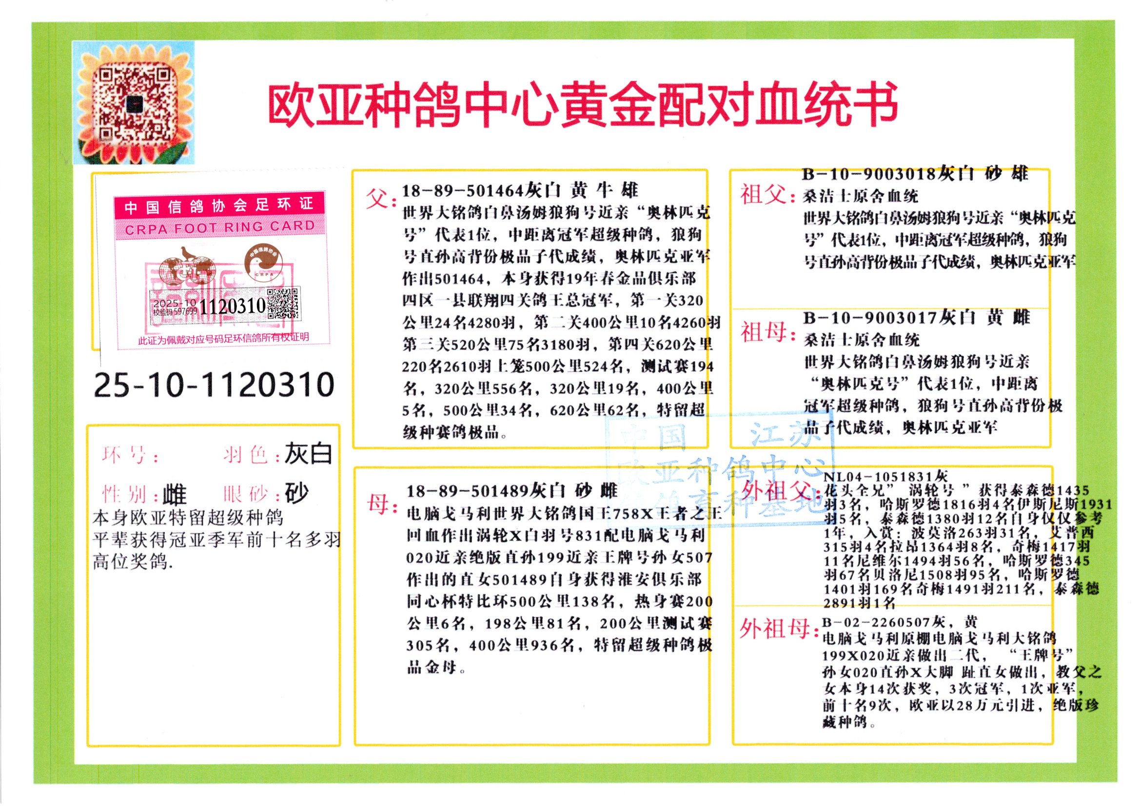 24年秋南京特比環(huán)歐亞榮獲大團體冠軍.小團體冠軍551公里大特比13名.14名.16名.19名.20名.21名.24名.26名.27名.28名.42名.52名.54名.57名.65名.66名.68名.70名.71名.72名.74名.76名.80名.82名.83名.84名.85名.86名.90名.92名.110名.116名.121名.122名.128名.131名.158名.161名.164名.165名.166名.172名.174名.177名.182名.195名.196名.201名.205名.208名.210名.216名.253名.269名.275名.276名.294名.296名.299名,,24年秋云南天南銅都公棚決賽415名.天南銅都小棚決賽409名.云南玉活公棚決賽102名.490名.團體32名上籠二羽進二羽,天南銅都大棚506公里決賽445名。熱烈祝賀河北省巨鹿縣李蘭生老師用歐亞泰山號血系連續(xù)十一年奪冠軍,河北省國家賽冠軍.全國季軍等多次前十名高位,揚州王軍王總用歐亞利奧24年春季獲山東翔宇公棚決賽33名蓋比53名。南京劉正龍劉總用歐亞蓋比獲得24年秋山東濰坊國際公棚決賽42名.精英賽30名.三關(guān)鴿王71名.決賽86名.加站賽16名.南京市特比環(huán)A組鴿王9名.B組鴿王5名.6名.C組鴿王5名.精英賽冠軍4名.技能賽A組冠軍4名.5名.秦淮區(qū)特比環(huán)榮獲15名.46名.48名.87名。四川西昌徐亮徐總用歐亞利奧獲得涼山州聚友決賽177名.第二關(guān)亞軍雙關(guān)鴿王19名.三關(guān)鴿王105名.云南豪庭公棚決賽603名。熱烈祝賀24年四川重慶翔園鴿舍用歐亞泰山號榮獲春季400公里冠軍.秋季500公里冠軍,河北王總用詹森X利奧獲得千羽千翔公棚400公里冠軍,廣東蔡楷煥榮獲24年秋愛好者 賽鴿俱樂部三關(guān)鴿王季軍.一關(guān)420公里99名.二關(guān)450公里11名.三關(guān)520公里32名.單關(guān)季軍.7名.12名,江西李衛(wèi)興榮獲貴州紅楓公棚8名.共翔俱樂部寄養(yǎng)棚四關(guān)綜合鴿王30名.一關(guān)400公里78名.二關(guān)500公里55名.三關(guān)520公里37名.四關(guān)500公里57名.同父母獲公棚18名.雷鳴獲得武漢黃浦育翔中心冠軍,四川陳文獲得四川明鴻俱樂部300公里夢幻2名.3名.4名.9名.10名.13名.14名.15名.31名.34名.40名.41名.42名.43名.69名.71名.72名.73名.74名.94名.95名.97名.98名.99名.419公里決賽榮獲總冠軍7名.總共歸巢9羽,四川徐亮獲豪庭決賽603名,山西鄭勇獲得山西泰鑫公棚決賽255名詹森紅狐,熱烈祝賀馬總獲得開爾(飛躍隊)決賽9名獲獎金1310000萬元.第一關(guān)52名,天津津福資賽180公里96名.獲獎金429543萬元,歐亞支持全國鴿友24年秋多人報喜 祝大家取得更好成績,給歐亞報喜鴿友歐亞決定給每人贈送一羽超級種鴿。歐亞俱樂部特比環(huán)多關(guān)鴿王成績:15年秋淮安特比環(huán)黑色星期一全會上籠9700多羽,當天無鴿歸巢,第二天全會歸巢357羽,本舍歸巢158羽.前十名八羽.前一百名歸巢57羽,16年春季獲五關(guān)鴿王總冠軍,總亞軍四名.六名.七名.九名.十名.晶藝俱樂部520公里冠亞季軍5名.6名.7名.9名.11名等,火車頭冠軍.季軍6名.8名.9名.10名,16年秋晶藝俱樂部特比環(huán)520公里亞軍.季軍4名.6名.7名.9名,15年春南京白下特比環(huán)冠軍.亞軍.季軍6名.7名.8名.9名.10名.指定鴿A B組獲得冠軍.亞軍.季軍4名.5名.,17年淮安特比環(huán)亞軍.4名.5名.7名.8名.10名.六關(guān)鴿王總冠軍.4名.6名.9名.10名,寄養(yǎng)棚宿遷劉總20羽特比環(huán)獲冠軍.季軍.4名.7名.8名.9名等。18年榮獲萬羽特比環(huán)六關(guān)鴿王總冠軍.總亞軍.總季軍.6名.8名.十名.單關(guān)四羽冠軍.二羽亞軍.四羽季軍.前十名27羽。19年秋萬羽特比環(huán)六關(guān)鴿王總亞軍.總季軍.5名.8名等,單關(guān)二羽冠軍.三羽亞軍.一羽季軍前十名31羽。20年秋淮安市鴿會四關(guān)特比環(huán)大賽風(fēng)雨無阻鴿王亞軍.鴿王六名,金品俱樂部萬羽特比環(huán)六關(guān)鴿王總冠軍,總亞軍.四名.五名.六名.七名.八名.十名.前二百名鴿王35羽,單關(guān)冠亞季軍前十名四十多羽,火車頭五關(guān)鴿王季軍.六名.八名.前二百名鴿王十七羽。20年春榮獲淮安五區(qū)一市四關(guān)鴿王總冠軍.亞軍.四名.八名.九名。21年秋榮獲金品萬羽特比環(huán)大賽六關(guān)鴿王總亞軍.總季軍.四名.七名.九名.十名.單關(guān)冠亞軍季軍前十名三十多羽;疖囶^協(xié)會鴿王六名.七名.十名.單關(guān)前十名十七羽。22年秋榮獲鴿王總冠軍.總亞軍.5名.7名.8名.9名.11名.單關(guān)冠亞季軍前十名三十多羽,第一關(guān)單關(guān)前二百名四十多羽,第二關(guān)前二百名三十多羽,第三關(guān)前二百名四十多羽,第四關(guān)前二百名四十多羽,第五關(guān)前一百名53羽。23年秋榮獲鴿王季軍.五名.八名.十名.13名.17名.20名.27名等多羽鴿王.單關(guān)前十名二十多羽。公棚.寄養(yǎng)棚部分成績:16年秋寧夏黃河公棚總冠軍電腦戈馬力指定通炮冠軍,17年送八羽參賽獲得鴿王八名進獎四名,支持韓總榮獲八名。支持鴿友榮獲寧夏中衛(wèi)公棚決賽總冠軍.精英賽冠軍,支持18年寧夏黃河公棚決賽冠軍詹森X泰山。安徽鼎博寄養(yǎng)棚院內(nèi)外四關(guān)鴿王總冠軍.鴿王十七名.三十七名同窩,鴿王39名.42名.58名.67名。18年山東公棚預(yù)賽冠軍.決賽65名.送八羽進獎五羽.指定獲奔馳汽車一輛。支持鴿友獲得云南藍云公棚冠軍.蓋比X佛卡門。支持鴿友榮獲云南銀集公棚決賽冠軍 詹森427X520血系 速度賽6700羽冠軍。17年榮獲金馬俱樂部寄養(yǎng)棚四關(guān)鴿王總冠軍.季軍.六名.八名.第一關(guān)冠軍.亞軍.季軍四名.七名.十一名.金牌教練獎。支持鴿友18年北京費翔公棚預(yù)賽九名電腦X桑杰士