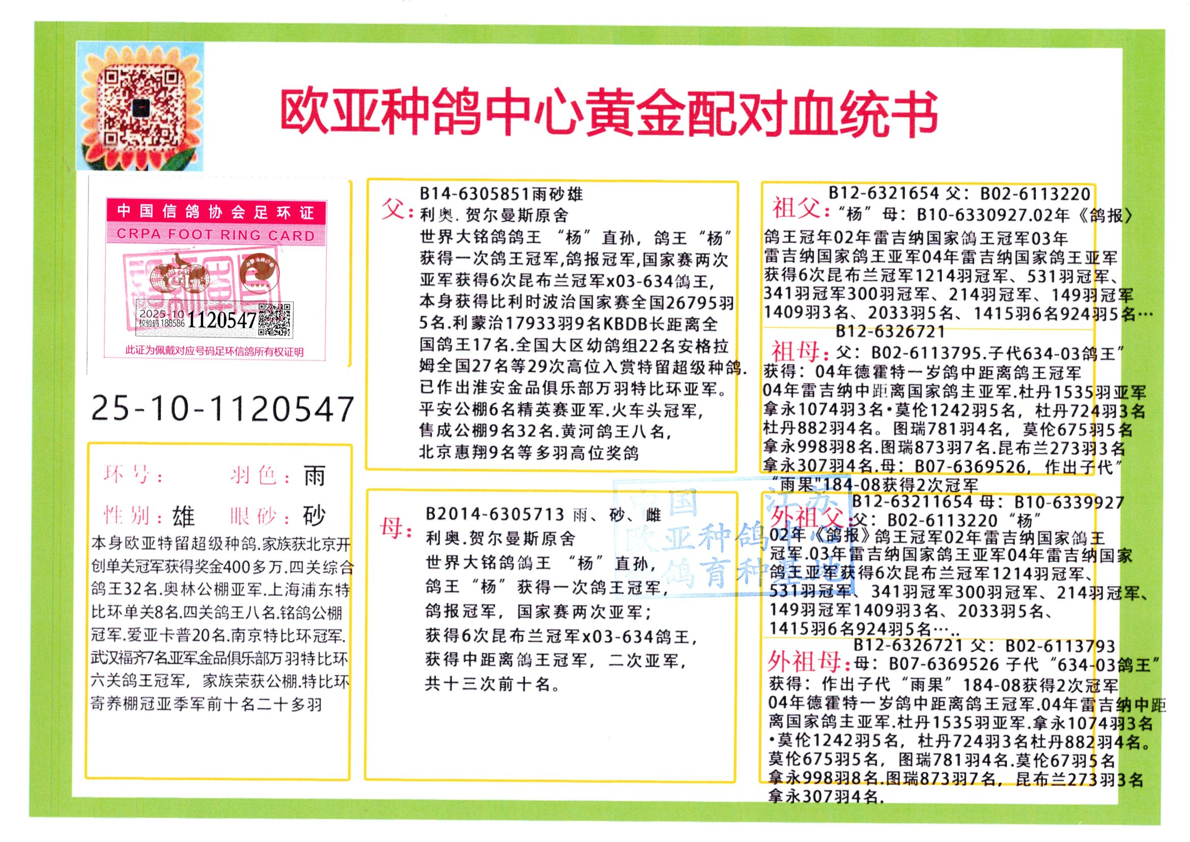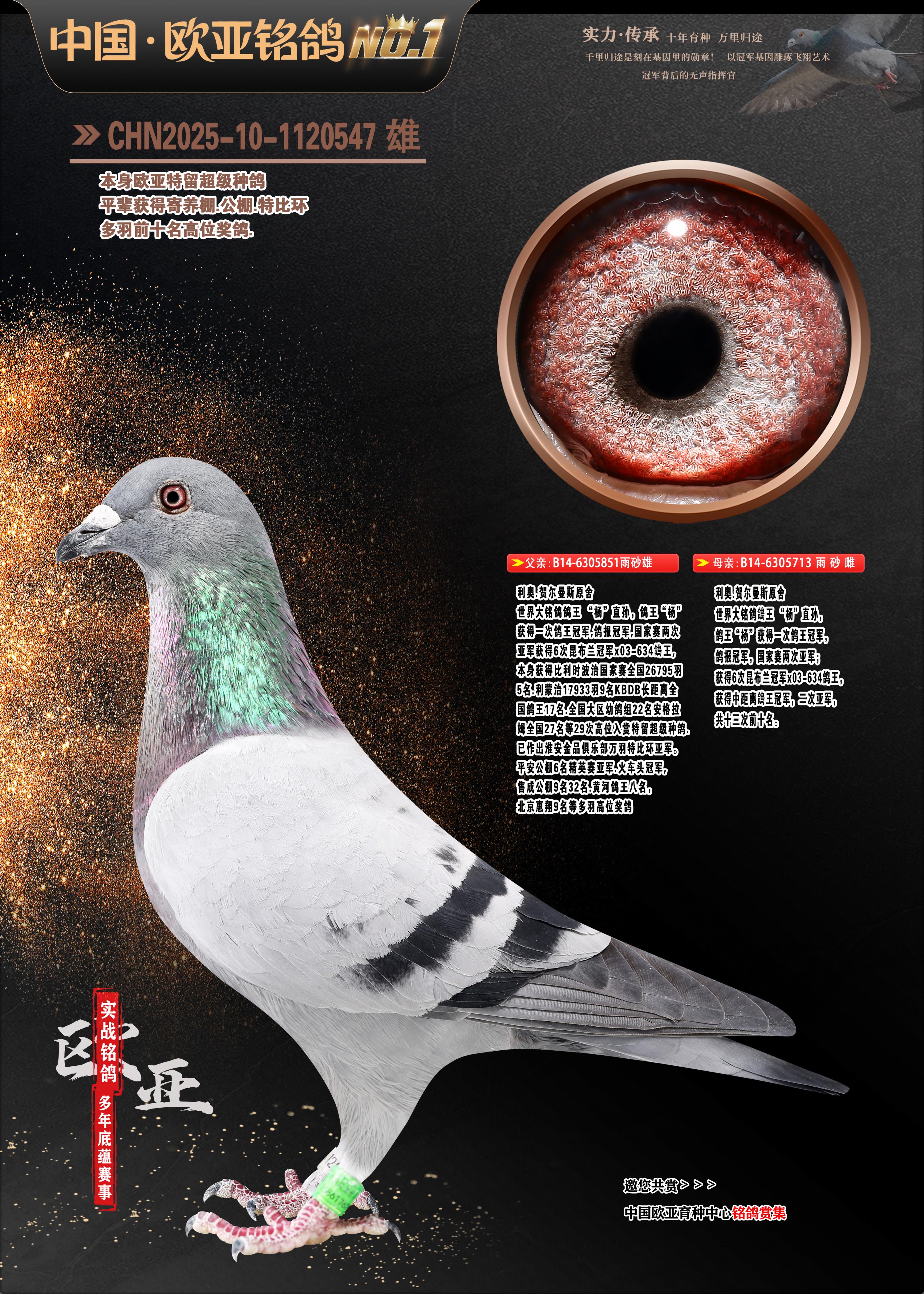 24年秋南京特比環(huán)歐亞榮獲大團(tuán)體冠軍.小團(tuán)體冠軍551公里大特比13名.14名.16名.19名.20名.21名.24名.26名.27名.28名.42名.52名.54名.57名.65名.66名.68名.70名.71名.72名.74名.76名.80名.82名.83名.84名.85名.86名.90名.92名.110名.116名.121名.122名.128名.131名.158名.161名.164名.165名.166名.172名.174名.177名.182名.195名.196名.201名.205名.208名.210名.216名.253名.269名.275名.276名.294名.296名.299名,,24年秋云南天南銅都公棚決賽415名.天南銅都小棚決賽409名.云南玉活公棚決賽102名.490名.團(tuán)體32名上籠二羽進(jìn)二羽,天南銅都大棚506公里決賽445名。熱烈祝賀河北省巨鹿縣李蘭生老師用歐亞泰山號血系連續(xù)十一年奪冠軍,河北省國家賽冠軍.全國季軍等多次前十名高位,揚(yáng)州王軍王總用歐亞利奧24年春季獲山東翔宇公棚決賽33名蓋比53名。南京劉正龍劉總用歐亞蓋比獲得24年秋山東濰坊國際公棚決賽42名.精英賽30名.三關(guān)鴿王71名.決賽86名.加站賽16名.南京市特比環(huán)A組鴿王9名.B組鴿王5名.6名.C組鴿王5名.精英賽冠軍4名.技能賽A組冠軍4名.5名.秦淮區(qū)特比環(huán)榮獲15名.46名.48名.87名。四川西昌徐亮徐總用歐亞利奧獲得涼山州聚友決賽177名.第二關(guān)亞軍雙關(guān)鴿王19名.三關(guān)鴿王105名.云南豪庭公棚決賽603名。熱烈祝賀24年四川重慶翔園鴿舍用歐亞泰山號榮獲春季400公里冠軍.秋季500公里冠軍,河北王總用詹森X利奧獲得千羽千翔公棚400公里冠軍,廣東蔡楷煥榮獲24年秋愛好者 賽鴿俱樂部三關(guān)鴿王季軍.一關(guān)420公里99名.二關(guān)450公里11名.三關(guān)520公里32名.單關(guān)季軍.7名.12名,江西李衛(wèi)興榮獲貴州紅楓公棚8名.共翔俱樂部寄養(yǎng)棚四關(guān)綜合鴿王30名.一關(guān)400公里78名.二關(guān)500公里55名.三關(guān)520公里37名.四關(guān)500公里57名.同父母獲公棚18名.雷鳴獲得武漢黃浦育翔中心冠軍,四川陳文獲得四川明鴻俱樂部300公里夢幻2名.3名.4名.9名.10名.13名.14名.15名.31名.34名.40名.41名.42名.43名.69名.71名.72名.73名.74名.94名.95名.97名.98名.99名.419公里決賽榮獲總冠軍7名.總共歸巢9羽,四川徐亮獲豪庭決賽603名,山西鄭勇獲得山西泰鑫公棚決賽255名詹森紅狐,熱烈祝賀馬總獲得開爾(飛躍隊)決賽9名獲獎金1310000萬元.第一關(guān)52名,天津津福資賽180公里96名.獲獎金429543萬元,歐亞支持全國鴿友24年秋多人報喜 祝大家取得更好成績,給歐亞報喜鴿友歐亞決定給每人贈送一羽超級種鴿。歐亞俱樂部特比環(huán)多關(guān)鴿王成績:15年秋淮安特比環(huán)黑色星期一全會上籠9700多羽,當(dāng)天無鴿歸巢,第二天全會歸巢357羽,本舍歸巢158羽.前十名八羽.前一百名歸巢57羽,16年春季獲五關(guān)鴿王總冠軍,總亞軍四名.六名.七名.九名.十名.晶藝俱樂部520公里冠亞季軍5名.6名.7名.9名.11名等,火車頭冠軍.季軍6名.8名.9名.10名,16年秋晶藝俱樂部特比環(huán)520公里亞軍.季軍4名.6名.7名.9名,15年春南京白下特比環(huán)冠軍.亞軍.季軍6名.7名.8名.9名.10名.指定鴿A B組獲得冠軍.亞軍.季軍4名.5名.,17年淮安特比環(huán)亞軍.4名.5名.7名.8名.10名.六關(guān)鴿王總冠軍.4名.6名.9名.10名,寄養(yǎng)棚宿遷劉總20羽特比環(huán)獲冠軍.季軍.4名.7名.8名.9名等。18年榮獲萬羽特比環(huán)六關(guān)鴿王總冠軍.總亞軍.總季軍.6名.8名.十名.單關(guān)四羽冠軍.二羽亞軍.四羽季軍.前十名27羽。19年秋萬羽特比環(huán)六關(guān)鴿王總亞軍.總季軍.5名.8名等,單關(guān)二羽冠軍.三羽亞軍.一羽季軍前十名31羽。20年秋淮安市鴿會四關(guān)特比環(huán)大賽風(fēng)雨無阻鴿王亞軍.鴿王六名,金品俱樂部萬羽特比環(huán)六關(guān)鴿王總冠軍,總亞軍.四名.五名.六名.七名.八名.十名.前二百名鴿王35羽,單關(guān)冠亞季軍前十名四十多羽,火車頭五關(guān)鴿王季軍.六名.八名.前二百名鴿王十七羽。20年春榮獲淮安五區(qū)一市四關(guān)鴿王總冠軍.亞軍.四名.八名.九名。21年秋榮獲金品萬羽特比環(huán)大賽六關(guān)鴿王總亞軍.總季軍.四名.七名.九名.十名.單關(guān)冠亞軍季軍前十名三十多羽。火車頭協(xié)會鴿王六名.七名.十名.單關(guān)前十名十七羽。22年秋榮獲鴿王總冠軍.總亞軍.5名.7名.8名.9名.11名.單關(guān)冠亞季軍前十名三十多羽,第一關(guān)單關(guān)前二百名四十多羽,第二關(guān)前二百名三十多羽,第三關(guān)前二百名四十多羽,第四關(guān)前二百名四十多羽,第五關(guān)前一百名53羽。23年秋榮獲鴿王季軍.五名.八名.十名.13名.17名.20名.27名等多羽鴿王.單關(guān)前十名二十多羽。公棚.寄養(yǎng)棚部分成績:16年秋寧夏黃河公棚總冠軍電腦戈馬力指定通炮冠軍,17年送八羽參賽獲得鴿王八名進(jìn)獎四名,支持韓總榮獲八名。支持鴿友榮獲寧夏中衛(wèi)公棚決賽總冠軍.精英賽冠軍,支持18年寧夏黃河公棚決賽冠軍詹森X泰山。安徽鼎博寄養(yǎng)棚院內(nèi)外四關(guān)鴿王總冠軍.鴿王十七名.三十七名同窩,鴿王39名.42名.58名.67名。18年山東公棚預(yù)賽冠軍.決賽65名.送八羽進(jìn)獎五羽.指定獲奔馳汽車一輛。支持鴿友獲得云南藍(lán)云公棚冠軍.蓋比X佛卡門。支持鴿友榮獲云南銀集公棚決賽冠軍 詹森427X520血系 速度賽6700羽冠軍。17年榮獲金馬俱樂部寄養(yǎng)棚四關(guān)鴿王總冠軍.季軍.六名.八名.第一關(guān)冠軍.亞軍.季軍四名.七名.十一名.金牌教練獎。支