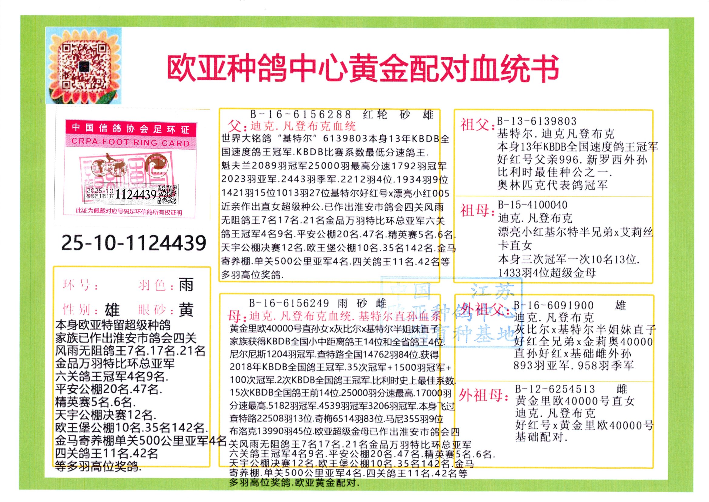 24年秋南京特比環(huán)歐亞榮獲大團(tuán)體冠軍.小團(tuán)體冠軍551公里大特比13名.14名.16名.19名.20名.21名.24名.26名.27名.28名.42名.52名.54名.57名.65名.66名.68名.70名.71名.72名.74名.76名.80名.82名.83名.84名.85名.86名.90名.92名.110名.116名.121名.122名.128名.131名.158名.161名.164名.165名.166名.172名.174名.177名.182名.195名.196名.201名.205名.208名.210名.216名.253名.269名.275名.276名.294名.296名.299名,,24年秋云南天南銅都公棚決賽415名.天南銅都小棚決賽409名.云南玉活公棚決賽102名.490名.團(tuán)體32名上籠二羽進(jìn)二羽,天南銅都大棚506公里決賽445名。熱烈祝賀河北省巨鹿縣李蘭生老師用歐亞泰山號血系連續(xù)十一年奪冠軍,河北省國家賽冠軍.全國季軍等多次前十名高位,揚(yáng)州王軍王總用歐亞利奧24年春季獲山東翔宇公棚決賽33名蓋比53名。南京劉正龍劉總用歐亞蓋比獲得24年秋山東濰坊國際公棚決賽42名.精英賽30名.三關(guān)鴿王71名.決賽86名.加站賽16名.南京市特比環(huán)A組鴿王9名.B組鴿王5名.6名.C組鴿王5名.精英賽冠軍4名.技能賽A組冠軍4名.5名.秦淮區(qū)特比環(huán)榮獲15名.46名.48名.87名。四川西昌徐亮徐總用歐亞利奧獲得涼山州聚友決賽177名.第二關(guān)亞軍雙關(guān)鴿王19名.三關(guān)鴿王105名.云南豪庭公棚決賽603名。熱烈祝賀24年四川重慶翔園鴿舍用歐亞泰山號榮獲春季400公里冠軍.秋季500公里冠軍,河北王總用詹森X利奧獲得千羽千翔公棚400公里冠軍,廣東蔡楷煥榮獲24年秋愛好者 賽鴿俱樂部三關(guān)鴿王季軍.一關(guān)420公里99名.二關(guān)450公里11名.三關(guān)520公里32名.單關(guān)季軍.7名.12名,江西李衛(wèi)興榮獲貴州紅楓公棚8名.共翔俱樂部寄養(yǎng)棚四關(guān)綜合鴿王30名.一關(guān)400公里78名.二關(guān)500公里55名.三關(guān)520公里37名.四關(guān)500公里57名.同父母獲公棚18名.雷鳴獲得武漢黃浦育翔中心冠軍,四川陳文獲得四川明鴻俱樂部300公里夢幻2名.3名.4名.9名.10名.13名.14名.15名.31名.34名.40名.41名.42名.43名.69名.71名.72名.73名.74名.94名.95名.97名.98名.99名.419公里決賽榮獲總冠軍7名.總共歸巢9羽,四川徐亮獲豪庭決賽603名,山西鄭勇獲得山西泰鑫公棚決賽255名詹森紅狐,熱烈祝賀馬總獲得開爾(飛躍隊(duì))決賽9名獲獎金1310000萬元.第一關(guān)52名,天津津福資賽180公里96名.獲獎金429543萬元,歐亞支持全國鴿友24年秋多人報喜 祝大家取得更好成績,給歐亞報喜鴿友歐亞決定給每人贈送一羽超級種鴿。歐亞俱樂部特比環(huán)多關(guān)鴿王成績:15年秋淮安特比環(huán)黑色星期一全會上籠9700多羽,當(dāng)天無鴿歸巢,第二天全會歸巢357羽,本舍歸巢158羽.前十名八羽.前一百名歸巢57羽,16年春季獲五關(guān)鴿王總冠軍,總亞軍四名.六名.七名.九名.十名.晶藝俱樂部520公里冠亞季軍5名.6名.7名.9名.11名等,火車頭冠軍.季軍6名.8名.9名.10名,16年秋晶藝俱樂部特比環(huán)520公里亞軍.季軍4名.6名.7名.9名,15年春南京白下特比環(huán)冠軍.亞軍.季軍6名.7名.8名.9名.10名.指定鴿A B組獲得冠軍.亞軍.季軍4名.5名.,17年淮安特比環(huán)亞軍.4名.5名.7名.8名.10名.六關(guān)鴿王總冠軍.4名.6名.9名.10名,寄養(yǎng)棚宿遷劉總20羽特比環(huán)獲冠軍.季軍.4名.7名.8名.9名等。18年榮獲萬羽特比環(huán)六關(guān)鴿王總冠軍.總亞軍.總季軍.6名.8名.十名.單關(guān)四羽冠軍.二羽亞軍.四羽季軍.前十名27羽。19年秋萬羽特比環(huán)六關(guān)鴿王總亞軍.總季軍.5名.8名等,單關(guān)二羽冠軍.三羽亞軍.一羽季軍前十名31羽。20年秋淮安市鴿會四關(guān)特比環(huán)大賽風(fēng)雨無阻鴿王亞軍.鴿王六名,金品俱樂部萬羽特比環(huán)六關(guān)鴿王總冠軍,總亞軍.四名.五名.六名.七名.八名.十名.前二百名鴿王35羽,單關(guān)冠亞季軍前十名四十多羽,火車頭五關(guān)鴿王季軍.六名.八名.前二百名鴿王十七羽。20年春榮獲淮安五區(qū)一市四關(guān)鴿王總冠軍.亞軍.四名.八名.九名。21年秋榮獲金品萬羽特比環(huán)大賽六關(guān)鴿王總亞軍.總季軍.四名.七名.九名.十名.單關(guān)冠亞軍季軍前十名三十多羽。火車頭協(xié)會鴿王六名.七名.十名.單關(guān)前十名十七羽。22年秋榮獲鴿王總冠軍.總亞軍.5名.7名.8名.9名.11名.單關(guān)冠亞季軍前十名三十多羽,第一關(guān)單關(guān)前二百名四十多羽,第二關(guān)前二百名三十多羽,第三關(guān)前二百名四十多羽,第四關(guān)前二百名四十多羽,第五關(guān)前一百名53羽。23年秋榮獲鴿王季軍.五名.八名.十名.13名.17名.20名.27名等多羽鴿王.單關(guān)前十名二十多羽。公棚.寄養(yǎng)棚部分成績:16年秋寧夏黃河公棚總冠軍電腦戈馬力指定通炮冠軍,17年送八羽參賽獲得鴿王八名進(jìn)獎四名,支持韓總榮獲八名。支持鴿友榮獲寧夏中衛(wèi)公棚決賽總冠軍.精英賽冠軍,支持18年寧夏黃河公棚決賽冠軍詹森X泰山。安徽鼎博寄養(yǎng)棚院內(nèi)外四關(guān)鴿王總冠軍.鴿王十七名.三十七名同窩,鴿王39名.42名.58名.67名。18年山東公棚預(yù)賽冠軍.決賽65名.送八羽進(jìn)獎五羽.指定獲奔馳汽車一輛。支持鴿友獲得云南藍(lán)云公棚冠軍.蓋比X佛卡門。支持鴿友榮獲云南銀集公棚決賽冠軍 詹森427X520血系 速度賽6700羽冠軍。17年榮獲金馬俱樂部寄養(yǎng)棚四關(guān)鴿王總冠軍.季軍.六名.八名.第一關(guān)冠軍.亞軍.季軍四名.七名.十一名.金牌教練獎
