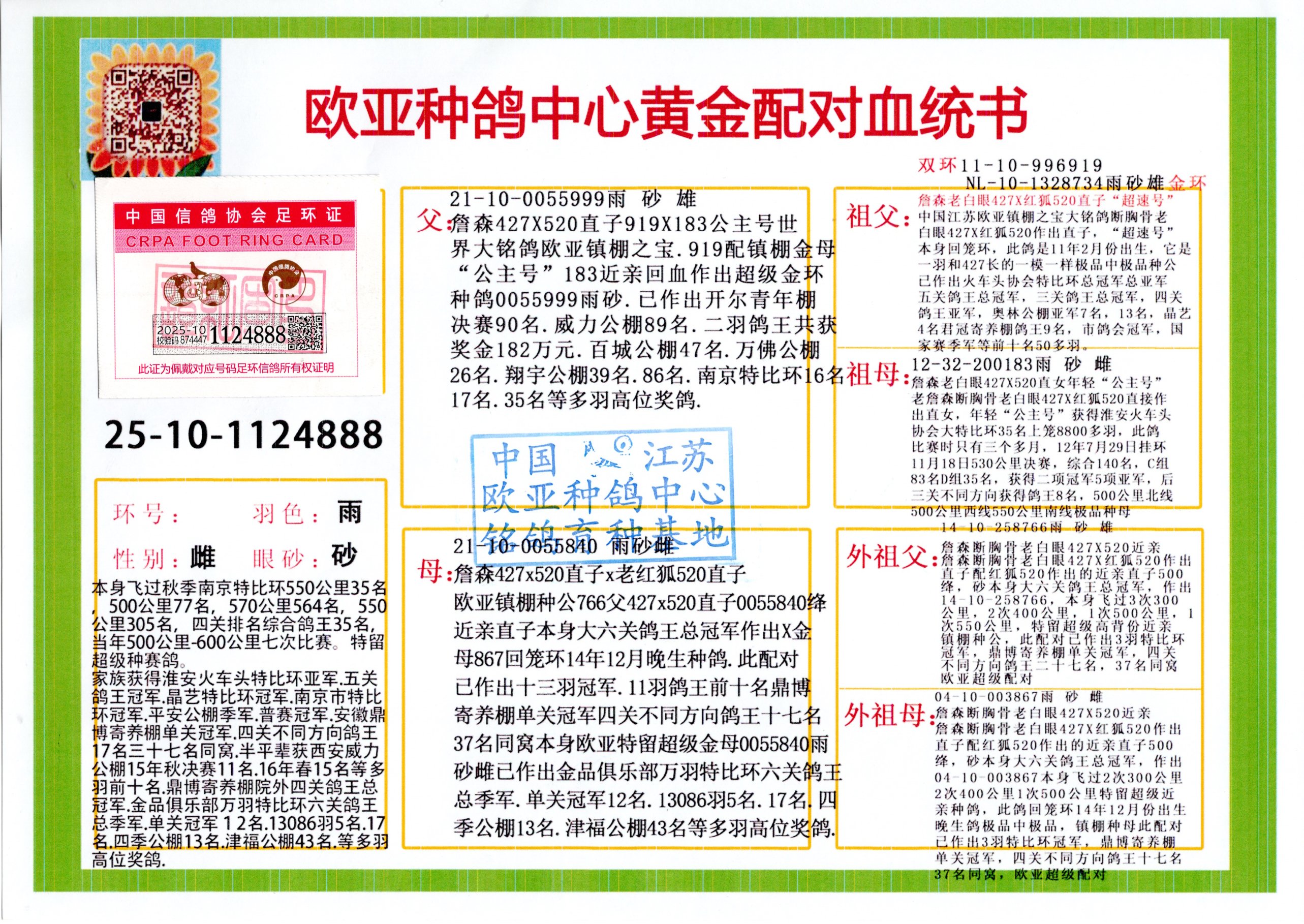24年秋南京特比環(huán)歐亞榮獲大團(tuán)體冠軍.小團(tuán)體冠軍551公里大特比13名.14名.16名.19名.20名.21名.24名.26名.27名.28名.42名.52名.54名.57名.65名.66名.68名.70名.71名.72名.74名.76名.80名.82名.83名.84名.85名.86名.90名.92名.110名.116名.121名.122名.128名.131名.158名.161名.164名.165名.166名.172名.174名.177名.182名.195名.196名.201名.205名.208名.210名.216名.253名.269名.275名.276名.294名.296名.299名,,24年秋云南天南銅都公棚決賽415名.天南銅都小棚決賽409名.云南玉活公棚決賽102名.490名.團(tuán)體32名上籠二羽進(jìn)二羽,天南銅都大棚506公里決賽445名。熱烈祝賀河北省巨鹿縣李蘭生老師用歐亞泰山號(hào)血系連續(xù)十一年奪冠軍,河北省國(guó)家賽冠軍.全國(guó)季軍等多次前十名高位,揚(yáng)州王軍王總用歐亞利奧24年春季獲山東翔宇公棚決賽33名蓋比53名。南京劉正龍劉總用歐亞蓋比獲得24年秋山東濰坊國(guó)際公棚決賽42名.精英賽30名.三關(guān)鴿王71名.決賽86名.加站賽16名.南京市特比環(huán)A組鴿王9名.B組鴿王5名.6名.C組鴿王5名.精英賽冠軍4名.技能賽A組冠軍4名.5名.秦淮區(qū)特比環(huán)榮獲15名.46名.48名.87名。四川西昌徐亮徐總用歐亞利奧獲得涼山州聚友決賽177名.第二關(guān)亞軍雙關(guān)鴿王19名.三關(guān)鴿王105名.云南豪庭公棚決賽603名。熱烈祝賀24年四川重慶翔園鴿舍用歐亞泰山號(hào)榮獲春季400公里冠軍.秋季500公里冠軍,河北王總用詹森X利奧獲得千羽千翔公棚400公里冠軍,廣東蔡楷煥榮獲24年秋愛好者 賽鴿俱樂部三關(guān)鴿王季軍.一關(guān)420公里99名.二關(guān)450公里11名.三關(guān)520公里32名.單關(guān)季軍.7名.12名,江西李衛(wèi)興榮獲貴州紅楓公棚8名.共翔俱樂部寄養(yǎng)棚四關(guān)綜合鴿王30名.一關(guān)400公里78名.二關(guān)500公里55名.三關(guān)520公里37名.四關(guān)500公里57名.同父母獲公棚18名.雷鳴獲得武漢黃浦育翔中心冠軍,四川陳文獲得四川明鴻俱樂部300公里夢(mèng)幻2名.3名.4名.9名.10名.13名.14名.15名.31名.34名.40名.41名.42名.43名.69名.71名.72名.73名.74名.94名.95名.97名.98名.99名.419公里決賽榮獲總冠軍7名.總共歸巢9羽,四川徐亮獲豪庭決賽603名,山西鄭勇獲得山西泰鑫公棚決賽255名詹森紅狐,熱烈祝賀馬總獲得開爾(飛躍隊(duì))決賽9名獲獎(jiǎng)金1310000萬元.第一關(guān)52名,天津津福資賽180公里96名.獲獎(jiǎng)金429543萬元,歐亞支持全國(guó)鴿友24年秋多人報(bào)喜 祝大家取得更好成績(jī),給歐亞報(bào)喜鴿友歐亞決定給每人贈(zèng)送一羽超級(jí)種鴿。歐亞俱樂部特比環(huán)多關(guān)鴿王成績(jī):15年秋淮安特比環(huán)黑色星期一全會(huì)上籠9700多羽,當(dāng)天無鴿歸巢,第二天全會(huì)歸巢357羽,本舍歸巢158羽.前十名八羽.前一百名歸巢57羽,16年春季獲五關(guān)鴿王總冠軍,總亞軍四名.六名.七名.九名.十名.晶藝俱樂部520公里冠亞季軍5名.6名.7名.9名.11名等,火車頭冠軍.季軍6名.8名.9名.10名,16年秋晶藝俱樂部特比環(huán)520公里亞軍.季軍4名.6名.7名.9名,15年春南京白下特比環(huán)冠軍.亞軍.季軍6名.7名.8名.9名.10名.指定鴿A B組獲得冠軍.亞軍.季軍4名.5名.,17年淮安特比環(huán)亞軍.4名.5名.7名.8名.10名.六關(guān)鴿王總冠軍.4名.6名.9名.10名,寄養(yǎng)棚宿遷劉總20羽特比環(huán)獲冠軍.季軍.4名.7名.8名.9名等。18年榮獲萬羽特比環(huán)六關(guān)鴿王總冠軍.總亞軍.總季軍.6名.8名.十名.單關(guān)四羽冠軍.二羽亞軍.四羽季軍.前十名27羽。19年秋萬羽特比環(huán)六關(guān)鴿王總亞軍.總季軍.5名.8名等,單關(guān)二羽冠軍.三羽亞軍.一羽季軍前十名31羽。20年秋淮安市鴿會(huì)四關(guān)特比環(huán)大賽風(fēng)雨無阻鴿王亞軍.鴿王六名,金品俱樂部萬羽特比環(huán)六關(guān)鴿王總冠軍,總亞軍.四名.五名.六名.七名.八名.十名.前二百名鴿王35羽,單關(guān)冠亞季軍前十名四十多羽,火車頭五關(guān)鴿王季軍.六名.八名.前二百名鴿王十七羽。20年春榮獲淮安五區(qū)一市四關(guān)鴿王總冠軍.亞軍.四名.八名.九名。21年秋榮獲金品萬羽特比環(huán)大賽六關(guān)鴿王總亞軍.總季軍.四名.七名.九名.十名.單關(guān)冠亞軍季軍前十名三十多羽;疖囶^協(xié)會(huì)鴿王六名.七名.十名.單關(guān)前十名十七羽。22年秋榮獲鴿王總冠軍.總亞軍.5名.7名.8名.9名.11名.單關(guān)冠亞季軍前十名三十多羽,第一關(guān)單關(guān)前二百名四十多羽,第二關(guān)前二百名三十多羽,第三關(guān)前二百名四十多羽,第四關(guān)前二百名四十多羽,第五關(guān)前一百名53羽。23年秋榮獲鴿王季軍.五名.八名.十名.13名.17名.20名.27名等多羽鴿王.單關(guān)前十名二十多羽。公棚.寄養(yǎng)棚部分成績(jī):16年秋寧夏黃河公棚總冠軍電腦戈馬力指定通炮冠軍,17年送八羽參賽獲得鴿王八名進(jìn)獎(jiǎng)四名,支持韓總榮獲八名。支持鴿友榮獲寧夏中衛(wèi)公棚決賽總冠軍.精英賽冠軍,支持18年寧夏黃河公棚決賽冠軍詹森X泰山。安徽鼎博寄養(yǎng)棚院內(nèi)外四關(guān)鴿王總冠軍.鴿王十七名.三十七名同窩,鴿王39名.42名.58名.67名。18年山東公棚預(yù)賽冠軍.決賽65名.送八羽進(jìn)獎(jiǎng)五羽.指定獲奔馳汽車一輛。支持鴿友獲得云南藍(lán)云公棚冠軍.蓋比X佛卡門。支持鴿友榮獲云南銀集公棚決賽冠軍 詹森427X520血系 速度賽6700羽冠軍。17年榮獲金馬俱樂部寄養(y