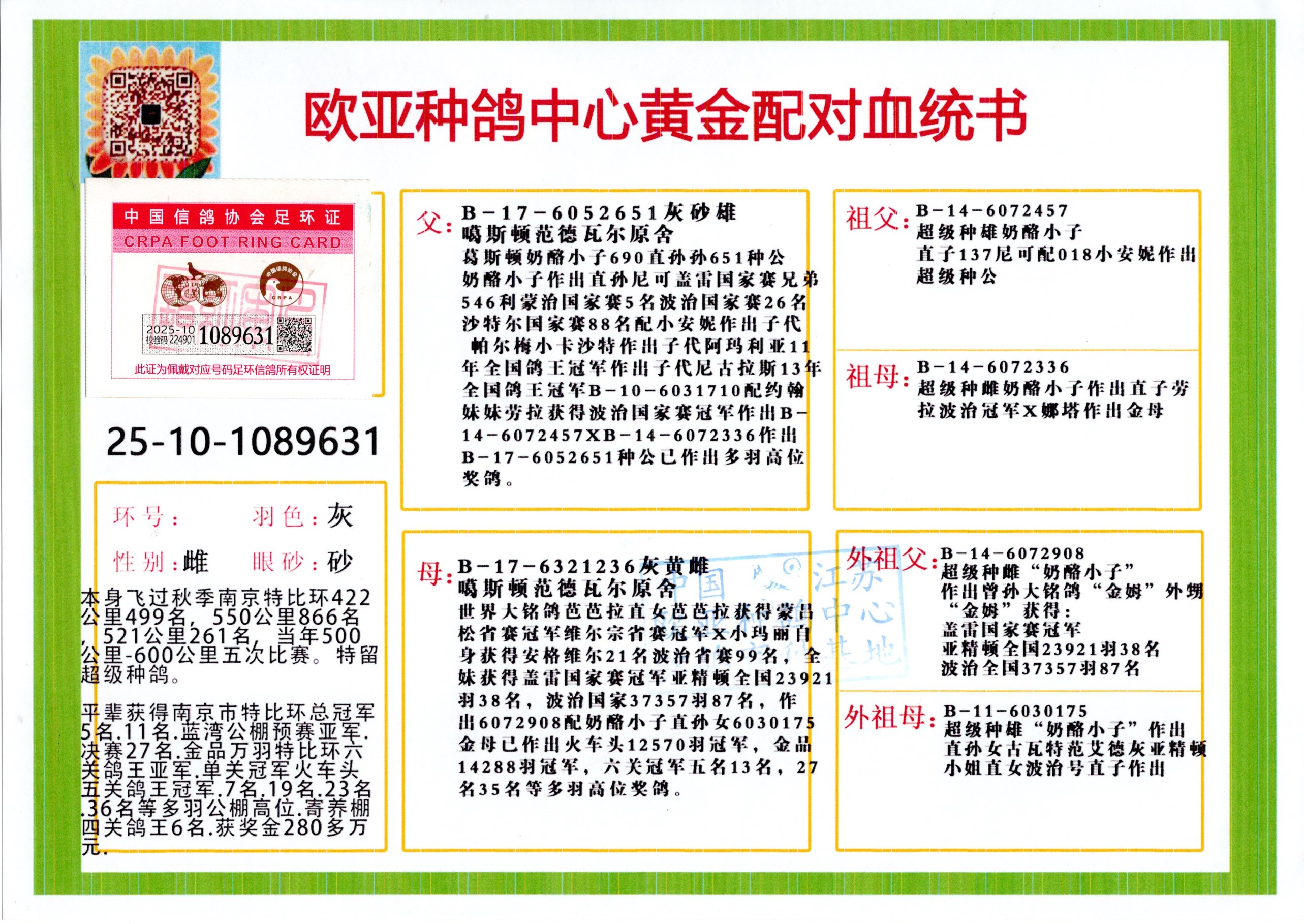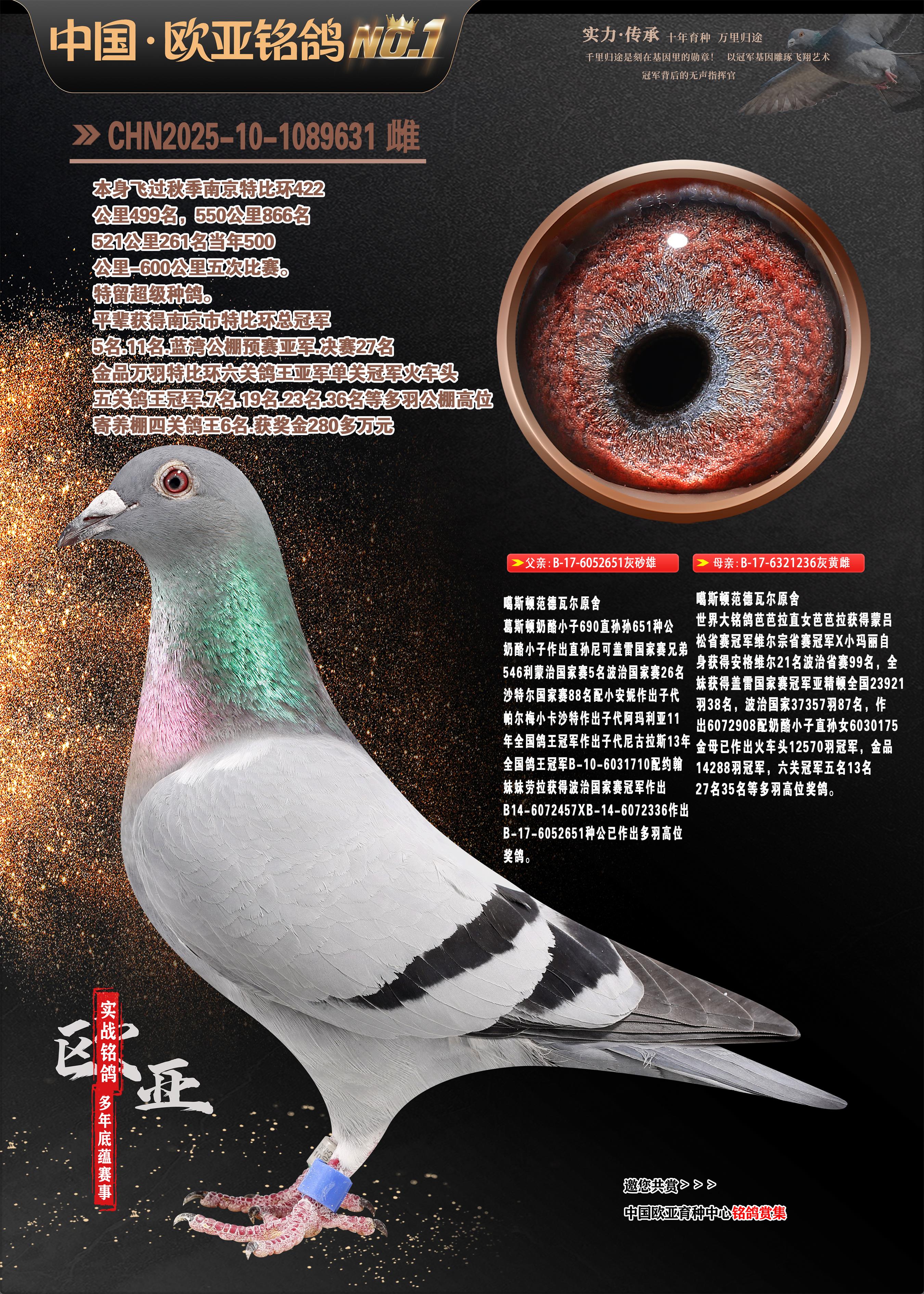 24年秋南京特比環(huán)歐亞榮獲大團體冠軍.小團體冠軍551公里大特比13名.14名.16名.19名.20名.21名.24名.26名.27名.28名.42名.52名.54名.57名.65名.66名.68名.70名.71名.72名.74名.76名.80名.82名.83名.84名.85名.86名.90名.92名.110名.116名.121名.122名.128名.131名.158名.161名.164名.165名.166名.172名.174名.177名.182名.195名.196名.201名.205名.208名.210名.216名.253名.269名.275名.276名.294名.296名.299名,,24年秋云南天南銅都公棚決賽415名.天南銅都小棚決賽409名.云南玉活公棚決賽102名.490名.團體32名上籠二羽進二羽,天南銅都大棚506公里決賽445名。熱烈祝賀河北省巨鹿縣李蘭生老師用歐亞泰山號血系連續(xù)十一年奪冠軍,河北省國家賽冠軍.全國季軍等多次前十名高位,揚州王軍王總用歐亞利奧24年春季獲山東翔宇公棚決賽33名蓋比53名。南京劉正龍劉總用歐亞蓋比獲得24年秋山東濰坊國際公棚決賽42名.精英賽30名.三關鴿王71名.決賽86名.加站賽16名.南京市特比環(huán)A組鴿王9名.B組鴿王5名.6名.C組鴿王5名.精英賽冠軍4名.技能賽A組冠軍4名.5名.秦淮區(qū)特比環(huán)榮獲15名.46名.48名.87名。四川西昌徐亮徐總用歐亞利奧獲得涼山州聚友決賽177名.第二關亞軍雙關鴿王19名.三關鴿王105名.云南豪庭公棚決賽603名。熱烈祝賀24年四川重慶翔園鴿舍用歐亞泰山號榮獲春季400公里冠軍.秋季500公里冠軍,河北王總用詹森X利奧獲得千羽千翔公棚400公里冠軍,廣東蔡楷煥榮獲24年秋愛好者 賽鴿俱樂部三關鴿王季軍.一關420公里99名.二關450公里11名.三關520公里32名.單關季軍.7名.12名,江西李衛(wèi)興榮獲貴州紅楓公棚8名.共翔俱樂部寄養(yǎng)棚四關綜合鴿王30名.一關400公里78名.二關500公里55名.三關520公里37名.四關500公里57名.同父母獲公棚18名.雷鳴獲得武漢黃浦育翔中心冠軍,四川陳文獲得四川明鴻俱樂部300公里夢幻2名.3名.4名.9名.10名.13名.14名.15名.31名.34名.40名.41名.42名.43名.69名.71名.72名.73名.74名.94名.95名.97名.98名.99名.419公里決賽榮獲總冠軍7名.總共歸巢9羽,四川徐亮獲豪庭決賽603名,山西鄭勇獲得山西泰鑫公棚決賽255名詹森紅狐,熱烈祝賀馬總獲得開爾(飛躍隊)決賽9名獲獎金1310000萬元.第一關52名,天津津福資賽180公里96名.獲獎金429543萬元,歐亞支持全國鴿友24年秋多人報喜 祝大家取得更好成績,給歐亞報喜鴿友歐亞決定給每人贈送一羽超級種鴿。歐亞俱樂部特比環(huán)多關鴿王成績:15年秋淮安特比環(huán)黑色星期一全會上籠9700多羽,當天無鴿歸巢,第二天全會歸巢357羽,本舍歸巢158羽.前十名八羽.前一百名歸巢57羽,16年春季獲五關鴿王總冠軍,總亞軍四名.六名.七名.九名.十名.晶藝俱樂部520公里冠亞季軍5名.6名.7名.9名.11名等,火車頭冠軍.季軍6名.8名.9名.10名,16年秋晶藝俱樂部特比環(huán)520公里亞軍.季軍4名.6名.7名.9名,15年春南京白下特比環(huán)冠軍.亞軍.季軍6名.7名.8名.9名.10名.指定鴿A B組獲得冠軍.亞軍.季軍4名.5名.,17年淮安特比環(huán)亞軍.4名.5名.7名.8名.10名.六關鴿王總冠軍.4名.6名.9名.10名,寄養(yǎng)棚宿遷劉總20羽特比環(huán)獲冠軍.季軍.4名.7名.8名.9名等。18年榮獲萬羽特比環(huán)六關鴿王總冠軍.總亞軍.總季軍.6名.8名.十名.單關四羽冠軍.二羽亞軍.四羽季軍.前十名27羽。19年秋萬羽特比環(huán)六關鴿王總亞軍.總季軍.5名.8名等,單關二羽冠軍.三羽亞軍.一羽季軍前十名31羽。20年秋淮安市鴿會四關特比環(huán)大賽風雨無阻鴿王亞軍.鴿王六名,金品俱樂部萬羽特比環(huán)六關鴿王總冠軍,總亞軍.四名.五名.六名.七名.八名.十名.前二百名鴿王35羽,單關冠亞季軍前十名四十多羽,火車頭五關鴿王季軍.六名.八名.前二百名鴿王十七羽。20年春榮獲淮安五區(qū)一市四關鴿王總冠軍.亞軍.四名.八名.九名。21年秋榮獲金品萬羽特比環(huán)大賽六關鴿王總亞軍.總季軍.四名.七名.九名.十名.單關冠亞軍季軍前十名三十多羽。火車頭協(xié)會鴿王六名.七名.十名.單關前十名十七羽。22年秋榮獲鴿王總冠軍.總亞軍.5名.7名.8名.9名.11名.單關冠亞季軍前十名三十多羽,第一關單關前二百名四十多羽,第二關前二百名三十多羽,第三關前二百名四十多羽,第四關前二百名四十多羽,第五關前一百名53羽。23年秋榮獲鴿王季軍.五名.八名.十名.13名.17名.20名.27名等多羽鴿王.單關前十名二十多羽。公棚.寄養(yǎng)棚部分成績:16年秋寧夏黃河公棚總冠軍電腦戈馬力指定通炮冠軍,17年送八羽參賽獲得鴿王八名進獎四名,支持韓總榮獲八名。支持鴿友榮獲寧夏中衛(wèi)公棚決賽總冠軍.精英賽冠軍,支持18年寧夏黃河公棚決賽冠軍詹森X泰山。安徽鼎博寄養(yǎng)棚院內(nèi)外四關鴿王總冠軍.鴿王十七名.三十七名同窩,鴿王39名.42名.58名.67名。18年山東公棚預賽冠軍.決賽65名.送八羽進獎五羽.指定獲奔馳汽車一輛。支持鴿友獲得云南藍云公棚冠軍.蓋比X佛卡門。支持鴿友榮獲云南銀集公棚決賽冠軍 詹森427X520血系 速度賽6700羽冠軍。17年榮獲金馬俱樂部寄養(yǎng)棚四關鴿王總冠軍.季軍.六名.八名.第一關冠軍.亞軍.季軍四名.七名.十一名.金牌教練獎。支持鴿友18年北京費翔公棚預賽九名電腦X桑杰士,支持鴿友榮獲陜西威力公棚決賽11名.內(nèi)蒙古臨河寄養(yǎng)棚四關鴿王六名.詹森配泰山,支持河北王總用歐亞詹森427配胡本喜獲20年秋開爾青年棚季軍。云南東榮公棚16年預賽冠軍.決賽77名.17年決賽12名.詹森紅狐X泰山,17年平安