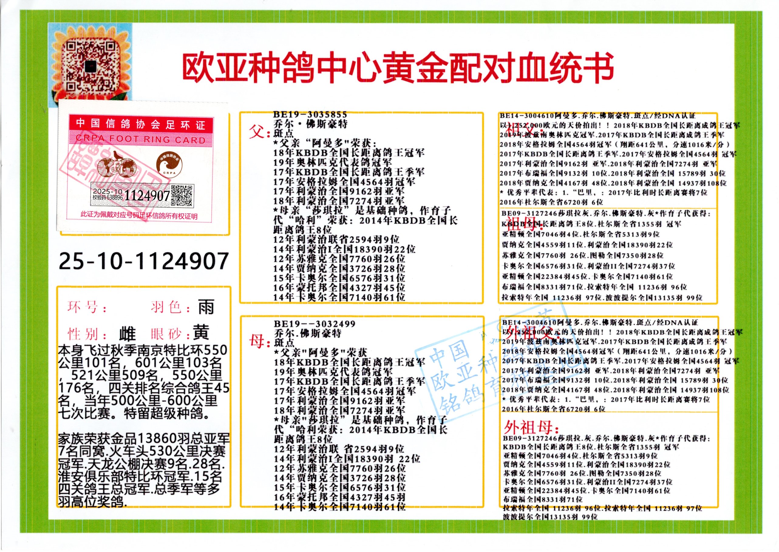 24年秋南京特比環(huán)歐亞榮獲大團(tuán)體冠軍.小團(tuán)體冠軍551公里大特比13名.14名.16名.19名.20名.21名.24名.26名.27名.28名.42名.52名.54名.57名.65名.66名.68名.70名.71名.72名.74名.76名.80名.82名.83名.84名.85名.86名.90名.92名.110名.116名.121名.122名.128名.131名.158名.161名.164名.165名.166名.172名.174名.177名.182名.195名.196名.201名.205名.208名.210名.216名.253名.269名.275名.276名.294名.296名.299名,,24年秋云南天南銅都公棚決賽415名.天南銅都小棚決賽409名.云南玉活公棚決賽102名.490名.團(tuán)體32名上籠二羽進(jìn)二羽,天南銅都大棚506公里決賽445名。熱烈祝賀河北省巨鹿縣李蘭生老師用歐亞泰山號(hào)血系連續(xù)十一年奪冠軍,河北省國(guó)家賽冠軍.全國(guó)季軍等多次前十名高位,揚(yáng)州王軍王總用歐亞利奧24年春季獲山東翔宇公棚決賽33名蓋比53名。南京劉正龍劉總用歐亞蓋比獲得24年秋山東濰坊國(guó)際公棚決賽42名.精英賽30名.三關(guān)鴿王71名.決賽86名.加站賽16名.南京市特比環(huán)A組鴿王9名.B組鴿王5名.6名.C組鴿王5名.精英賽冠軍4名.技能賽A組冠軍4名.5名.秦淮區(qū)特比環(huán)榮獲15名.46名.48名.87名。四川西昌徐亮徐總用歐亞利奧獲得涼山州聚友決賽177名.第二關(guān)亞軍雙關(guān)鴿王19名.三關(guān)鴿王105名.云南豪庭公棚決賽603名。熱烈祝賀24年四川重慶翔園鴿舍用歐亞泰山號(hào)榮獲春季400公里冠軍.秋季500公里冠軍,河北王總用詹森X利奧獲得千羽千翔公棚400公里冠軍,廣東蔡楷煥榮獲24年秋愛好者 賽鴿俱樂部三關(guān)鴿王季軍.一關(guān)420公里99名.二關(guān)450公里11名.三關(guān)520公里32名.單關(guān)季軍.7名.12名,江西李衛(wèi)興榮獲貴州紅楓公棚8名.共翔俱樂部寄養(yǎng)棚四關(guān)綜合鴿王30名.一關(guān)400公里78名.二關(guān)500公里55名.三關(guān)520公里37名.四關(guān)500公里57名.同父母獲公棚18名.雷鳴獲得武漢黃浦育翔中心冠軍,四川陳文獲得四川明鴻俱樂部300公里夢(mèng)幻2名.3名.4名.9名.10名.13名.14名.15名.31名.34名.40名.41名.42名.43名.69名.71名.72名.73名.74名.94名.95名.97名.98名.99名.419公里決賽榮獲總冠軍7名.總共歸巢9羽,四川徐亮獲豪庭決賽603名,山西鄭勇獲得山西泰鑫公棚決賽255名詹森紅狐,熱烈祝賀馬總獲得開爾(飛躍隊(duì))決賽9名獲獎(jiǎng)金1310000萬(wàn)元.第一關(guān)52名,天津津福資賽180公里96名.獲獎(jiǎng)金429543萬(wàn)元,歐亞支持全國(guó)鴿友24年秋多人報(bào)喜 祝大家取得更好成績(jī),給歐亞報(bào)喜鴿友歐亞決定給每人贈(zèng)送一羽超級(jí)種鴿。歐亞俱樂部特比環(huán)多關(guān)鴿王成績(jī):15年秋淮安特比環(huán)黑色星期一全會(huì)上籠9700多羽,當(dāng)天無(wú)鴿歸巢,第二天全會(huì)歸巢357羽,本舍歸巢158羽.前十名八羽.前一百名歸巢57羽,16年春季獲五關(guān)鴿王總冠軍,總亞軍四名.六名.七名.九名.十名.晶藝俱樂部520公里冠亞季軍5名.6名.7名.9名.11名等,火車頭冠軍.季軍6名.8名.9名.10名,16年秋晶藝俱樂部特比環(huán)520公里亞軍.季軍4名.6名.7名.9名,15年春南京白下特比環(huán)冠軍.亞軍.季軍6名.7名.8名.9名.10名.指定鴿A B組獲得冠軍.亞軍.季軍4名.5名.,17年淮安特比環(huán)亞軍.4名.5名.7名.8名.10名.六關(guān)鴿王總冠軍.4名.6名.9名.10名,寄養(yǎng)棚宿遷劉總20羽特比環(huán)獲冠軍.季軍.4名.7名.8名.9名等。18年榮獲萬(wàn)羽特比環(huán)六關(guān)鴿王總冠軍.總亞軍.總季軍.6名.8名.十名.單關(guān)四羽冠軍.二羽亞軍.四羽季軍.前十名27羽。19年秋萬(wàn)羽特比環(huán)六關(guān)鴿王總亞軍.總季軍.5名.8名等,單關(guān)二羽冠軍.三羽亞軍.一羽季軍前十名31羽。20年秋淮安市鴿會(huì)四關(guān)特比環(huán)大賽風(fēng)雨無(wú)阻鴿王亞軍.鴿王六名,金品俱樂部萬(wàn)羽特比環(huán)六關(guān)鴿王總冠軍,總亞軍.四名.五名.六名.七名.八名.十名.前二百名鴿王35羽,單關(guān)冠亞季軍前十名四十多羽,火車頭五關(guān)鴿王季軍.六名.八名.前二百名鴿王十七羽。20年春榮獲淮安五區(qū)一市四關(guān)鴿王總冠軍.亞軍.四名.八名.九名。21年秋榮獲金品萬(wàn)羽特比環(huán)大賽六關(guān)鴿王總亞軍.總季軍.四名.七名.九名.十名.單關(guān)冠亞軍季軍前十名三十多羽;疖囶^協(xié)會(huì)鴿王六名.七名.十名.單關(guān)前十名十七羽。22年秋榮獲鴿王總冠軍.總亞軍.5名.7名.8名.9名.11名.單關(guān)冠亞季軍前十名三十多羽,第一關(guān)單關(guān)前二百名四十多羽,第二關(guān)前二百名三十多羽,第三關(guān)前二百名四十多羽,第四關(guān)前二百名四十多羽,第五關(guān)前一百名53羽。23年秋榮獲鴿王季軍.五名.八名.十名.13名.17名.20名.27名等多羽鴿王.單關(guān)前十名二十多羽。公棚.寄養(yǎng)棚部分成績(jī):16年秋寧夏黃河公棚總冠軍電腦戈馬力指定通炮冠軍,17年送八羽參賽獲得鴿王八名進(jìn)獎(jiǎng)四名,支持韓總榮獲八名。支持鴿友榮獲寧夏中衛(wèi)公棚決賽總冠軍.精英賽冠軍,支持18年寧夏黃河公棚決賽冠軍詹森X泰山。安徽鼎博寄養(yǎng)棚院內(nèi)外四關(guān)鴿王總冠軍.鴿王十七名.三十七名同窩,鴿王39名.42名.58名.67名。18年山東公棚預(yù)賽冠軍.決賽65名.送八羽進(jìn)獎(jiǎng)五羽.指定獲奔馳汽車一輛。支持鴿友獲得云南藍(lán)云公棚冠軍.蓋比X佛卡門。支持鴿友榮獲云南銀集公棚決賽冠軍 詹森427X520血系 速度賽6700