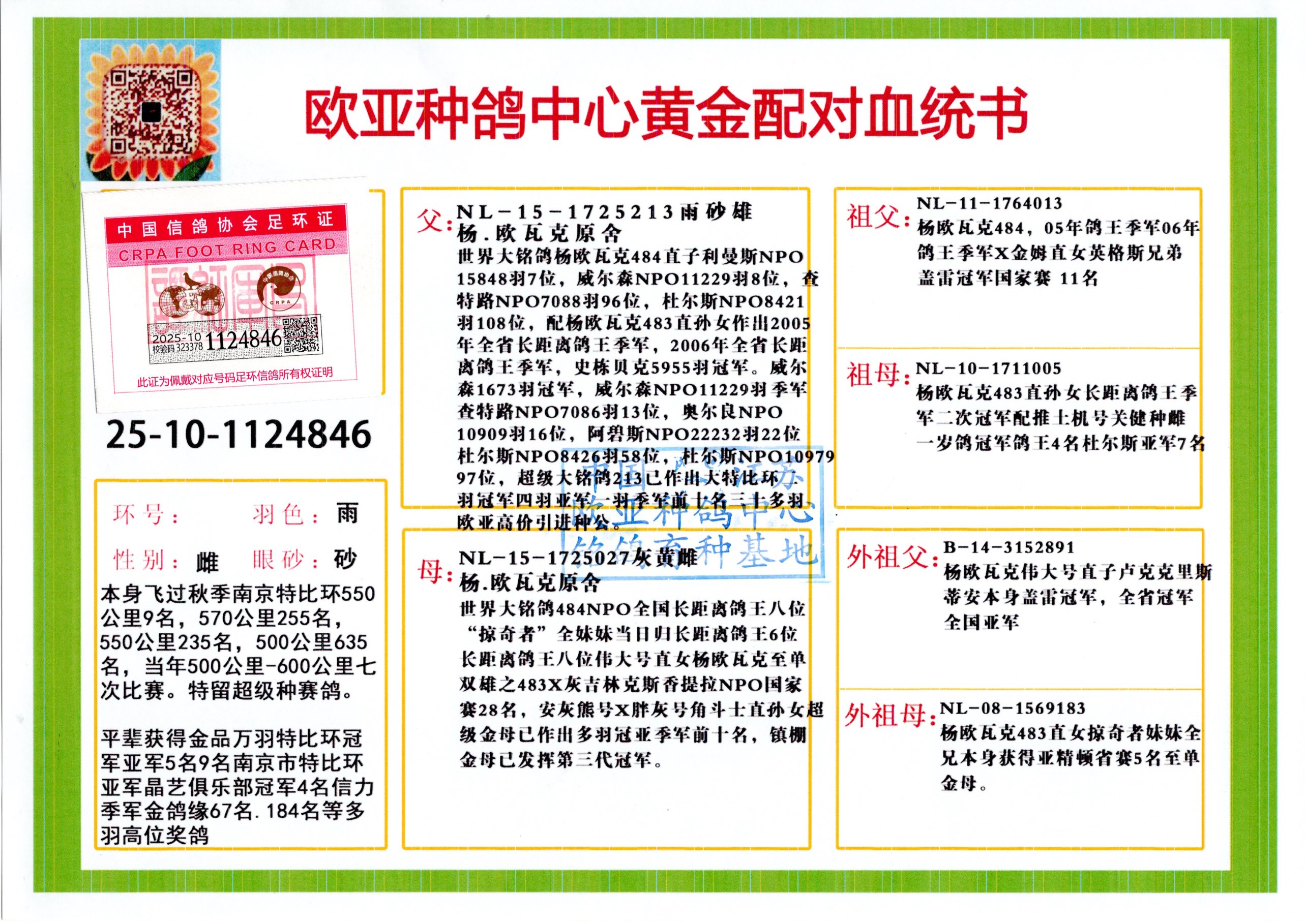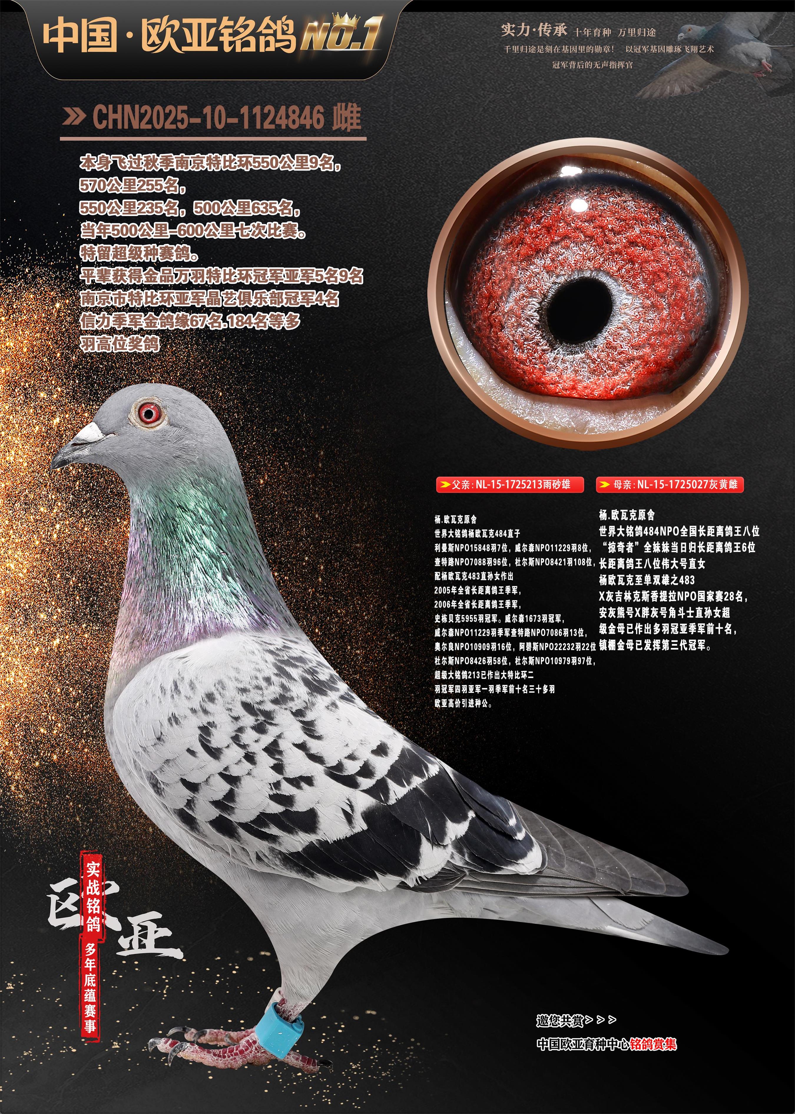 24年秋南京特比環(huán)歐亞榮獲大團(tuán)體冠軍.小團(tuán)體冠軍551公里大特比13名.14名.16名.19名.20名.21名.24名.26名.27名.28名.42名.52名.54名.57名.65名.66名.68名.70名.71名.72名.74名.76名.80名.82名.83名.84名.85名.86名.90名.92名.110名.116名.121名.122名.128名.131名.158名.161名.164名.165名.166名.172名.174名.177名.182名.195名.196名.201名.205名.208名.210名.216名.253名.269名.275名.276名.294名.296名.299名,,24年秋云南天南銅都公棚決賽415名.天南銅都小棚決賽409名.云南玉活公棚決賽102名.490名.團(tuán)體32名上籠二羽進(jìn)二羽,天南銅都大棚506公里決賽445名。熱烈祝賀河北省巨鹿縣李蘭生老師用歐亞泰山號(hào)血系連續(xù)十一年奪冠軍,河北省國家賽冠軍.全國季軍等多次前十名高位,揚(yáng)州王軍王總用歐亞利奧24年春季獲山東翔宇公棚決賽33名蓋比53名。南京劉正龍劉總用歐亞蓋比獲得24年秋山東濰坊國際公棚決賽42名.精英賽30名.三關(guān)鴿王71名.決賽86名.加站賽16名.南京市特比環(huán)A組鴿王9名.B組鴿王5名.6名.C組鴿王5名.精英賽冠軍4名.技能賽A組冠軍4名.5名.秦淮區(qū)特比環(huán)榮獲15名.46名.48名.87名。四川西昌徐亮徐總用歐亞利奧獲得涼山州聚友決賽177名.第二關(guān)亞軍雙關(guān)鴿王19名.三關(guān)鴿王105名.云南豪庭公棚決賽603名。熱烈祝賀24年四川重慶翔園鴿舍用歐亞泰山號(hào)榮獲春季400公里冠軍.秋季500公里冠軍,河北王總用詹森X利奧獲得千羽千翔公棚400公里冠軍,廣東蔡楷煥榮獲24年秋愛好者 賽鴿俱樂部三關(guān)鴿王季軍.一關(guān)420公里99名.二關(guān)450公里11名.三關(guān)520公里32名.單關(guān)季軍.7名.12名,江西李衛(wèi)興榮獲貴州紅楓公棚8名.共翔俱樂部寄養(yǎng)棚四關(guān)綜合鴿王30名.一關(guān)400公里78名.二關(guān)500公里55名.三關(guān)520公里37名.四關(guān)500公里57名.同父母獲公棚18名.雷鳴獲得武漢黃浦育翔中心冠軍,四川陳文獲得四川明鴻俱樂部300公里夢(mèng)幻2名.3名.4名.9名.10名.13名.14名.15名.31名.34名.40名.41名.42名.43名.69名.71名.72名.73名.74名.94名.95名.97名.98名.99名.419公里決賽榮獲總冠軍7名.總共歸巢9羽,四川徐亮獲豪庭決賽603名,山西鄭勇獲得山西泰鑫公棚決賽255名詹森紅狐,熱烈祝賀馬總獲得開爾(飛躍隊(duì))決賽9名獲獎(jiǎng)金1310000萬元.第一關(guān)52名,天津津福資賽180公里96名.獲獎(jiǎng)金429543萬元,歐亞支持全國鴿友24年秋多人報(bào)喜 祝大家取得更好成績,給歐亞報(bào)喜鴿友歐亞決定給每人贈(zèng)送一羽超級(jí)種鴿。歐亞俱樂部特比環(huán)多關(guān)鴿王成績:15年秋淮安特比環(huán)黑色星期一全會(huì)上籠9700多羽,當(dāng)天無鴿歸巢,第二天全會(huì)歸巢357羽,本舍歸巢158羽.前十名八羽.前一百名歸巢57羽,16年春季獲五關(guān)鴿王總冠軍,總亞軍四名.六名.七名.九名.十名.晶藝俱樂部520公里冠亞季軍5名.6名.7名.9名.11名等,火車頭冠軍.季軍6名.8名.9名.10名,16年秋晶藝俱樂部特比環(huán)520公里亞軍.季軍4名.6名.7名.9名,15年春南京白下特比環(huán)冠軍.亞軍.季軍6名.7名.8名.9名.10名.指定鴿A B組獲得冠軍.亞軍.季軍4名.5名.,17年淮安特比環(huán)亞軍.4名.5名.7名.8名.10名.六關(guān)鴿王總冠軍.4名.6名.9名.10名,寄養(yǎng)棚宿遷劉總20羽特比環(huán)獲冠軍.季軍.4名.7名.8名.9名等。18年榮獲萬羽特比環(huán)六關(guān)鴿王總冠軍.總亞軍.總季軍.6名.8名.十名.單關(guān)四羽冠軍.二羽亞軍.四羽季軍.前十名27羽。19年秋萬羽特比環(huán)六關(guān)鴿王總亞軍.總季軍.5名.8名等,單關(guān)二羽冠軍.三羽亞軍.一羽季軍前十名31羽。20年秋淮安市鴿會(huì)四關(guān)特比環(huán)大賽風(fēng)雨無阻鴿王亞軍.鴿王六名,金品俱樂部萬羽特比環(huán)六關(guān)鴿王總冠軍,總亞軍.四名.五名.六名.七名.八名.十名.前二百名鴿王35羽,單關(guān)冠亞季軍前十名四十多羽,火車頭五關(guān)鴿王季軍.六名.八名.前二百名鴿王十七羽。20年春榮獲淮安五區(qū)一市四關(guān)鴿王總冠軍.亞軍.四名.八名.九名。21年秋榮獲金品萬羽特比環(huán)大賽六關(guān)鴿王總亞軍.總季軍.四名.七名.九名.十名.單關(guān)冠亞軍季軍前十名三十多羽;疖囶^協(xié)會(huì)鴿王六名.七名.十名.單關(guān)前十名十七羽。22年秋榮獲鴿王總冠軍.總亞軍.5名.7名.8名.9名.11名.單關(guān)冠亞季軍前十名三十多羽,第一關(guān)單關(guān)前二百名四十多羽,第二關(guān)前二百名三十多羽,第三關(guān)前二百名四十多羽,第四關(guān)前二百名四十多羽,第五關(guān)前一百名53羽。23年秋榮獲鴿王季軍.五名.八名.十名.13名.17名.20名.27名等多羽鴿王.單關(guān)前十名二十多羽。公棚.寄養(yǎng)棚部分成績:16年秋寧夏黃河公棚總冠軍電腦戈馬力指定通炮冠軍,17年送八羽參賽獲得鴿王八名進(jìn)獎(jiǎng)四名,支持韓總榮獲八名。支持鴿友榮獲寧夏中衛(wèi)公棚決賽總冠軍.精英賽冠軍,支持18年寧夏黃河公棚決賽冠軍詹森X泰山。安徽鼎博寄養(yǎng)棚院內(nèi)外四關(guān)鴿王總冠軍.鴿王十七名.三十七名同窩,鴿王39名.42名.58名.67名。18年山東公棚預(yù)賽冠軍.決賽65名.送八羽進(jìn)獎(jiǎng)五羽.指定獲奔馳汽車一輛。支持鴿友獲得云南藍(lán)云公棚冠軍.蓋比X佛卡門。支持鴿友榮獲云南銀集公棚決賽冠軍 詹森427X520血系 速度賽6700羽冠軍。17年榮獲金馬俱樂部寄養(yǎng)棚四關(guān)鴿王總冠軍.季