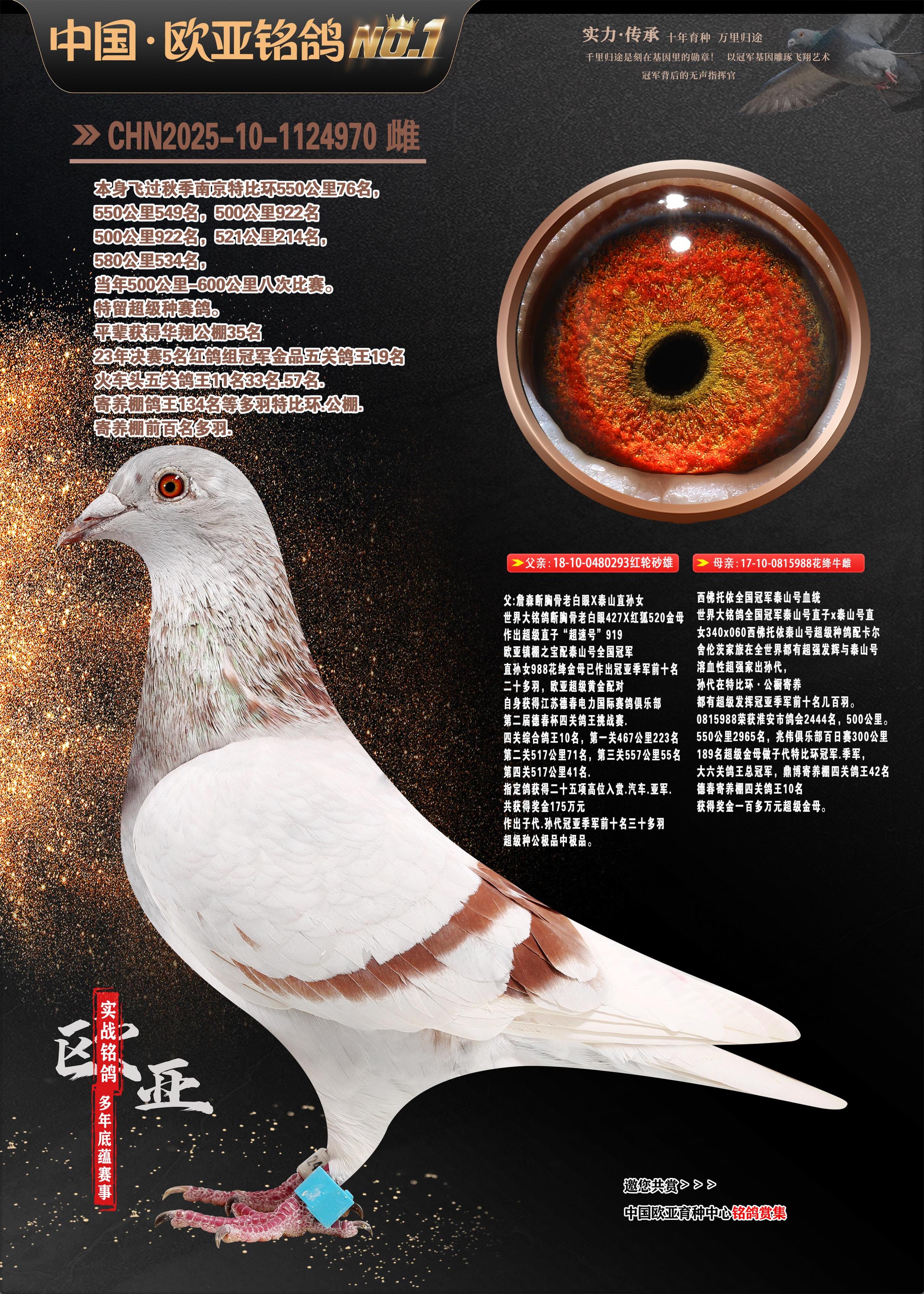 24年秋南京特比環(huán)歐亞榮獲大團(tuán)體冠軍.小團(tuán)體冠軍551公里大特比13名.14名.16名.19名.20名.21名.24名.26名.27名.28名.42名.52名.54名.57名.65名.66名.68名.70名.71名.72名.74名.76名.80名.82名.83名.84名.85名.86名.90名.92名.110名.116名.121名.122名.128名.131名.158名.161名.164名.165名.166名.172名.174名.177名.182名.195名.196名.201名.205名.208名.210名.216名.253名.269名.275名.276名.294名.296名.299名,,24年秋云南天南銅都公棚決賽415名.天南銅都小棚決賽409名.云南玉活公棚決賽102名.490名.團(tuán)體32名上籠二羽進(jìn)二羽,天南銅都大棚506公里決賽445名。熱烈祝賀河北省巨鹿縣李蘭生老師用歐亞泰山號(hào)血系連續(xù)十一年奪冠軍,河北省國(guó)家賽冠軍.全國(guó)季軍等多次前十名高位,揚(yáng)州王軍王總用歐亞利奧24年春季獲山東翔宇公棚決賽33名蓋比53名。南京劉正龍劉總用歐亞蓋比獲得24年秋山東濰坊國(guó)際公棚決賽42名.精英賽30名.三關(guān)鴿王71名.決賽86名.加站賽16名.南京市特比環(huán)A組鴿王9名.B組鴿王5名.6名.C組鴿王5名.精英賽冠軍4名.技能賽A組冠軍4名.5名.秦淮區(qū)特比環(huán)榮獲15名.46名.48名.87名。四川西昌徐亮徐總用歐亞利奧獲得涼山州聚友決賽177名.第二關(guān)亞軍雙關(guān)鴿王19名.三關(guān)鴿王105名.云南豪庭公棚決賽603名。熱烈祝賀24年四川重慶翔園鴿舍用歐亞泰山號(hào)榮獲春季400公里冠軍.秋季500公里冠軍,河北王總用詹森X利奧獲得千羽千翔公棚400公里冠軍,廣東蔡楷煥榮獲24年秋愛(ài)好者 賽鴿俱樂(lè)部三關(guān)鴿王季軍.一關(guān)420公里99名.二關(guān)450公里11名.三關(guān)520公里32名.單關(guān)季軍.7名.12名,江西李衛(wèi)興榮獲貴州紅楓公棚8名.共翔俱樂(lè)部寄養(yǎng)棚四關(guān)綜合鴿王30名.一關(guān)400公里78名.二關(guān)500公里55名.三關(guān)520公里37名.四關(guān)500公里57名.同父母獲公棚18名.雷鳴獲得武漢黃浦育翔中心冠軍,四川陳文獲得四川明鴻俱樂(lè)部300公里夢(mèng)幻2名.3名.4名.9名.10名.13名.14名.15名.31名.34名.40名.41名.42名.43名.69名.71名.72名.73名.74名.94名.95名.97名.98名.99名.419公里決賽榮獲總冠軍7名.總共歸巢9羽,四川徐亮獲豪庭決賽603名,山西鄭勇獲得山西泰鑫公棚決賽255名詹森紅狐,熱烈祝賀馬總獲得開(kāi)爾(飛躍隊(duì))決賽9名獲獎(jiǎng)金1310000萬(wàn)元.第一關(guān)52名,天津津福資賽180公里96名.獲獎(jiǎng)金429543萬(wàn)元,歐亞支持全國(guó)鴿友24年秋多人報(bào)喜 祝大家取得更好成績(jī),給歐亞報(bào)喜鴿友歐亞決定給每人贈(zèng)送一羽超級(jí)種鴿。歐亞俱樂(lè)部特比環(huán)多關(guān)鴿王成績(jī):15年秋淮安特比環(huán)黑色星期一全會(huì)上籠9700多羽,當(dāng)天無(wú)鴿歸巢,第二天全會(huì)歸巢357羽,本舍歸巢158羽.前十名八羽.前一百名歸巢57羽,16年春季獲五關(guān)鴿王總冠軍,總亞軍四名.六名.七名.九名.十名.晶藝俱樂(lè)部520公里冠亞季軍5名.6名.7名.9名.11名等,火車(chē)頭冠軍.季軍6名.8名.9名.10名,16年秋晶藝俱樂(lè)部特比環(huán)520公里亞軍.季軍4名.6名.7名.9名,15年春南京白下特比環(huán)冠軍.亞軍.季軍6名.7名.8名.9名.10名.指定鴿A B組獲得冠軍.亞軍.季軍4名.5名.,17年淮安特比環(huán)亞軍.4名.5名.7名.8名.10名.六關(guān)鴿王總冠軍.4名.6名.9名.10名,寄養(yǎng)棚宿遷劉總20羽特比環(huán)獲冠軍.季軍.4名.7名.8名.9名等。18年榮獲萬(wàn)羽特比環(huán)六關(guān)鴿王總冠軍.總亞軍.總季軍.6名.8名.十名.單關(guān)四羽冠軍.二羽亞軍.四羽季軍.前十名27羽。19年秋萬(wàn)羽特比環(huán)六關(guān)鴿王總亞軍.總季軍.5名.8名等,單關(guān)二羽冠軍.三羽亞軍.一羽季軍前十名31羽。20年秋淮安市鴿會(huì)四關(guān)特比環(huán)大賽風(fēng)雨無(wú)阻鴿王亞軍.鴿王六名,金品俱樂(lè)部萬(wàn)羽特比環(huán)六關(guān)鴿王總冠軍,總亞軍.四名.五名.六名.七名.八名.十名.前二百名鴿王35羽,單關(guān)冠亞季軍前十名四十多羽,火車(chē)頭五關(guān)鴿王季軍.六名.八名.前二百名鴿王十七羽。20年春榮獲淮安五區(qū)一市四關(guān)鴿王總冠軍.亞軍.四名.八名.九名。21年秋榮獲金品萬(wàn)羽特比環(huán)大賽六關(guān)鴿王總亞軍.總季軍.四名.七名.九名.十名.單關(guān)冠亞軍季軍前十名三十多羽。火車(chē)頭協(xié)會(huì)鴿王六名.七名.十名.單關(guān)前十名十七羽。22年秋榮獲鴿王總冠軍.總亞軍.5名.7名.8名.9名.11名.單關(guān)冠亞季軍前十名三十多羽,第一關(guān)單關(guān)前二百名四十多羽,第二關(guān)前二百名三十多羽,第三關(guān)前二百名四十多羽,第四關(guān)前二百名四十多羽,第五關(guān)前一百名53羽。23年秋榮獲鴿王季軍.五名.八名.十名.13名.17名.20名.27名等多羽鴿王.單關(guān)前十名二十多羽。公棚.寄養(yǎng)棚部分成績(jī):16年秋寧夏黃河公棚總冠軍電腦戈馬力指定通炮冠軍,17年送八羽參賽獲得鴿王八名進(jìn)獎(jiǎng)四名,支持韓總榮獲八名。支持鴿友榮獲寧夏中衛(wèi)公棚決賽總冠軍.精英賽冠軍,支持18年寧夏黃河公棚決賽冠軍詹森X泰山。安徽鼎博寄養(yǎng)棚院內(nèi)外四關(guān)鴿王總冠軍.鴿王十七名.三十七名同窩,鴿王39名.42名.58名.67名。18年山東公棚預(yù)賽冠軍.決賽65名.送八羽進(jìn)獎(jiǎng)五羽.指定獲奔馳汽車(chē)一輛。支持鴿友獲得云南藍(lán)云公棚冠軍.蓋比X佛卡門(mén)。支