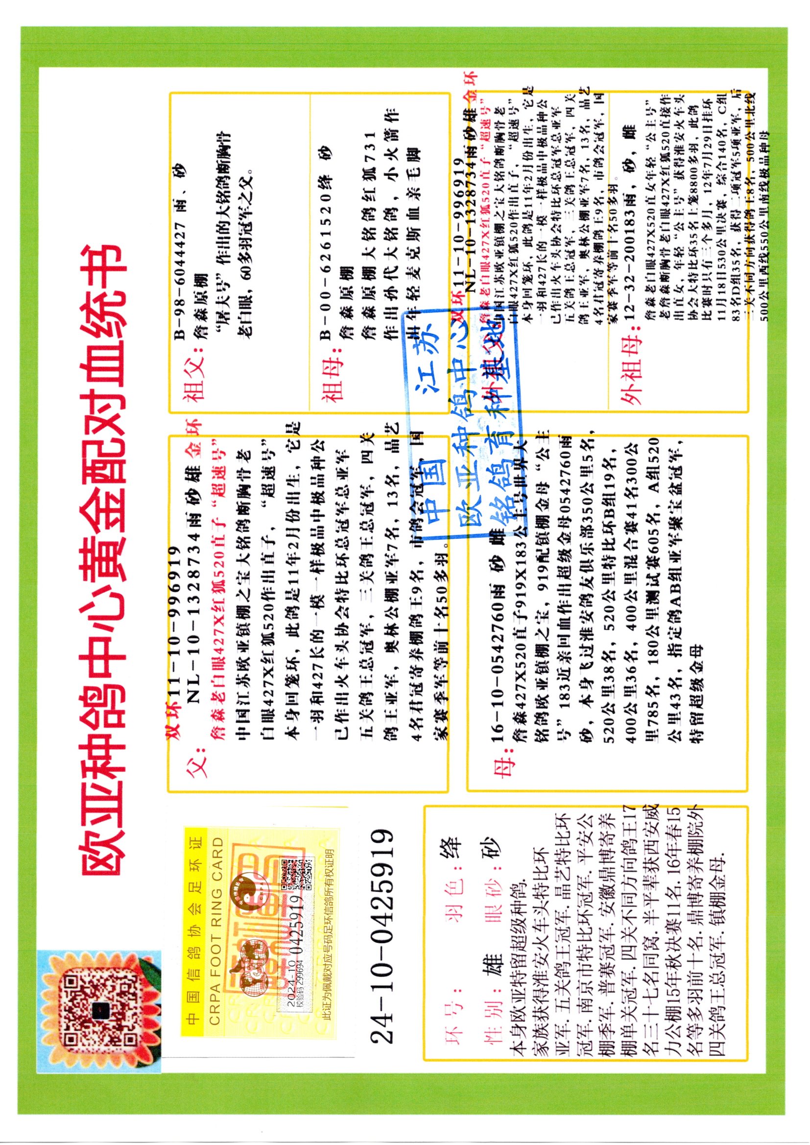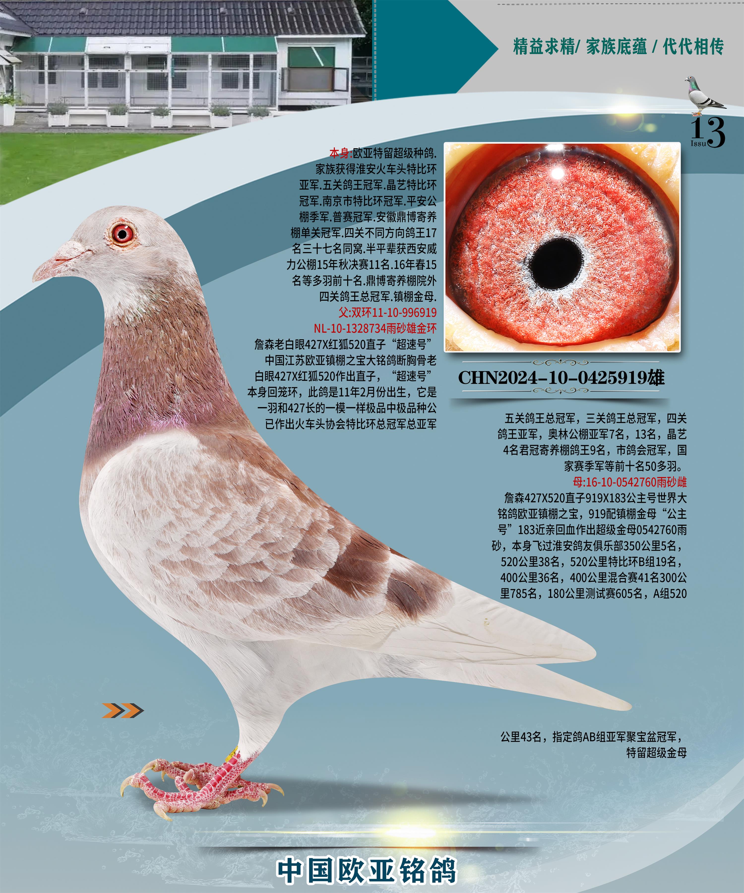 24年秋南京特比環(huán)歐亞榮獲大團(tuán)體冠軍.小團(tuán)體冠軍551公里大特比13名.14名.16名.19名.20名.21名.24名.26名.27名.28名.42名.52名.54名.57名.65名.66名.68名.70名.71名.72名.74名.76名.80名.82名.83名.84名.85名.86名.90名.92名.110名.116名.121名.122名.128名.131名.158名.161名.164名.165名.166名.172名.174名.177名.182名.195名.196名.201名.205名.208名.210名.216名.253名.269名.275名.276名.294名.296名.299名,,24年秋云南天南銅都公棚決賽415名.天南銅都小棚決賽409名.云南玉活公棚決賽102名.490名.團(tuán)體32名上籠二羽進(jìn)二羽,天南銅都大棚506公里決賽445名。熱烈祝賀河北省巨鹿縣李蘭生老師用歐亞泰山號(hào)血系連續(xù)十一年奪冠軍,河北省國(guó)家賽冠軍.全國(guó)季軍等多次前十名高位,揚(yáng)州王軍王總用歐亞利奧24年春季獲山東翔宇公棚決賽33名蓋比53名。南京劉正龍劉總用歐亞蓋比獲得24年秋山東濰坊國(guó)際公棚決賽42名.精英賽30名.三關(guān)鴿王71名.決賽86名.加站賽16名.南京市特比環(huán)A組鴿王9名.B組鴿王5名.6名.C組鴿王5名.精英賽冠軍4名.技能賽A組冠軍4名.5名.秦淮區(qū)特比環(huán)榮獲15名.46名.48名.87名。四川西昌徐亮徐總用歐亞利奧獲得涼山州聚友決賽177名.第二關(guān)亞軍雙關(guān)鴿王19名.三關(guān)鴿王105名.云南豪庭公棚決賽603名。熱烈祝賀24年四川重慶翔園鴿舍用歐亞泰山號(hào)榮獲春季400公里冠軍.秋季500公里冠軍,河北王總用詹森X利奧獲得千羽千翔公棚400公里冠軍,廣東蔡楷煥榮獲24年秋愛(ài)好者 賽鴿俱樂(lè)部三關(guān)鴿王季軍.一關(guān)420公里99名.二關(guān)450公里11名.三關(guān)520公里32名.單關(guān)季軍.7名.12名,江西李衛(wèi)興榮獲貴州紅楓公棚8名.共翔俱樂(lè)部寄養(yǎng)棚四關(guān)綜合鴿王30名.一關(guān)400公里78名.二關(guān)500公里55名.三關(guān)520公里37名.四關(guān)500公里57名.同父母獲公棚18名.雷鳴獲得武漢黃浦育翔中心冠軍,四川陳文獲得四川明鴻俱樂(lè)部300公里夢(mèng)幻2名.3名.4名.9名.10名.13名.14名.15名.31名.34名.40名.41名.42名.43名.69名.71名.72名.73名.74名.94名.95名.97名.98名.99名.419公里決賽榮獲總冠軍7名.總共歸巢9羽,四川徐亮獲豪庭決賽603名,山西鄭勇獲得山西泰鑫公棚決賽255名詹森紅狐,熱烈祝賀馬總獲得開(kāi)爾(飛躍隊(duì))決賽9名獲獎(jiǎng)金1310000萬(wàn)元.第一關(guān)52名,天津津福資賽180公里96名.獲獎(jiǎng)金429543萬(wàn)元,歐亞支持全國(guó)鴿友24年秋多人報(bào)喜 祝大家取得更好成績(jī),給歐亞報(bào)喜鴿友歐亞決定給每人贈(zèng)送一羽超級(jí)種鴿。歐亞俱樂(lè)部特比環(huán)多關(guān)鴿王成績(jī):15年秋淮安特比環(huán)黑色星期一全會(huì)上籠9700多羽,當(dāng)天無(wú)鴿歸巢,第二天全會(huì)歸巢357羽,本舍歸巢158羽.前十名八羽.前一百名歸巢57羽,16年春季獲五關(guān)鴿王總冠軍,總亞軍四名.六名.七名.九名.十名.晶藝俱樂(lè)部520公里冠亞季軍5名.6名.7名.9名.11名等,火車頭冠軍.季軍6名.8名.9名.10名,16年秋晶藝俱樂(lè)部特比環(huán)520公里亞軍.季軍4名.6名.7名.9名,15年春南京白下特比環(huán)冠軍.亞軍.季軍6名.7名.8名.9名.10名.指定鴿A B組獲得冠軍.亞軍.季軍4名.5名.,17年淮安特比環(huán)亞軍.4名.5名.7名.8名.10名.六關(guān)鴿王總冠軍.4名.6名.9名.10名,寄養(yǎng)棚宿遷劉總20羽特比環(huán)獲冠軍.季軍.4名.7名.8名.9名等。18年榮獲萬(wàn)羽特比環(huán)六關(guān)鴿王總冠軍.總亞軍.總季軍.6名.8名.十名.單關(guān)四羽冠軍.二羽亞軍.四羽季軍.前十名27羽。19年秋萬(wàn)羽特比環(huán)六關(guān)鴿王總亞軍.總季軍.5名.8名等,單關(guān)二羽冠軍.三羽亞軍.一羽季軍前十名31羽。20年秋淮安市鴿會(huì)四關(guān)特比環(huán)大賽風(fēng)雨無(wú)阻鴿王亞軍.鴿王六名,金品俱樂(lè)部萬(wàn)羽特比環(huán)六關(guān)鴿王總冠軍,總亞軍.四名.五名.六名.七名.八名.十名.前二百名鴿王35羽,單關(guān)冠亞季軍前十名四十多羽,火車頭五關(guān)鴿王季軍.六名.八名.前二百名鴿王十七羽。20年春榮獲淮安五區(qū)一市四關(guān)鴿王總冠軍.亞軍.四名.八名.九名。21年秋榮獲金品萬(wàn)羽特比環(huán)大賽六關(guān)鴿王總亞軍.總季軍.四名.七名.九名.十名.單關(guān)冠亞軍季軍前十名三十多羽;疖囶^協(xié)會(huì)鴿王六名.七名.十名.單關(guān)前十名十七羽。22年秋榮獲鴿王總冠軍.總亞軍.5名.7名.8名.9名.11名.單關(guān)冠亞季軍前十名三十多羽,第一關(guān)單關(guān)前二百名四十多羽,第二關(guān)前二百名三十多羽,第三關(guān)前二百名四十多羽,第四關(guān)前二百名四十多羽,第五關(guān)前一百名53羽。23年秋榮獲鴿王季軍.五名.八名.十名.13名.17名.20名.27名等多羽鴿王.單關(guān)前十名二十多羽。公棚.寄養(yǎng)棚部分成績(jī):16年秋寧夏黃河公棚總冠軍電腦戈馬力指定通炮冠軍,17年送八羽參賽獲得鴿王八名進(jìn)獎(jiǎng)四名,支持韓總榮獲八名。支持鴿友榮獲寧夏中衛(wèi)公棚決賽總冠軍.精英賽冠軍,支持18年寧夏黃河公棚決賽冠軍詹森X泰山。安徽鼎博寄養(yǎng)棚院內(nèi)外四關(guān)鴿王總冠軍.鴿王十七名.三十七名同窩,鴿王39名.42名.58名.67名。18年山東公棚預(yù)賽冠軍.決賽65名.送八羽進(jìn)獎(jiǎng)五羽.指定獲奔馳汽車一輛。支持鴿友獲得云南藍(lán)云公棚冠軍.蓋比X佛卡門。支持鴿友榮獲云南銀集公棚