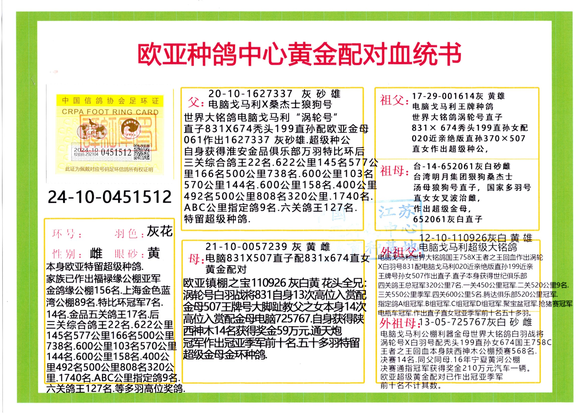24年秋南京特比環(huán)歐亞榮獲大團(tuán)體冠軍.小團(tuán)體冠軍551公里大特比13名.14名.16名.19名.20名.21名.24名.26名.27名.28名.42名.52名.54名.57名.65名.66名.68名.70名.71名.72名.74名.76名.80名.82名.83名.84名.85名.86名.90名.92名.110名.116名.121名.122名.128名.131名.158名.161名.164名.165名.166名.172名.174名.177名.182名.195名.196名.201名.205名.208名.210名.216名.253名.269名.275名.276名.294名.296名.299名,,24年秋云南天南銅都公棚決賽415名.天南銅都小棚決賽409名.云南玉活公棚決賽102名.490名.團(tuán)體32名上籠二羽進(jìn)二羽,天南銅都大棚506公里決賽445名。熱烈祝賀河北省巨鹿縣李蘭生老師用歐亞泰山號血系連續(xù)十一年奪冠軍,河北省國家賽冠軍.全國季軍等多次前十名高位,揚(yáng)州王軍王總用歐亞利奧24年春季獲山東翔宇公棚決賽33名蓋比53名。南京劉正龍劉總用歐亞蓋比獲得24年秋山東濰坊國際公棚決賽42名.精英賽30名.三關(guān)鴿王71名.決賽86名.加站賽16名.南京市特比環(huán)A組鴿王9名.B組鴿王5名.6名.C組鴿王5名.精英賽冠軍4名.技能賽A組冠軍4名.5名.秦淮區(qū)特比環(huán)榮獲15名.46名.48名.87名。四川西昌徐亮徐總用歐亞利奧獲得涼山州聚友決賽177名.第二關(guān)亞軍雙關(guān)鴿王19名.三關(guān)鴿王105名.云南豪庭公棚決賽603名。熱烈祝賀24年四川重慶翔園鴿舍用歐亞泰山號榮獲春季400公里冠軍.秋季500公里冠軍,河北王總用詹森X利奧獲得千羽千翔公棚400公里冠軍,廣東蔡楷煥榮獲24年秋愛好者 賽鴿俱樂部三關(guān)鴿王季軍.一關(guān)420公里99名.二關(guān)450公里11名.三關(guān)520公里32名.單關(guān)季軍.7名.12名,江西李衛(wèi)興榮獲貴州紅楓公棚8名.共翔俱樂部寄養(yǎng)棚四關(guān)綜合鴿王30名.一關(guān)400公里78名.二關(guān)500公里55名.三關(guān)520公里37名.四關(guān)500公里57名.同父母獲公棚18名.雷鳴獲得武漢黃浦育翔中心冠軍,四川陳文獲得四川明鴻俱樂部300公里夢幻2名.3名.4名.9名.10名.13名.14名.15名.31名.34名.40名.41名.42名.43名.69名.71名.72名.73名.74名.94名.95名.97名.98名.99名.419公里決賽榮獲總冠軍7名.總共歸巢9羽,四川徐亮獲豪庭決賽603名,山西鄭勇獲得山西泰鑫公棚決賽255名詹森紅狐,熱烈祝賀馬總獲得開爾(飛躍隊(duì))決賽9名獲獎金1310000萬元.第一關(guān)52名,天津津福資賽180公里96名.獲獎金429543萬元,歐亞支持全國鴿友24年秋多人報喜 祝大家取得更好成績,給歐亞報喜鴿友歐亞決定給每人贈送一羽超級種鴿。歐亞俱樂部特比環(huán)多關(guān)鴿王成績:15年秋淮安特比環(huán)黑色星期一全會上籠9700多羽,當(dāng)天無鴿歸巢,第二天全會歸巢357羽,本舍歸巢158羽.前十名八羽.前一百名歸巢57羽,16年春季獲五關(guān)鴿王總冠軍,總亞軍四名.六名.七名.九名.十名.晶藝俱樂部520公里冠亞季軍5名.6名.7名.9名.11名等,火車頭冠軍.季軍6名.8名.9名.10名,16年秋晶藝俱樂部特比環(huán)520公里亞軍.季軍4名.6名.7名.9名,15年春南京白下特比環(huán)冠軍.亞軍.季軍6名.7名.8名.9名.10名.指定鴿A B組獲得冠軍.亞軍.季軍4名.5名.,17年淮安特比環(huán)亞軍.4名.5名.7名.8名.10名.六關(guān)鴿王總冠軍.4名.6名.9名.10名,寄養(yǎng)棚宿遷劉總20羽特比環(huán)獲冠軍.季軍.4名.7名.8名.9名等。18年榮獲萬羽特比環(huán)六關(guān)鴿王總冠軍.總亞軍.總季軍.6名.8名.十名.單關(guān)四羽冠軍.二羽亞軍.四羽季軍.前十名27羽。19年秋萬羽特比環(huán)六關(guān)鴿王總亞軍.總季軍.5名.8名等,單關(guān)二羽冠軍.三羽亞軍.一羽季軍前十名31羽。20年秋淮安市鴿會四關(guān)特比環(huán)大賽風(fēng)雨無阻鴿王亞軍.鴿王六名,金品俱樂部萬羽特比環(huán)六關(guān)鴿王總冠軍,總亞軍.四名.五名.六名.七名.八名.十名.前二百名鴿王35羽,單關(guān)冠亞季軍前十名四十多羽,火車頭五關(guān)鴿王季軍.六名.八名.前二百名鴿王十七羽。20年春榮獲淮安五區(qū)一市四關(guān)鴿王總冠軍.亞軍.四名.八名.九名。21年秋榮獲金品萬羽特比環(huán)大賽六關(guān)鴿王總亞軍.總季軍.四名.七名.九名.十名.單關(guān)冠亞軍季軍前十名三十多羽;疖囶^協(xié)會鴿王六名.七名.十名.單關(guān)前十名十七羽。22年秋榮獲鴿王總冠軍.總亞軍.5名.7名.8名.9名.11名.單關(guān)冠亞季軍前十名三十多羽,第一關(guān)單關(guān)前二百名四十多羽,第二關(guān)前二百名三十多羽,第三關(guān)前二百名四十多羽,第四關(guān)前二百名四十多羽,第五關(guān)前一百名53羽。23年秋榮獲鴿王季軍.五名.八名.十名.13名.17名.20名.27名等多羽鴿王.單關(guān)前十名二十多羽。公棚.寄養(yǎng)棚部分成績:16年秋寧夏黃河公棚總冠軍電腦戈馬力指定通炮冠軍,17年送八羽參賽獲得鴿王八名進(jìn)獎四名,支持韓總榮獲八名。支持鴿友榮獲寧夏中衛(wèi)公棚決賽總冠軍.精英賽冠軍,支持18年寧夏黃河公棚決賽冠軍詹森X泰山。安徽鼎博寄養(yǎng)棚院內(nèi)外四關(guān)鴿王總冠軍.鴿王十七名.三十七名同窩,鴿王39名.42名.58名.67名。18年山東公棚預(yù)賽冠軍.決賽65名.送八羽進(jìn)獎五羽.指定獲奔馳汽車一輛。支持鴿友獲得云南藍(lán)云公棚冠軍.蓋比X佛卡門。支持鴿友榮獲云南銀集公棚決賽冠軍 詹森427X520血系 速度賽6700羽冠軍。17年榮獲金馬俱樂部寄養(yǎng)棚四關(guān)鴿王總冠軍.季軍.六名.八名.第一關(guān)冠軍.亞軍.季軍四名.七名.十一名.金牌教練獎。支