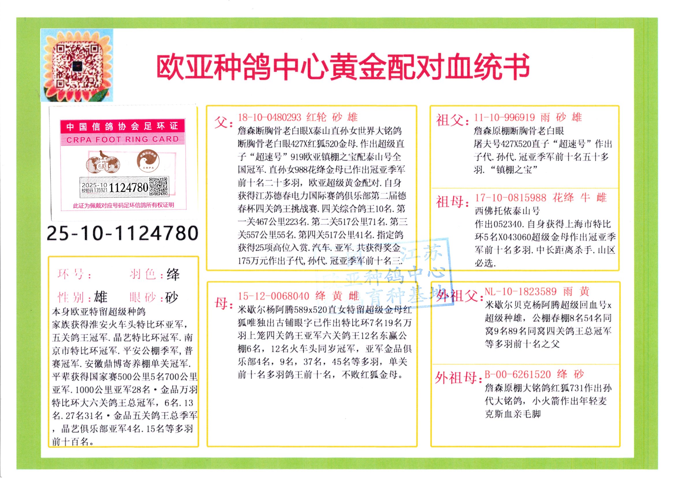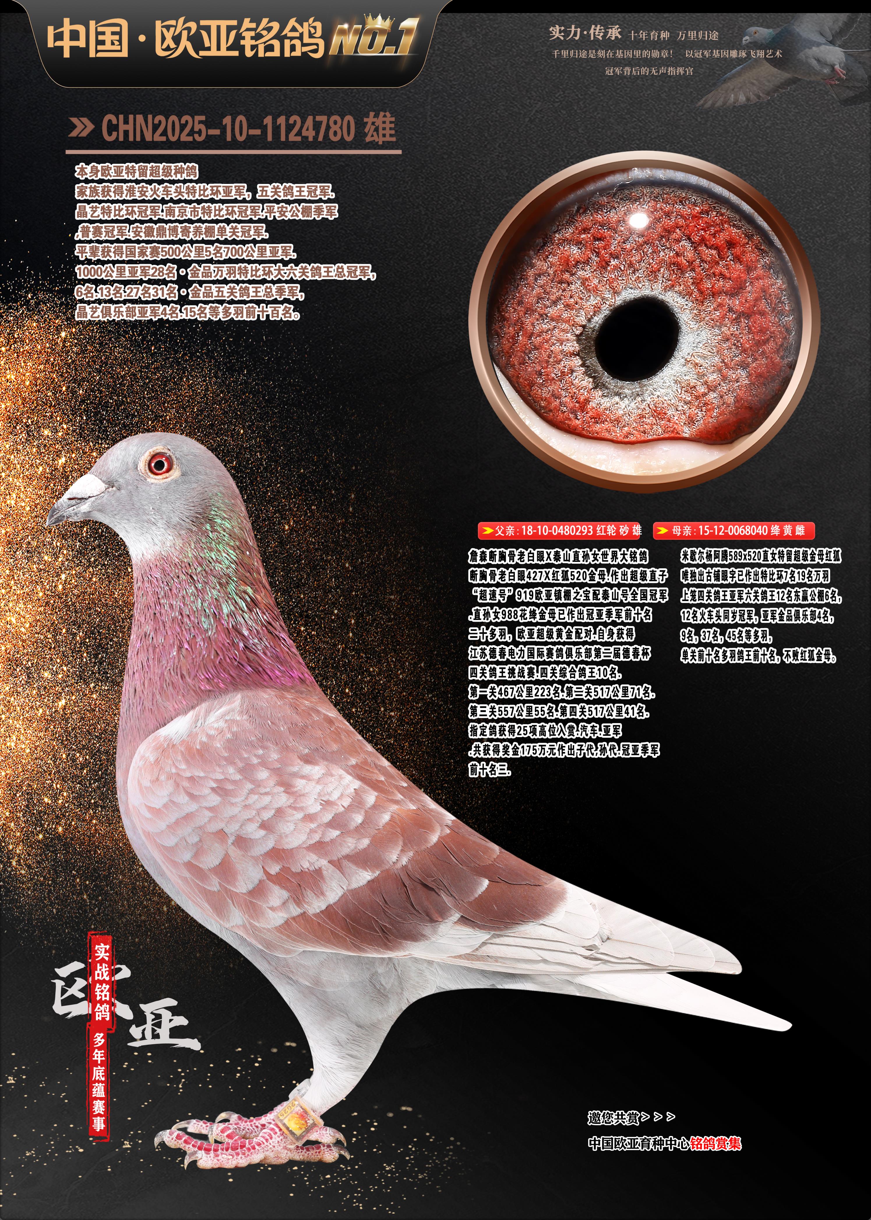 24年秋南京特比環(huán)歐亞榮獲大團(tuán)體冠軍.小團(tuán)體冠軍551公里大特比13名.14名.16名.19名.20名.21名.24名.26名.27名.28名.42名.52名.54名.57名.65名.66名.68名.70名.71名.72名.74名.76名.80名.82名.83名.84名.85名.86名.90名.92名.110名.116名.121名.122名.128名.131名.158名.161名.164名.165名.166名.172名.174名.177名.182名.195名.196名.201名.205名.208名.210名.216名.253名.269名.275名.276名.294名.296名.299名,,24年秋云南天南銅都公棚決賽415名.天南銅都小棚決賽409名.云南玉活公棚決賽102名.490名.團(tuán)體32名上籠二羽進(jìn)二羽,天南銅都大棚506公里決賽445名。熱烈祝賀河北省巨鹿縣李蘭生老師用歐亞泰山號血系連續(xù)十一年奪冠軍,河北省國家賽冠軍.全國季軍等多次前十名高位,揚州王軍王總用歐亞利奧24年春季獲山東翔宇公棚決賽33名蓋比53名。南京劉正龍劉總用歐亞蓋比獲得24年秋山東濰坊國際公棚決賽42名.精英賽30名.三關(guān)鴿王71名.決賽86名.加站賽16名.南京市特比環(huán)A組鴿王9名.B組鴿王5名.6名.C組鴿王5名.精英賽冠軍4名.技能賽A組冠軍4名.5名.秦淮區(qū)特比環(huán)榮獲15名.46名.48名.87名。四川西昌徐亮徐總用歐亞利奧獲得涼山州聚友決賽177名.第二關(guān)亞軍雙關(guān)鴿王19名.三關(guān)鴿王105名.云南豪庭公棚決賽603名。熱烈祝賀24年四川重慶翔園鴿舍用歐亞泰山號榮獲春季400公里冠軍.秋季500公里冠軍,河北王總用詹森X利奧獲得千羽千翔公棚400公里冠軍,廣東蔡楷煥榮獲24年秋愛好者 賽鴿俱樂部三關(guān)鴿王季軍.一關(guān)420公里99名.二關(guān)450公里11名.三關(guān)520公里32名.單關(guān)季軍.7名.12名,江西李衛(wèi)興榮獲貴州紅楓公棚8名.共翔俱樂部寄養(yǎng)棚四關(guān)綜合鴿王30名.一關(guān)400公里78名.二關(guān)500公里55名.三關(guān)520公里37名.四關(guān)500公里57名.同父母獲公棚18名.雷鳴獲得武漢黃浦育翔中心冠軍,四川陳文獲得四川明鴻俱樂部300公里夢幻2名.3名.4名.9名.10名.13名.14名.15名.31名.34名.40名.41名.42名.43名.69名.71名.72名.73名.74名.94名.95名.97名.98名.99名.419公里決賽榮獲總冠軍7名.總共歸巢9羽,四川徐亮獲豪庭決賽603名,山西鄭勇獲得山西泰鑫公棚決賽255名詹森紅狐,熱烈祝賀馬總獲得開爾(飛躍隊)決賽9名獲獎金1310000萬元.第一關(guān)52名,天津津福資賽180公里96名.獲獎金429543萬元,歐亞支持全國鴿友24年秋多人報喜 祝大家取得更好成績,給歐亞報喜鴿友歐亞決定給每人贈送一羽超級種鴿。歐亞俱樂部特比環(huán)多關(guān)鴿王成績:15年秋淮安特比環(huán)黑色星期一全會上籠9700多羽,當(dāng)天無鴿歸巢,第二天全會歸巢357羽,本舍歸巢158羽.前十名八羽.前一百名歸巢57羽,16年春季獲五關(guān)鴿王總冠軍,總亞軍四名.六名.七名.九名.十名.晶藝俱樂部520公里冠亞季軍5名.6名.7名.9名.11名等,火車頭冠軍.季軍6名.8名.9名.10名,16年秋晶藝俱樂部特比環(huán)520公里亞軍.季軍4名.6名.7名.9名,15年春南京白下特比環(huán)冠軍.亞軍.季軍6名.7名.8名.9名.10名.指定鴿A B組獲得冠軍.亞軍.季軍4名.5名.,17年淮安特比環(huán)亞軍.4名.5名.7名.8名.10名.六關(guān)鴿王總冠軍.4名.6名.9名.10名,寄養(yǎng)棚宿遷劉總20羽特比環(huán)獲冠軍.季軍.4名.7名.8名.9名等。18年榮獲萬羽特比環(huán)六關(guān)鴿王總冠軍.總亞軍.總季軍.6名.8名.十名.單關(guān)四羽冠軍.二羽亞軍.四羽季軍.前十名27羽。19年秋萬羽特比環(huán)六關(guān)鴿王總亞軍.總季軍.5名.8名等,單關(guān)二羽冠軍.三羽亞軍.一羽季軍前十名31羽。20年秋淮安市鴿會四關(guān)特比環(huán)大賽風(fēng)雨無阻鴿王亞軍.鴿王六名,金品俱樂部萬羽特比環(huán)六關(guān)鴿王總冠軍,總亞軍.四名.五名.六名.七名.八名.十名.前二百名鴿王35羽,單關(guān)冠亞季軍前十名四十多羽,火車頭五關(guān)鴿王季軍.六名.八名.前二百名鴿王十七羽。20年春榮獲淮安五區(qū)一市四關(guān)鴿王總冠軍.亞軍.四名.八名.九名。21年秋榮獲金品萬羽特比環(huán)大賽六關(guān)鴿王總亞軍.總季軍.四名.七名.九名.十名.單關(guān)冠亞軍季軍前十名三十多羽;疖囶^協(xié)會鴿王六名.七名.十名.單關(guān)前十名十七羽。22年秋榮獲鴿王總冠軍.總亞軍.5名.7名.8名.9名.11名.單關(guān)冠亞季軍前十名三十多羽,第一關(guān)單關(guān)前二百名四十多羽,第二關(guān)前二百名三十多羽,第三關(guān)前二百名四十多羽,第四關(guān)前二百名四十多羽,第五關(guān)前一百名53羽。23年秋榮獲鴿王季軍.五名.八名.十名.13名.17名.20名.27名等多羽鴿王.單關(guān)前十名二十多羽。公棚.寄養(yǎng)棚部分成績:16年秋寧夏黃河公棚總冠軍電腦戈馬力指定通炮冠軍,17年送八羽參賽獲得鴿王八名進(jìn)獎四名,支持韓總榮獲八名。支持鴿友榮獲寧夏中衛(wèi)公棚決賽總冠軍.精英賽冠軍,支持18年寧夏黃河公棚決賽冠軍詹森X泰山。安徽鼎博寄養(yǎng)棚院內(nèi)外四關(guān)鴿王總冠軍.鴿王十七名.三十七名同窩,鴿王39名.42名.58名.67名。18年山東公棚預(yù)賽冠軍.決賽65名.送八羽進(jìn)獎五羽.指定獲奔馳汽車一輛。支持鴿友獲得云南藍(lán)云公棚冠軍.蓋比X佛卡門。支持鴿友榮獲云南銀集公棚決賽冠軍 詹森427X520血系 速度賽6700羽冠軍。17年榮獲金馬俱樂部寄養(yǎng)棚四關(guān)鴿王總冠軍.季軍.六名.八名.第一關(guān)冠軍.亞軍.季軍四名.七名.十一名.金牌教練獎。支持鴿友18