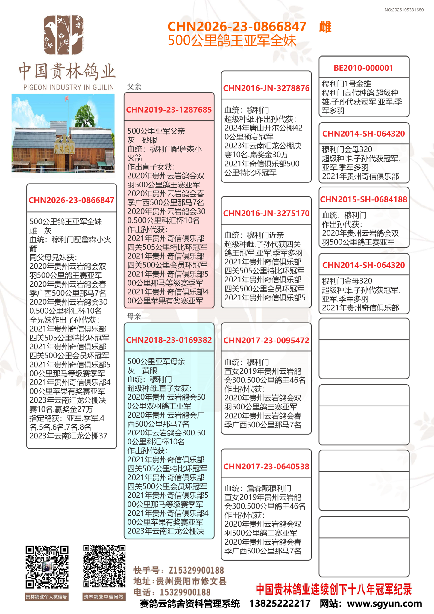 | 1651471 | 北京惠翔公棚冠軍直子配惠翔公棚冠軍直女.平輩獲冠亞季軍多羽 | ¥600元 | 0次 |