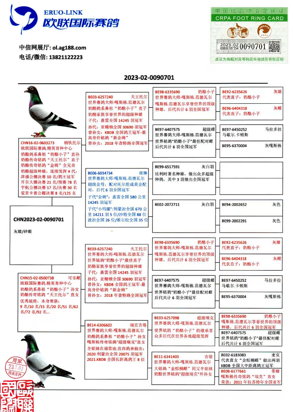 | 1651545 | 長城鴿業(yè)20年開創(chuàng)四關(guān)綜合亞軍母親平輩,金鼎長城亞軍直子 | ¥1100元 | 11次 |