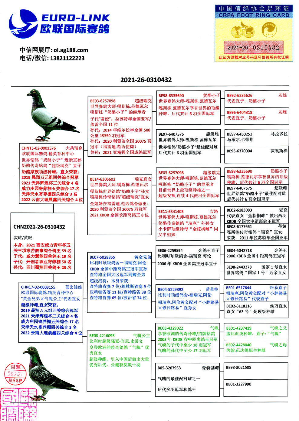 | 1652320 | 世界銘鴿最佳基特爾近親外孫 | ¥4200元 | 5次 |