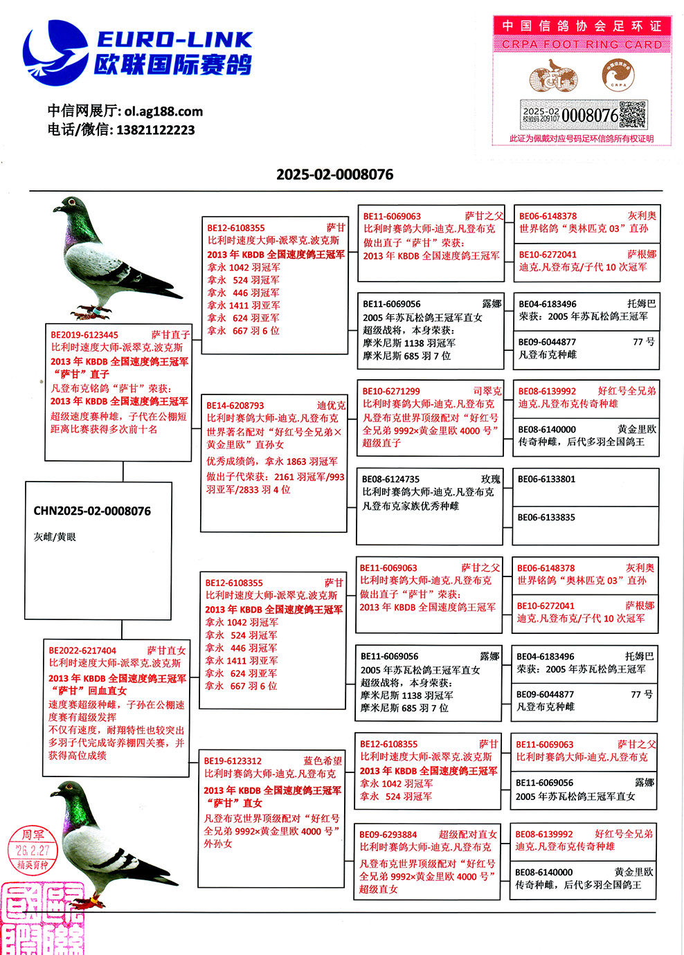 - 當前查看拍賣鴿:范登布克鴿王冠軍薩甘近親