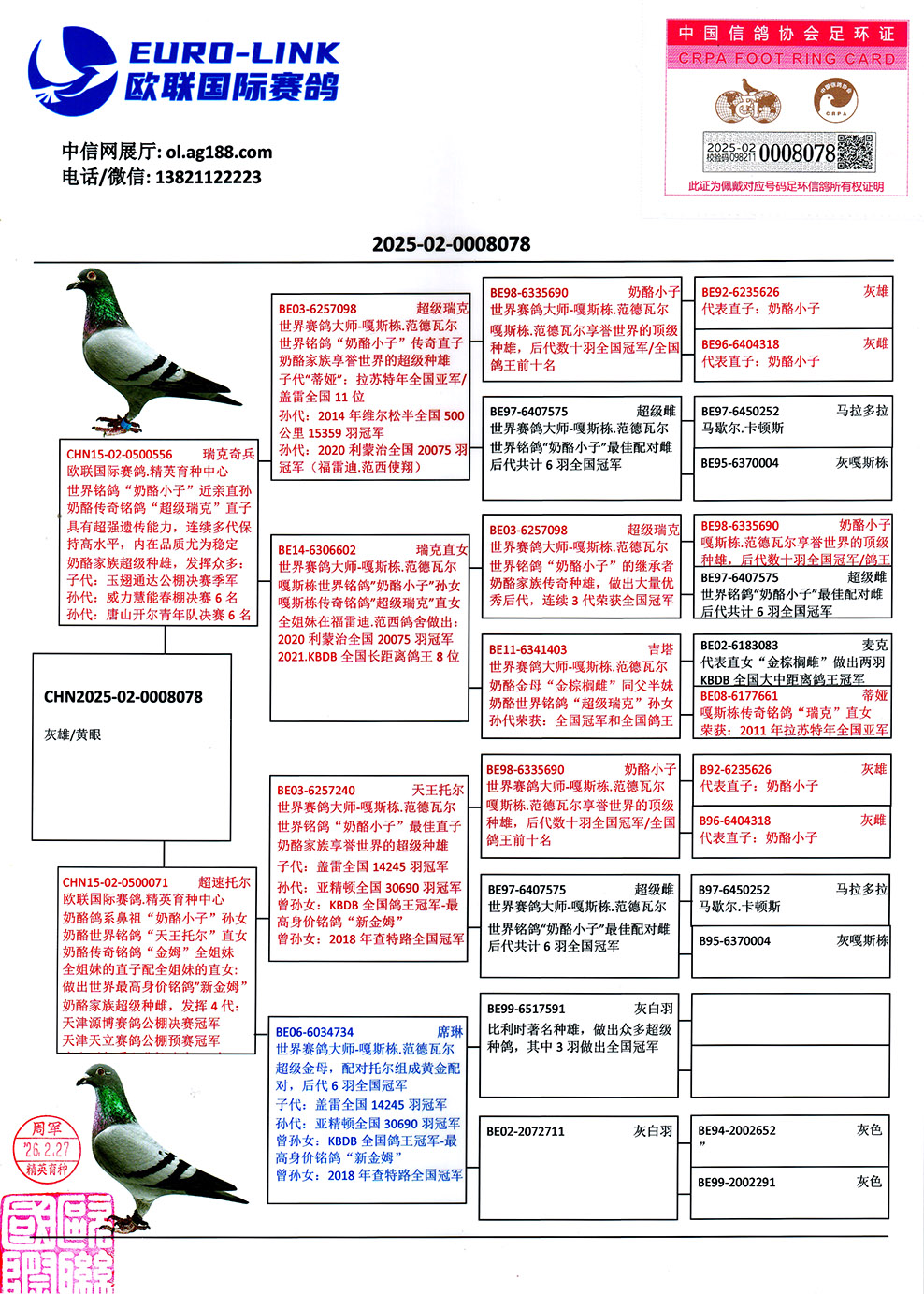 | 1652315 | 奶酪五關(guān)鴿王/098直孫女 | ¥4200元 | 5次 |