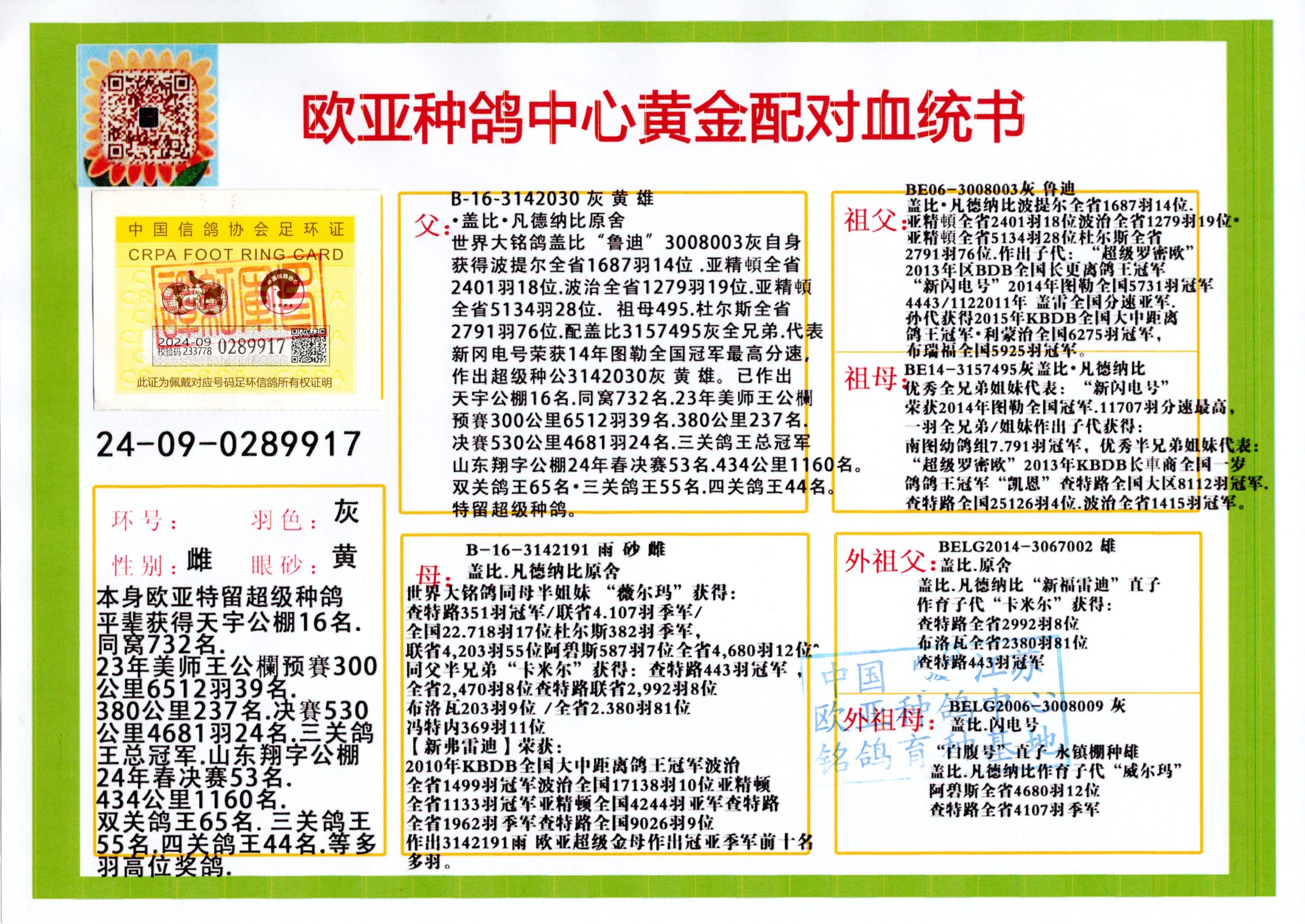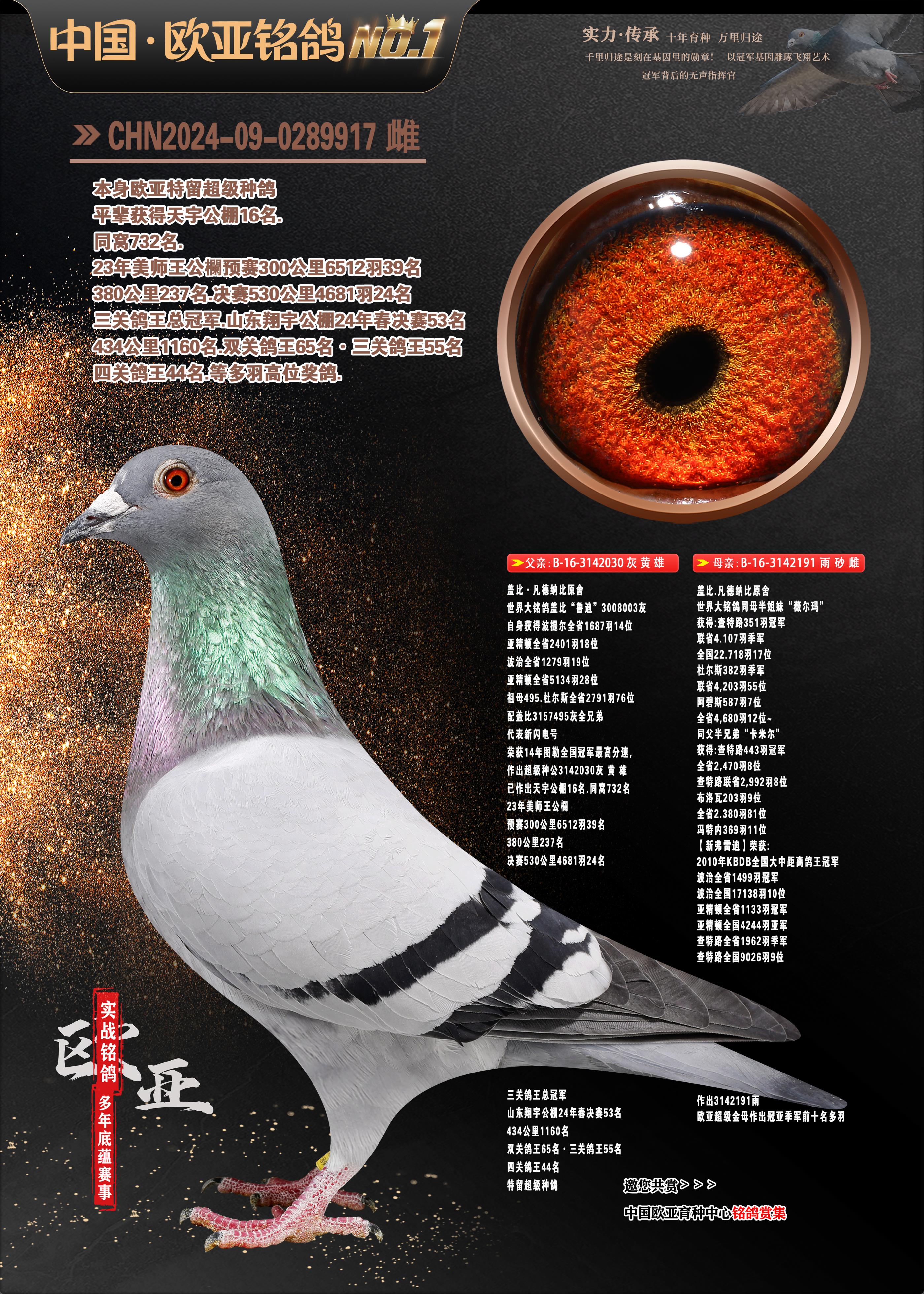 24年秋南京特比環(huán)歐亞榮獲大團(tuán)體冠軍.小團(tuán)體冠軍551公里大特比13名.14名.16名.19名.20名.21名.24名.26名.27名.28名.42名.52名.54名.57名.65名.66名.68名.70名.71名.72名.74名.76名.80名.82名.83名.84名.85名.86名.90名.92名.110名.116名.121名.122名.128名.131名.158名.161名.164名.165名.166名.172名.174名.177名.182名.195名.196名.201名.205名.208名.210名.216名.253名.269名.275名.276名.294名.296名.299名,,24年秋云南天南銅都公棚決賽415名.天南銅都小棚決賽409名.云南玉活公棚決賽102名.490名.團(tuán)體32名上籠二羽進(jìn)二羽,天南銅都大棚506公里決賽445名。熱烈祝賀河北省巨鹿縣李蘭生老師用歐亞泰山號(hào)血系連續(xù)十一年奪冠軍,河北省國家賽冠軍.全國季軍等多次前十名高位,揚(yáng)州王軍王總用歐亞利奧24年春季獲山東翔宇公棚決賽33名蓋比53名。南京劉正龍劉總用歐亞蓋比獲得24年秋山東濰坊國際公棚決賽42名.精英賽30名.三關(guān)鴿王71名.決賽86名.加站賽16名.南京市特比環(huán)A組鴿王9名.B組鴿王5名.6名.C組鴿王5名.精英賽冠軍4名.技能賽A組冠軍4名.5名.秦淮區(qū)特比環(huán)榮獲15名.46名.48名.87名。四川西昌徐亮徐總用歐亞利奧獲得涼山州聚友決賽177名.第二關(guān)亞軍雙關(guān)鴿王19名.三關(guān)鴿王105名.云南豪庭公棚決賽603名。熱烈祝賀24年四川重慶翔園鴿舍用歐亞泰山號(hào)榮獲春季400公里冠軍.秋季500公里冠軍,河北王總用詹森X利奧獲得千羽千翔公棚400公里冠軍,廣東蔡楷煥榮獲24年秋愛好者 賽鴿俱樂部三關(guān)鴿王季軍.一關(guān)420公里99名.二關(guān)450公里11名.三關(guān)520公里32名.單關(guān)季軍.7名.12名,江西李衛(wèi)興榮獲貴州紅楓公棚8名.共翔俱樂部寄養(yǎng)棚四關(guān)綜合鴿王30名.一關(guān)400公里78名.二關(guān)500公里55名.三關(guān)520公里37名.四關(guān)500公里57名.同父母獲公棚18名.雷鳴獲得武漢黃浦育翔中心冠軍,四川陳文獲得四川明鴻俱樂部300公里夢幻2名.3名.4名.9名.10名.13名.14名.15名.31名.34名.40名.41名.42名.43名.69名.71名.72名.73名.74名.94名.95名.97名.98名.99名.419公里決賽榮獲總冠軍7名.總共歸巢9羽,四川徐亮獲豪庭決賽603名,山西鄭勇獲得山西泰鑫公棚決賽255名詹森紅狐,熱烈祝賀馬總獲得開爾(飛躍隊(duì))決賽9名獲獎(jiǎng)金1310000萬元.第一關(guān)52名,天津津福資賽180公里96名.獲獎(jiǎng)金429543萬元,歐亞支持全國鴿友24年秋多人報(bào)喜 祝大家取得更好成績,給歐亞報(bào)喜鴿友歐亞決定給每人贈(zèng)送一羽超級(jí)種鴿。歐亞俱樂部特比環(huán)多關(guān)鴿王成績:15年秋淮安特比環(huán)黑色星期一全會(huì)上籠9700多羽,當(dāng)天無鴿歸巢,第二天全會(huì)歸巢357羽,本舍歸巢158羽.前十名八羽.前一百名歸巢57羽,16年春季獲五關(guān)鴿王總冠軍,總亞軍四名.六名.七名.九名.十名.晶藝俱樂部520公里冠亞季軍5名.6名.7名.9名.11名等,火車頭冠軍.季軍6名.8名.9名.10名,16年秋晶藝俱樂部特比環(huán)520公里亞軍.季軍4名.6名.7名.9名,15年春南京白下特比環(huán)冠軍.亞軍.季軍6名.7名.8名.9名.10名.指定鴿A B組獲得冠軍.亞軍.季軍4名.5名.,17年淮安特比環(huán)亞軍.4名.5名.7名.8名.10名.六關(guān)鴿王總冠軍.4名.6名.9名.10名,寄養(yǎng)棚宿遷劉總20羽特比環(huán)獲冠軍.季軍.4名.7名.8名.9名等。18年榮獲萬羽特比環(huán)六關(guān)鴿王總冠軍.總亞軍.總季軍.6名.8名.十名.單關(guān)四羽冠軍.二羽亞軍.四羽季軍.前十名27羽。19年秋萬羽特比環(huán)六關(guān)鴿王總亞軍.總季軍.5名.8名等,單關(guān)二羽冠軍.三羽亞軍.一羽季軍前十名31羽。20年秋淮安市鴿會(huì)四關(guān)特比環(huán)大賽風(fēng)雨無阻鴿王亞軍.鴿王六名,金品俱樂部萬羽特比環(huán)六關(guān)鴿王總冠軍,總亞軍.四名.五名.六名.七名.八名.十名.前二百名鴿王35羽,單關(guān)冠亞季軍前十名四十多羽,火車頭五關(guān)鴿王季軍.六名.八名.前二百名鴿王十七羽。20年春榮獲淮安五區(qū)一市四關(guān)鴿王總冠軍.亞軍.四名.八名.九名。21年秋榮獲金品萬羽特比環(huán)大賽六關(guān)鴿王總亞軍.總季軍.四名.七名.九名.十名.單關(guān)冠亞軍季軍前十名三十多羽。火車頭協(xié)會(huì)鴿王六名.七名.十名.單關(guān)前十名十七羽。22年秋榮獲鴿王總冠軍.總亞軍.5名.7名.8名.9名.11名.單關(guān)冠亞季軍前十名三十多羽,第一關(guān)單關(guān)前二百名四十多羽,第二關(guān)前二百名三十多羽,第三關(guān)前二百名四十多羽,第四關(guān)前二百名四十多羽,第五關(guān)前一百名53羽。23年秋榮獲鴿王季軍.五名.八名.十名.13名.17名.20名.27名等多羽鴿王.單關(guān)前十名二十多羽。公棚.寄養(yǎng)棚部分成績:16年秋寧夏黃河公棚總冠軍電腦戈馬力指定通炮冠軍,17年送八羽參賽獲得鴿王八名進(jìn)獎(jiǎng)四名,支持韓總榮獲八名。支持鴿友榮獲寧夏中衛(wèi)公棚決賽總冠軍.精英賽冠軍,支持18年寧夏黃河公棚決賽冠軍詹森X泰山。安徽鼎博寄養(yǎng)棚院內(nèi)外四關(guān)鴿王總冠軍.鴿王十七名.三十七名同窩,鴿王39名.42名.58名.67名。18年山東公棚預(yù)賽冠軍.決賽65名.送八羽進(jìn)獎(jiǎng)五羽.指定獲奔馳汽車一輛。支持鴿友獲得云南藍(lán)云公棚冠軍.蓋比X佛卡門。支持鴿友榮獲云南銀集公棚決賽冠軍 詹森427X520血系 速度賽6700羽冠軍。17年榮獲金馬俱樂部寄養(yǎng)棚四關(guān)鴿王總冠軍.季軍
