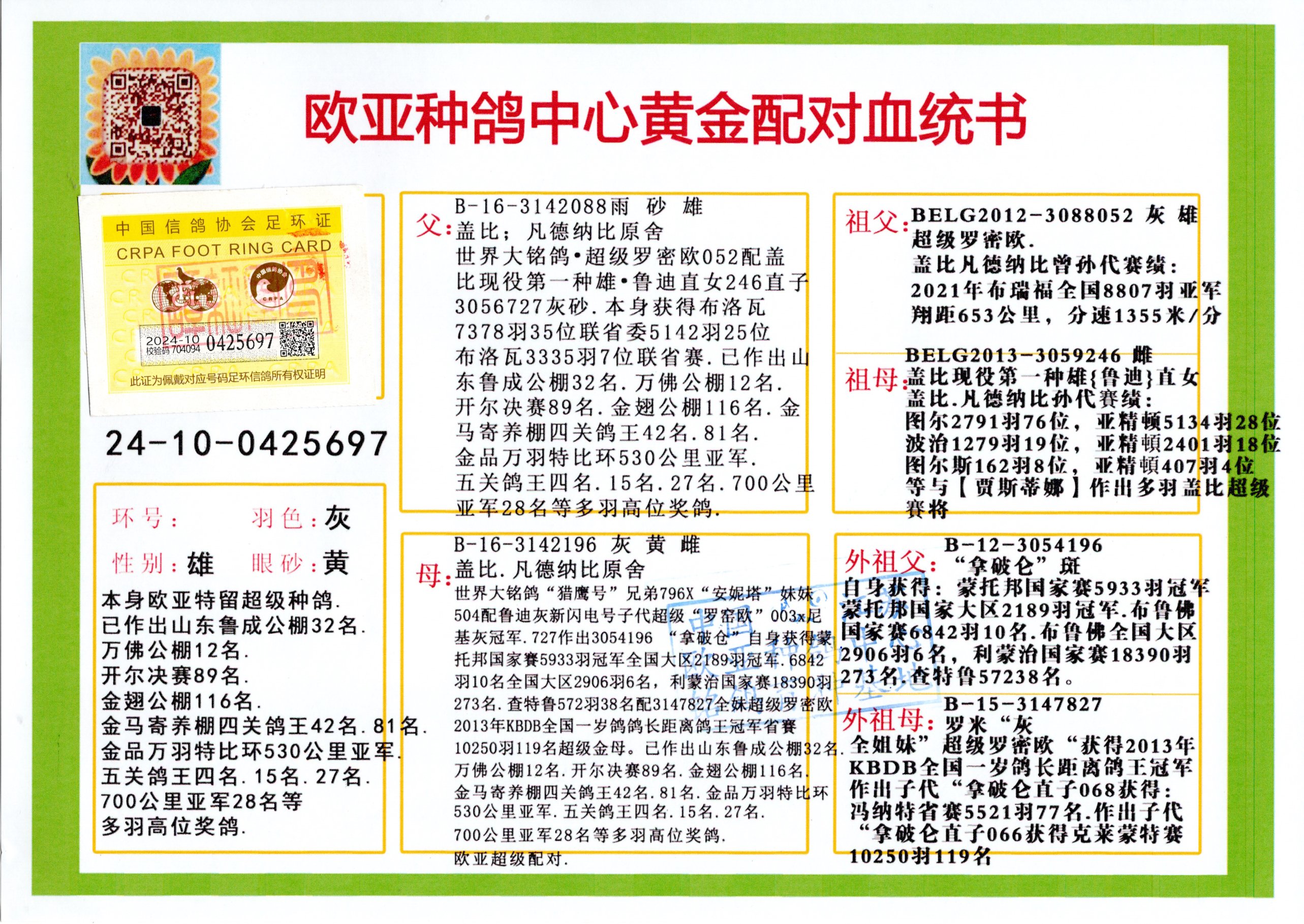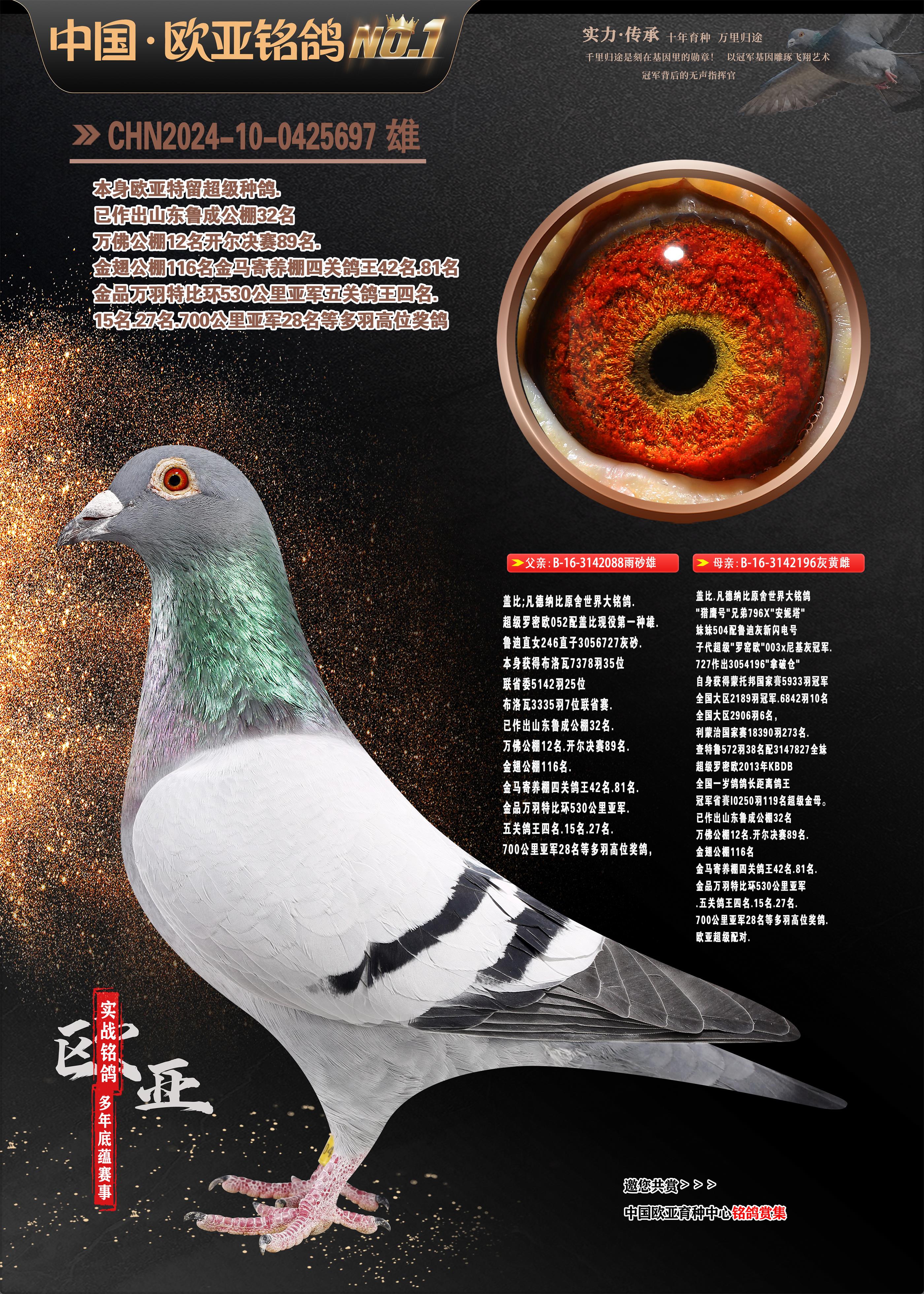 24年秋南京特比環(huán)歐亞榮獲大團(tuán)體冠軍.小團(tuán)體冠軍551公里大特比13名.14名.16名.19名.20名.21名.24名.26名.27名.28名.42名.52名.54名.57名.65名.66名.68名.70名.71名.72名.74名.76名.80名.82名.83名.84名.85名.86名.90名.92名.110名.116名.121名.122名.128名.131名.158名.161名.164名.165名.166名.172名.174名.177名.182名.195名.196名.201名.205名.208名.210名.216名.253名.269名.275名.276名.294名.296名.299名,,24年秋云南天南銅都公棚決賽415名.天南銅都小棚決賽409名.云南玉活公棚決賽102名.490名.團(tuán)體32名上籠二羽進(jìn)二羽,天南銅都大棚506公里決賽445名。熱烈祝賀河北省巨鹿縣李蘭生老師用歐亞泰山號血系連續(xù)十一年奪冠軍,河北省國家賽冠軍.全國季軍等多次前十名高位,揚(yáng)州王軍王總用歐亞利奧24年春季獲山東翔宇公棚決賽33名蓋比53名。南京劉正龍劉總用歐亞蓋比獲得24年秋山東濰坊國際公棚決賽42名.精英賽30名.三關(guān)鴿王71名.決賽86名.加站賽16名.南京市特比環(huán)A組鴿王9名.B組鴿王5名.6名.C組鴿王5名.精英賽冠軍4名.技能賽A組冠軍4名.5名.秦淮區(qū)特比環(huán)榮獲15名.46名.48名.87名。四川西昌徐亮徐總用歐亞利奧獲得涼山州聚友決賽177名.第二關(guān)亞軍雙關(guān)鴿王19名.三關(guān)鴿王105名.云南豪庭公棚決賽603名。熱烈祝賀24年四川重慶翔園鴿舍用歐亞泰山號榮獲春季400公里冠軍.秋季500公里冠軍,河北王總用詹森X利奧獲得千羽千翔公棚400公里冠軍,廣東蔡楷煥榮獲24年秋愛好者 賽鴿俱樂部三關(guān)鴿王季軍.一關(guān)420公里99名.二關(guān)450公里11名.三關(guān)520公里32名.單關(guān)季軍.7名.12名,江西李衛(wèi)興榮獲貴州紅楓公棚8名.共翔俱樂部寄養(yǎng)棚四關(guān)綜合鴿王30名.一關(guān)400公里78名.二關(guān)500公里55名.三關(guān)520公里37名.四關(guān)500公里57名.同父母獲公棚18名.雷鳴獲得武漢黃浦育翔中心冠軍,四川陳文獲得四川明鴻俱樂部300公里夢幻2名.3名.4名.9名.10名.13名.14名.15名.31名.34名.40名.41名.42名.43名.69名.71名.72名.73名.74名.94名.95名.97名.98名.99名.419公里決賽榮獲總冠軍7名.總共歸巢9羽,四川徐亮獲豪庭決賽603名,山西鄭勇獲得山西泰鑫公棚決賽255名詹森紅狐,熱烈祝賀馬總獲得開爾(飛躍隊(duì))決賽9名獲獎金1310000萬元.第一關(guān)52名,天津津福資賽180公里96名.獲獎金429543萬元,歐亞支持全國鴿友24年秋多人報(bào)喜 祝大家取得更好成績,給歐亞報(bào)喜鴿友歐亞決定給每人贈送一羽超級種鴿。歐亞俱樂部特比環(huán)多關(guān)鴿王成績:15年秋淮安特比環(huán)黑色星期一全會上籠9700多羽,當(dāng)天無鴿歸巢,第二天全會歸巢357羽,本舍歸巢158羽.前十名八羽.前一百名歸巢57羽,16年春季獲五關(guān)鴿王總冠軍,總亞軍四名.六名.七名.九名.十名.晶藝俱樂部520公里冠亞季軍5名.6名.7名.9名.11名等,火車頭冠軍.季軍6名.8名.9名.10名,16年秋晶藝俱樂部特比環(huán)520公里亞軍.季軍4名.6名.7名.9名,15年春南京白下特比環(huán)冠軍.亞軍.季軍6名.7名.8名.9名.10名.指定鴿A B組獲得冠軍.亞軍.季軍4名.5名.,17年淮安特比環(huán)亞軍.4名.5名.7名.8名.10名.六關(guān)鴿王總冠軍.4名.6名.9名.10名,寄養(yǎng)棚宿遷劉總20羽特比環(huán)獲冠軍.季軍.4名.7名.8名.9名等。18年榮獲萬羽特比環(huán)六關(guān)鴿王總冠軍.總亞軍.總季軍.6名.8名.十名.單關(guān)四羽冠軍.二羽亞軍.四羽季軍.前十名27羽。19年秋萬羽特比環(huán)六關(guān)鴿王總亞軍.總季軍.5名.8名等,單關(guān)二羽冠軍.三羽亞軍.一羽季軍前十名31羽。20年秋淮安市鴿會四關(guān)特比環(huán)大賽風(fēng)雨無阻鴿王亞軍.鴿王六名,金品俱樂部萬羽特比環(huán)六關(guān)鴿王總冠軍,總亞軍.四名.五名.六名.七名.八名.十名.前二百名鴿王35羽,單關(guān)冠亞季軍前十名四十多羽,火車頭五關(guān)鴿王季軍.六名.八名.前二百名鴿王十七羽。20年春榮獲淮安五區(qū)一市四關(guān)鴿王總冠軍.亞軍.四名.八名.九名。21年秋榮獲金品萬羽特比環(huán)大賽六關(guān)鴿王總亞軍.總季軍.四名.七名.九名.十名.單關(guān)冠亞軍季軍前十名三十多羽;疖囶^協(xié)會鴿王六名.七名.十名.單關(guān)前十名十七羽。22年秋榮獲鴿王總冠軍.總亞軍.5名.7名.8名.9名.11名.單關(guān)冠亞季軍前十名三十多羽,第一關(guān)單關(guān)前二百名四十多羽,第二關(guān)前二百名三十多羽,第三關(guān)前二百名四十多羽,第四關(guān)前二百名四十多羽,第五關(guān)前一百名53羽。23年秋榮獲鴿王季軍.五名.八名.十名.13名.17名.20名.27名等多羽鴿王.單關(guān)前十名二十多羽。公棚.寄養(yǎng)棚部分成績:16年秋寧夏黃河公棚總冠軍電腦戈馬力指定通炮冠軍,17年送八羽參賽獲得鴿王八名進(jìn)獎四名,支持韓總榮獲八名。支持鴿友榮獲寧夏中衛(wèi)公棚決賽總冠軍.精英賽冠軍,支持18年寧夏黃河公棚決賽冠軍詹森X泰山。安徽鼎博寄養(yǎng)棚院內(nèi)外四關(guān)鴿王總冠軍.鴿王十七名.三十七名同窩,鴿王39名.42名.58名.67名。18年山東公棚預(yù)賽冠軍.決賽65名.送八羽進(jìn)獎五羽.指定獲奔馳汽車一輛。支持鴿友獲得云南藍(lán)云公棚冠軍.蓋比X佛卡門。支持鴿友榮獲云南銀集公棚決賽冠軍 詹森427X520血系 速度賽6700羽冠軍。17年榮獲金馬俱樂部寄養(yǎng)棚四關(guān)鴿王總冠軍.季軍.六名.八名.第一關(guān)冠軍.亞軍.季軍四名.七名.十一名.金牌教