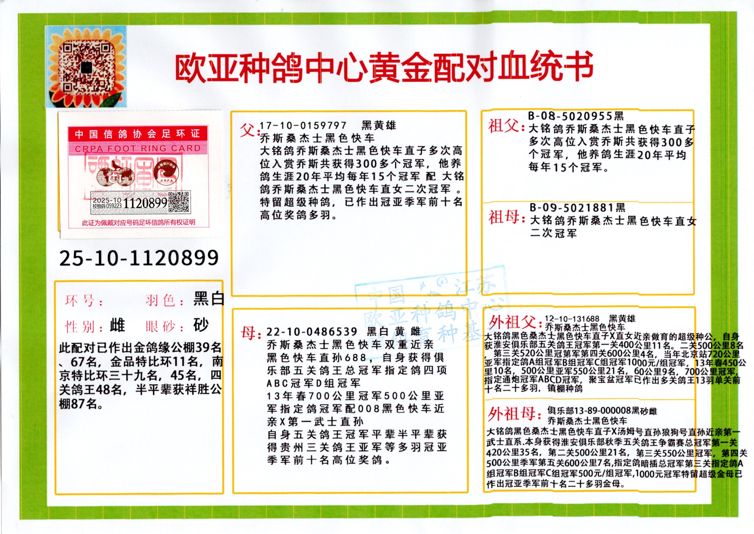 24年秋南京特比環(huán)歐亞榮獲大團(tuán)體冠軍.小團(tuán)體冠軍551公里大特比13名.14名.16名.19名.20名.21名.24名.26名.27名.28名.42名.52名.54名.57名.65名.66名.68名.70名.71名.72名.74名.76名.80名.82名.83名.84名.85名.86名.90名.92名.110名.116名.121名.122名.128名.131名.158名.161名.164名.165名.166名.172名.174名.177名.182名.195名.196名.201名.205名.208名.210名.216名.253名.269名.275名.276名.294名.296名.299名,,24年秋云南天南銅都公棚決賽415名.天南銅都小棚決賽409名.云南玉活公棚決賽102名.490名.團(tuán)體32名上籠二羽進(jìn)二羽,天南銅都大棚506公里決賽445名。熱烈祝賀河北省巨鹿縣李蘭生老師用歐亞泰山號(hào)血系連續(xù)十一年奪冠軍,河北省國家賽冠軍.全國季軍等多次前十名高位,揚(yáng)州王軍王總用歐亞利奧24年春季獲山東翔宇公棚決賽33名蓋比53名。南京劉正龍劉總用歐亞蓋比獲得24年秋山東濰坊國際公棚決賽42名.精英賽30名.三關(guān)鴿王71名.決賽86名.加站賽16名.南京市特比環(huán)A組鴿王9名.B組鴿王5名.6名.C組鴿王5名.精英賽冠軍4名.技能賽A組冠軍4名.5名.秦淮區(qū)特比環(huán)榮獲15名.46名.48名.87名。四川西昌徐亮徐總用歐亞利奧獲得涼山州聚友決賽177名.第二關(guān)亞軍雙關(guān)鴿王19名.三關(guān)鴿王105名.云南豪庭公棚決賽603名。熱烈祝賀24年四川重慶翔園鴿舍用歐亞泰山號(hào)榮獲春季400公里冠軍.秋季500公里冠軍,河北王總用詹森X利奧獲得千羽千翔公棚400公里冠軍,廣東蔡楷煥榮獲24年秋愛好者 賽鴿俱樂部三關(guān)鴿王季軍.一關(guān)420公里99名.二關(guān)450公里11名.三關(guān)520公里32名.單關(guān)季軍.7名.12名,江西李衛(wèi)興榮獲貴州紅楓公棚8名.共翔俱樂部寄養(yǎng)棚四關(guān)綜合鴿王30名.一關(guān)400公里78名.二關(guān)500公里55名.三關(guān)520公里37名.四關(guān)500公里57名.同父母獲公棚18名.雷鳴獲得武漢黃浦育翔中心冠軍,四川陳文獲得四川明鴻俱樂部300公里夢幻2名.3名.4名.9名.10名.13名.14名.15名.31名.34名.40名.41名.42名.43名.69名.71名.72名.73名.74名.94名.95名.97名.98名.99名.419公里決賽榮獲總冠軍7名.總共歸巢9羽,四川徐亮獲豪庭決賽603名,山西鄭勇獲得山西泰鑫公棚決賽255名詹森紅狐,熱烈祝賀馬總獲得開爾(飛躍隊(duì))決賽9名獲獎(jiǎng)金1310000萬元.第一關(guān)52名,天津津福資賽180公里96名.獲獎(jiǎng)金429543萬元,歐亞支持全國鴿友24年秋多人報(bào)喜 祝大家取得更好成績,給歐亞報(bào)喜鴿友歐亞決定給每人贈(zèng)送一羽超級(jí)種鴿。歐亞俱樂部特比環(huán)多關(guān)鴿王成績:15年秋淮安特比環(huán)黑色星期一全會(huì)上籠9700多羽,當(dāng)天無鴿歸巢,第二天全會(huì)歸巢357羽,本舍歸巢158羽.前十名八羽.前一百名歸巢57羽,16年春季獲五關(guān)鴿王總冠軍,總亞軍四名.六名.七名.九名.十名.晶藝俱樂部520公里冠亞季軍5名.6名.7名.9名.11名等,火車頭冠軍.季軍6名.8名.9名.10名,16年秋晶藝俱樂部特比環(huán)520公里亞軍.季軍4名.6名.7名.9名,15年春南京白下特比環(huán)冠軍.亞軍.季軍6名.7名.8名.9名.10名.指定鴿A B組獲得冠軍.亞軍.季軍4名.5名.,17年淮安特比環(huán)亞軍.4名.5名.7名.8名.10名.六關(guān)鴿王總冠軍.4名.6名.9名.10名,寄養(yǎng)棚宿遷劉總20羽特比環(huán)獲冠軍.季軍.4名.7名.8名.9名等。18年榮獲萬羽特比環(huán)六關(guān)鴿王總冠軍.總亞軍.總季軍.6名.8名.十名.單關(guān)四羽冠軍.二羽亞軍.四羽季軍.前十名27羽。19年秋萬羽特比環(huán)六關(guān)鴿王總亞軍.總季軍.5名.8名等,單關(guān)二羽冠軍.三羽亞軍.一羽季軍前十名31羽。20年秋淮安市鴿會(huì)四關(guān)特比環(huán)大賽風(fēng)雨無阻鴿王亞軍.鴿王六名,金品俱樂部萬羽特比環(huán)六關(guān)鴿王總冠軍,總亞軍.四名.五名.六名.七名.八名.十名.前二百名鴿王35羽,單關(guān)冠亞季軍前十名四十多羽,火車頭五關(guān)鴿王季軍.六名.八名.前二百名鴿王十七羽。20年春榮獲淮安五區(qū)一市四關(guān)鴿王總冠軍.亞軍.四名.八名.九名。21年秋榮獲金品萬羽特比環(huán)大賽六關(guān)鴿王總亞軍.總季軍.四名.七名.九名.十名.單關(guān)冠亞軍季軍前十名三十多羽;疖囶^協(xié)會(huì)鴿王六名.七名.十名.單關(guān)前十名十七羽。22年秋榮獲鴿王總冠軍.總亞軍.5名.7名.8名.9名.11名.單關(guān)冠亞季軍前十名三十多羽,第一關(guān)單關(guān)前二百名四十多羽,第二關(guān)前二百名三十多羽,第三關(guān)前二百名四十多羽,第四關(guān)前二百名四十多羽,第五關(guān)前一百名53羽。23年秋榮獲鴿王季軍.五名.八名.十名.13名.17名.20名.27名等多羽鴿王.單關(guān)前十名二十多羽。公棚.寄養(yǎng)棚部分成績:16年秋寧夏黃河公棚總冠軍電腦戈馬力指定通炮冠軍,17年送八羽參賽獲得鴿王八名進(jìn)獎(jiǎng)四名,支持韓總榮獲八名。支持鴿友榮獲寧夏中衛(wèi)公棚決賽總冠軍.精英賽冠軍,支持18年寧夏黃河公棚決賽冠軍詹森X泰山。安徽鼎博寄養(yǎng)棚院內(nèi)外四關(guān)鴿王總冠軍.鴿王十七名.三十七名同窩,鴿王39名.42名.58名.67名。18年山東公棚預(yù)賽冠軍.決賽65名.送八羽進(jìn)獎(jiǎng)五羽.指定獲奔馳汽車一輛。支持鴿友獲得云南藍(lán)云公棚冠軍.蓋比X佛卡門。支持鴿友榮獲云南銀集公棚決賽冠軍 詹森427X520血系 速度賽6700羽冠軍。17年榮獲金馬俱樂部寄養(yǎng)棚四關(guān)鴿王總冠軍.季軍.六