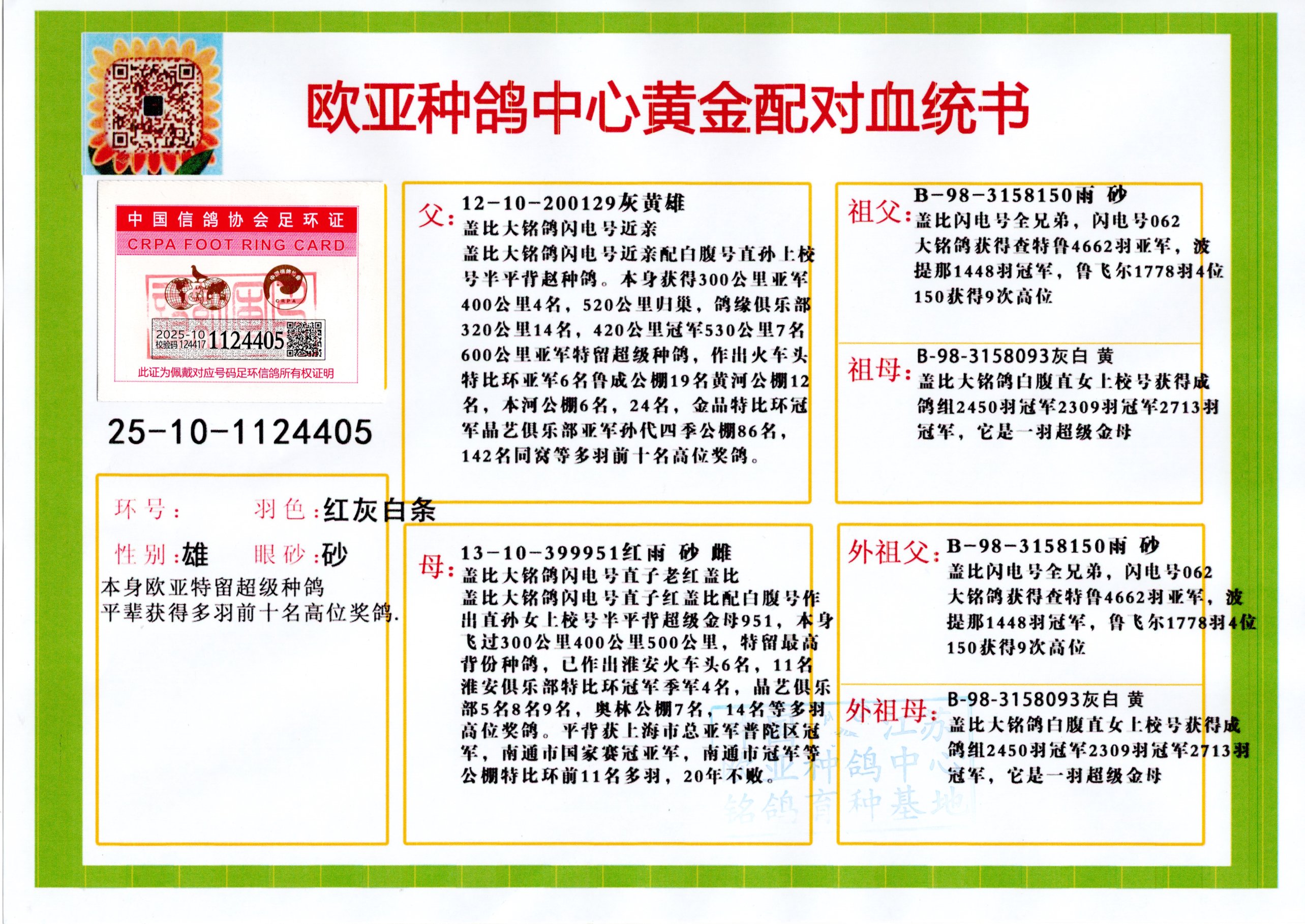 24年秋南京特比環(huán)歐亞榮獲大團(tuán)體冠軍.小團(tuán)體冠軍551公里大特比13名.14名.16名.19名.20名.21名.24名.26名.27名.28名.42名.52名.54名.57名.65名.66名.68名.70名.71名.72名.74名.76名.80名.82名.83名.84名.85名.86名.90名.92名.110名.116名.121名.122名.128名.131名.158名.161名.164名.165名.166名.172名.174名.177名.182名.195名.196名.201名.205名.208名.210名.216名.253名.269名.275名.276名.294名.296名.299名,,24年秋云南天南銅都公棚決賽415名.天南銅都小棚決賽409名.云南玉活公棚決賽102名.490名.團(tuán)體32名上籠二羽進(jìn)二羽,天南銅都大棚506公里決賽445名。熱烈祝賀河北省巨鹿縣李蘭生老師用歐亞泰山號血系連續(xù)十一年奪冠軍,河北省國家賽冠軍.全國季軍等多次前十名高位,揚(yáng)州王軍王總用歐亞利奧24年春季獲山東翔宇公棚決賽33名蓋比53名。南京劉正龍劉總用歐亞蓋比獲得24年秋山東濰坊國際公棚決賽42名.精英賽30名.三關(guān)鴿王71名.決賽86名.加站賽16名.南京市特比環(huán)A組鴿王9名.B組鴿王5名.6名.C組鴿王5名.精英賽冠軍4名.技能賽A組冠軍4名.5名.秦淮區(qū)特比環(huán)榮獲15名.46名.48名.87名。四川西昌徐亮徐總用歐亞利奧獲得涼山州聚友決賽177名.第二關(guān)亞軍雙關(guān)鴿王19名.三關(guān)鴿王105名.云南豪庭公棚決賽603名。熱烈祝賀24年四川重慶翔園鴿舍用歐亞泰山號榮獲春季400公里冠軍.秋季500公里冠軍,河北王總用詹森X利奧獲得千羽千翔公棚400公里冠軍,廣東蔡楷煥榮獲24年秋愛好者 賽鴿俱樂部三關(guān)鴿王季軍.一關(guān)420公里99名.二關(guān)450公里11名.三關(guān)520公里32名.單關(guān)季軍.7名.12名,江西李衛(wèi)興榮獲貴州紅楓公棚8名.共翔俱樂部寄養(yǎng)棚四關(guān)綜合鴿王30名.一關(guān)400公里78名.二關(guān)500公里55名.三關(guān)520公里37名.四關(guān)500公里57名.同父母獲公棚18名.雷鳴獲得武漢黃浦育翔中心冠軍,四川陳文獲得四川明鴻俱樂部300公里夢幻2名.3名.4名.9名.10名.13名.14名.15名.31名.34名.40名.41名.42名.43名.69名.71名.72名.73名.74名.94名.95名.97名.98名.99名.419公里決賽榮獲總冠軍7名.總共歸巢9羽,四川徐亮獲豪庭決賽603名,山西鄭勇獲得山西泰鑫公棚決賽255名詹森紅狐,熱烈祝賀馬總獲得開爾(飛躍隊(duì))決賽9名獲獎金1310000萬元.第一關(guān)52名,天津津福資賽180公里96名.獲獎金429543萬元,歐亞支持全國鴿友24年秋多人報(bào)喜 祝大家取得更好成績,給歐亞報(bào)喜鴿友歐亞決定給每人贈送一羽超級種鴿。歐亞俱樂部特比環(huán)多關(guān)鴿王成績:15年秋淮安特比環(huán)黑色星期一全會上籠9700多羽,當(dāng)天無鴿歸巢,第二天全會歸巢357羽,本舍歸巢158羽.前十名八羽.前一百名歸巢57羽,16年春季獲五關(guān)鴿王總冠軍,總亞軍四名.六名.七名.九名.十名.晶藝俱樂部520公里冠亞季軍5名.6名.7名.9名.11名等,火車頭冠軍.季軍6名.8名.9名.10名,16年秋晶藝俱樂部特比環(huán)520公里亞軍.季軍4名.6名.7名.9名,15年春南京白下特比環(huán)冠軍.亞軍.季軍6名.7名.8名.9名.10名.指定鴿A B組獲得冠軍.亞軍.季軍4名.5名.,17年淮安特比環(huán)亞軍.4名.5名.7名.8名.10名.六關(guān)鴿王總冠軍.4名.6名.9名.10名,寄養(yǎng)棚宿遷劉總20羽特比環(huán)獲冠軍.季軍.4名.7名.8名.9名等。18年榮獲萬羽特比環(huán)六關(guān)鴿王總冠軍.總亞軍.總季軍.6名.8名.十名.單關(guān)四羽冠軍.二羽亞軍.四羽季軍.前十名27羽。19年秋萬羽特比環(huán)六關(guān)鴿王總亞軍.總季軍.5名.8名等,單關(guān)二羽冠軍.三羽亞軍.一羽季軍前十名31羽。20年秋淮安市鴿會四關(guān)特比環(huán)大賽風(fēng)雨無阻鴿王亞軍.鴿王六名,金品俱樂部萬羽特比環(huán)六關(guān)鴿王總冠軍,總亞軍.四名.五名.六名.七名.八名.十名.前二百名鴿王35羽,單關(guān)冠亞季軍前十名四十多羽,火車頭五關(guān)鴿王季軍.六名.八名.前二百名鴿王十七羽。20年春榮獲淮安五區(qū)一市四關(guān)鴿王總冠軍.亞軍.四名.八名.九名。21年秋榮獲金品萬羽特比環(huán)大賽六關(guān)鴿王總亞軍.總季軍.四名.七名.九名.十名.單關(guān)冠亞軍季軍前十名三十多羽;疖囶^協(xié)會鴿王六名.七名.十名.單關(guān)前十名十七羽。22年秋榮獲鴿王總冠軍.總亞軍.5名.7名.8名.9名.11名.單關(guān)冠亞季軍前十名三十多羽,第一關(guān)單關(guān)前二百名四十多羽,第二關(guān)前二百名三十多羽,第三關(guān)前二百名四十多羽,第四關(guān)前二百名四十多羽,第五關(guān)前一百名53羽。23年秋榮獲鴿王季軍.五名.八名.十名.13名.17名.20名.27名等多羽鴿王.單關(guān)前十名二十多羽。公棚.寄養(yǎng)棚部分成績:16年秋寧夏黃河公棚總冠軍電腦戈馬力指定通炮冠軍,17年送八羽參賽獲得鴿王八名進(jìn)獎四名,支持韓總榮獲八名。支持鴿友榮獲寧夏中衛(wèi)公棚決賽總冠軍.精英賽冠軍,支持18年寧夏黃河公棚決賽冠軍詹森X泰山。安徽鼎博寄養(yǎng)棚院內(nèi)外四關(guān)鴿王總冠軍.鴿王十七名.三十七名同窩,鴿王39名.42名.58名.67名。18年山東公棚預(yù)賽冠軍.決賽65名.送八羽進(jìn)獎五羽.指定獲奔馳汽車一輛。支持鴿友獲得云南藍(lán)云公棚冠軍.蓋比X佛卡門。支持鴿友榮獲云南銀集公棚決賽冠軍 詹森427X520血系 速度賽6700羽冠軍。17年榮獲金馬俱樂部寄養(yǎng)棚四關(guān)鴿王總冠軍.季軍.六名.八名.第一關(guān)冠軍.亞軍.季軍四名.七名.十一名.金牌教