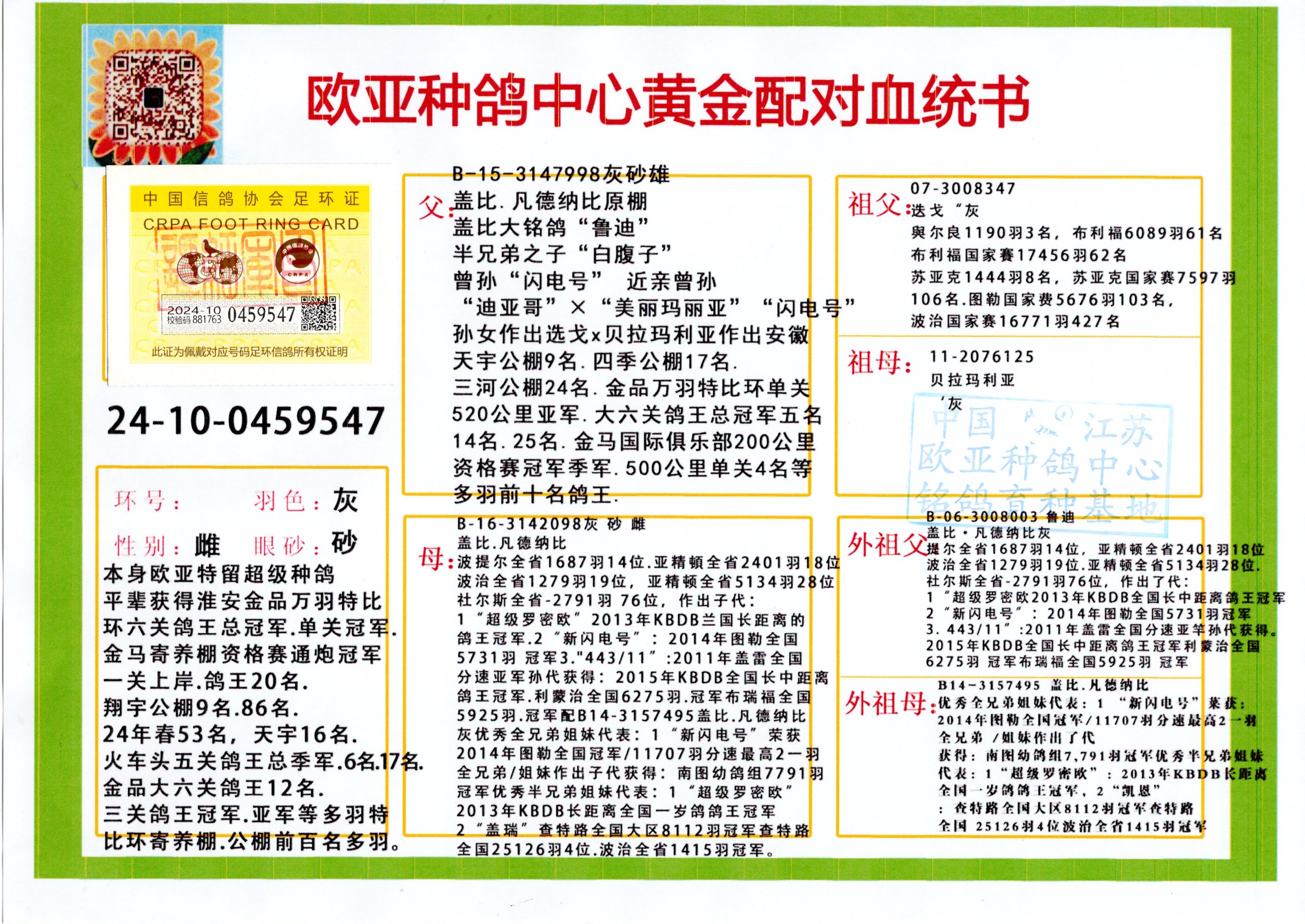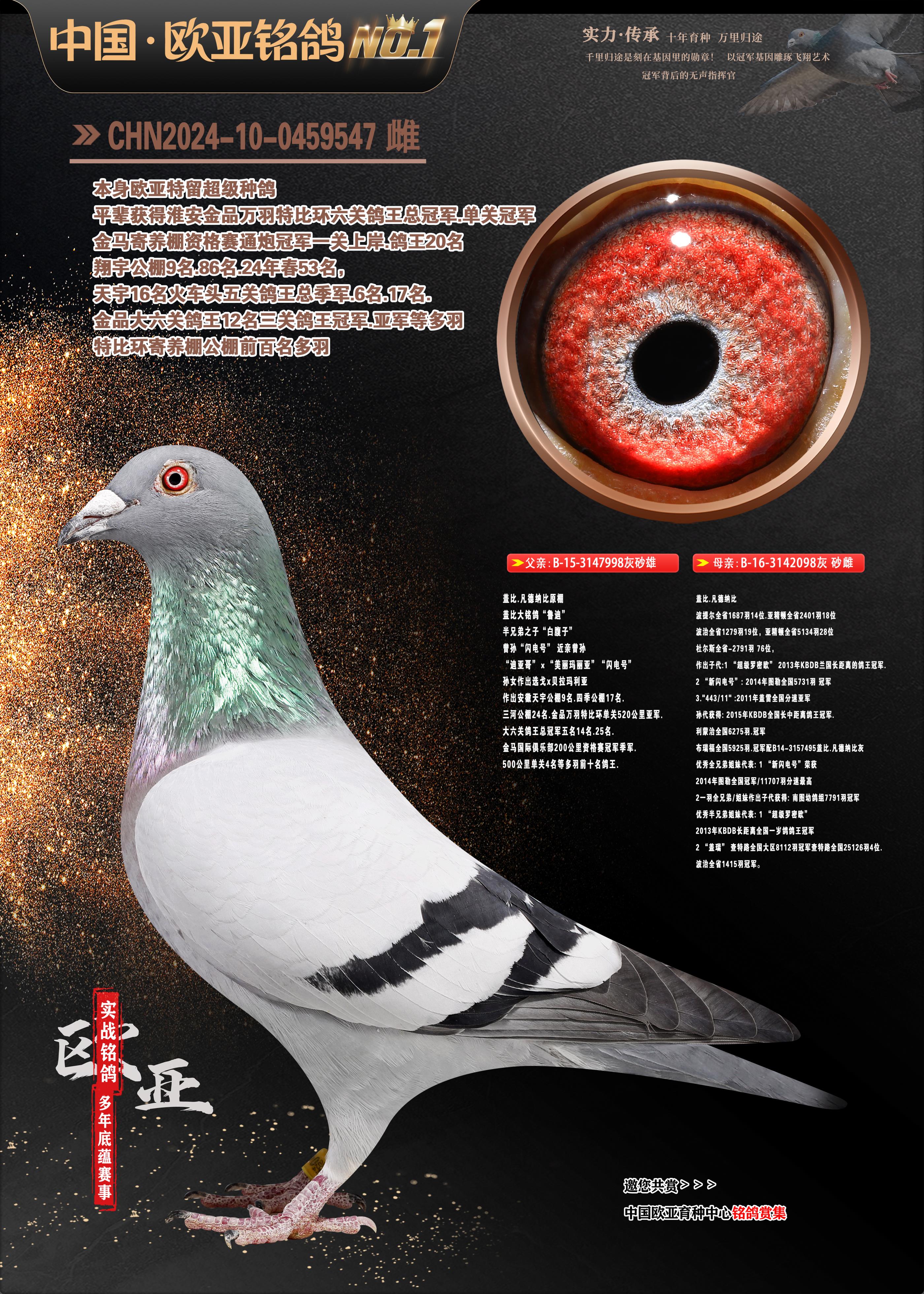 24年秋南京特比環(huán)歐亞榮獲大團(tuán)體冠軍.小團(tuán)體冠軍551公里大特比13名.14名.16名.19名.20名.21名.24名.26名.27名.28名.42名.52名.54名.57名.65名.66名.68名.70名.71名.72名.74名.76名.80名.82名.83名.84名.85名.86名.90名.92名.110名.116名.121名.122名.128名.131名.158名.161名.164名.165名.166名.172名.174名.177名.182名.195名.196名.201名.205名.208名.210名.216名.253名.269名.275名.276名.294名.296名.299名,,24年秋云南天南銅都公棚決賽415名.天南銅都小棚決賽409名.云南玉活公棚決賽102名.490名.團(tuán)體32名上籠二羽進(jìn)二羽,天南銅都大棚506公里決賽445名。熱烈祝賀河北省巨鹿縣李蘭生老師用歐亞泰山號(hào)血系連續(xù)十一年奪冠軍,河北省國(guó)家賽冠軍.全國(guó)季軍等多次前十名高位,揚(yáng)州王軍王總用歐亞利奧24年春季獲山東翔宇公棚決賽33名蓋比53名。南京劉正龍劉總用歐亞蓋比獲得24年秋山東濰坊國(guó)際公棚決賽42名.精英賽30名.三關(guān)鴿王71名.決賽86名.加站賽16名.南京市特比環(huán)A組鴿王9名.B組鴿王5名.6名.C組鴿王5名.精英賽冠軍4名.技能賽A組冠軍4名.5名.秦淮區(qū)特比環(huán)榮獲15名.46名.48名.87名。四川西昌徐亮徐總用歐亞利奧獲得涼山州聚友決賽177名.第二關(guān)亞軍雙關(guān)鴿王19名.三關(guān)鴿王105名.云南豪庭公棚決賽603名。熱烈祝賀24年四川重慶翔園鴿舍用歐亞泰山號(hào)榮獲春季400公里冠軍.秋季500公里冠軍,河北王總用詹森X利奧獲得千羽千翔公棚400公里冠軍,廣東蔡楷煥榮獲24年秋愛(ài)好者 賽鴿俱樂(lè)部三關(guān)鴿王季軍.一關(guān)420公里99名.二關(guān)450公里11名.三關(guān)520公里32名.單關(guān)季軍.7名.12名,江西李衛(wèi)興榮獲貴州紅楓公棚8名.共翔俱樂(lè)部寄養(yǎng)棚四關(guān)綜合鴿王30名.一關(guān)400公里78名.二關(guān)500公里55名.三關(guān)520公里37名.四關(guān)500公里57名.同父母獲公棚18名.雷鳴獲得武漢黃浦育翔中心冠軍,四川陳文獲得四川明鴻俱樂(lè)部300公里夢(mèng)幻2名.3名.4名.9名.10名.13名.14名.15名.31名.34名.40名.41名.42名.43名.69名.71名.72名.73名.74名.94名.95名.97名.98名.99名.419公里決賽榮獲總冠軍7名.總共歸巢9羽,四川徐亮獲豪庭決賽603名,山西鄭勇獲得山西泰鑫公棚決賽255名詹森紅狐,熱烈祝賀馬總獲得開(kāi)爾(飛躍隊(duì))決賽9名獲獎(jiǎng)金1310000萬(wàn)元.第一關(guān)52名,天津津福資賽180公里96名.獲獎(jiǎng)金429543萬(wàn)元,歐亞支持全國(guó)鴿友24年秋多人報(bào)喜 祝大家取得更好成績(jī),給歐亞報(bào)喜鴿友歐亞決定給每人贈(zèng)送一羽超級(jí)種鴿。歐亞俱樂(lè)部特比環(huán)多關(guān)鴿王成績(jī):15年秋淮安特比環(huán)黑色星期一全會(huì)上籠9700多羽,當(dāng)天無(wú)鴿歸巢,第二天全會(huì)歸巢357羽,本舍歸巢158羽.前十名八羽.前一百名歸巢57羽,16年春季獲五關(guān)鴿王總冠軍,總亞軍四名.六名.七名.九名.十名.晶藝俱樂(lè)部520公里冠亞季軍5名.6名.7名.9名.11名等,火車(chē)頭冠軍.季軍6名.8名.9名.10名,16年秋晶藝俱樂(lè)部特比環(huán)520公里亞軍.季軍4名.6名.7名.9名,15年春南京白下特比環(huán)冠軍.亞軍.季軍6名.7名.8名.9名.10名.指定鴿A B組獲得冠軍.亞軍.季軍4名.5名.,17年淮安特比環(huán)亞軍.4名.5名.7名.8名.10名.六關(guān)鴿王總冠軍.4名.6名.9名.10名,寄養(yǎng)棚宿遷劉總20羽特比環(huán)獲冠軍.季軍.4名.7名.8名.9名等。18年榮獲萬(wàn)羽特比環(huán)六關(guān)鴿王總冠軍.總亞軍.總季軍.6名.8名.十名.單關(guān)四羽冠軍.二羽亞軍.四羽季軍.前十名27羽。19年秋萬(wàn)羽特比環(huán)六關(guān)鴿王總亞軍.總季軍.5名.8名等,單關(guān)二羽冠軍.三羽亞軍.一羽季軍前十名31羽。20年秋淮安市鴿會(huì)四關(guān)特比環(huán)大賽風(fēng)雨無(wú)阻鴿王亞軍.鴿王六名,金品俱樂(lè)部萬(wàn)羽特比環(huán)六關(guān)鴿王總冠軍,總亞軍.四名.五名.六名.七名.八名.十名.前二百名鴿王35羽,單關(guān)冠亞季軍前十名四十多羽,火車(chē)頭五關(guān)鴿王季軍.六名.八名.前二百名鴿王十七羽。20年春榮獲淮安五區(qū)一市四關(guān)鴿王總冠軍.亞軍.四名.八名.九名。21年秋榮獲金品萬(wàn)羽特比環(huán)大賽六關(guān)鴿王總亞軍.總季軍.四名.七名.九名.十名.單關(guān)冠亞軍季軍前十名三十多羽;疖(chē)頭協(xié)會(huì)鴿王六名.七名.十名.單關(guān)前十名十七羽。22年秋榮獲鴿王總冠軍.總亞軍.5名.7名.8名.9名.11名.單關(guān)冠亞季軍前十名三十多羽,第一關(guān)單關(guān)前二百名四十多羽,第二關(guān)前二百名三十多羽,第三關(guān)前二百名四十多羽,第四關(guān)前二百名四十多羽,第五關(guān)前一百名53羽。23年秋榮獲鴿王季軍.五名.八名.十名.13名.17名.20名.27名等多羽鴿王.單關(guān)前十名二十多羽。公棚.寄養(yǎng)棚部分成績(jī):16年秋寧夏黃河公棚總冠軍電腦戈馬力指定通炮冠軍,17年送八羽參賽獲得鴿王八名進(jìn)獎(jiǎng)四名,支持韓總榮獲八名。支持鴿友榮獲寧夏中衛(wèi)公棚決賽總冠軍.精英賽冠軍,支持18年寧夏黃河公棚決賽冠軍詹森X泰山。安徽鼎博寄養(yǎng)棚院內(nèi)外四關(guān)鴿王總冠軍.鴿王十七名.三十七名同窩,鴿王39名.42名.58名.67名。18年山東公棚預(yù)賽冠軍.決賽65名.送八羽進(jìn)獎(jiǎng)五羽.指定獲奔馳汽車(chē)一輛。支持鴿友獲得云南藍(lán)云公棚冠軍.蓋比X佛卡門(mén)。支持