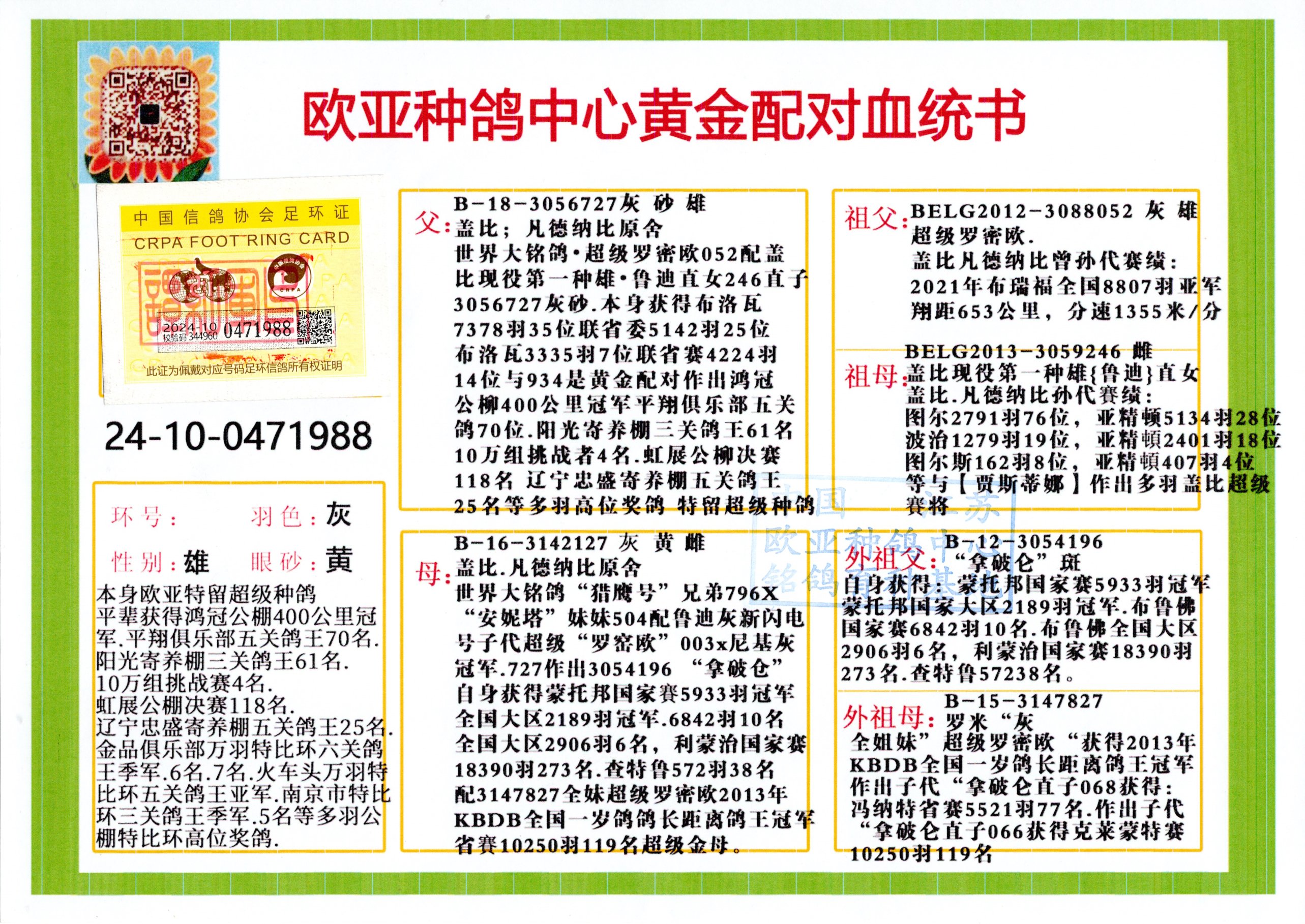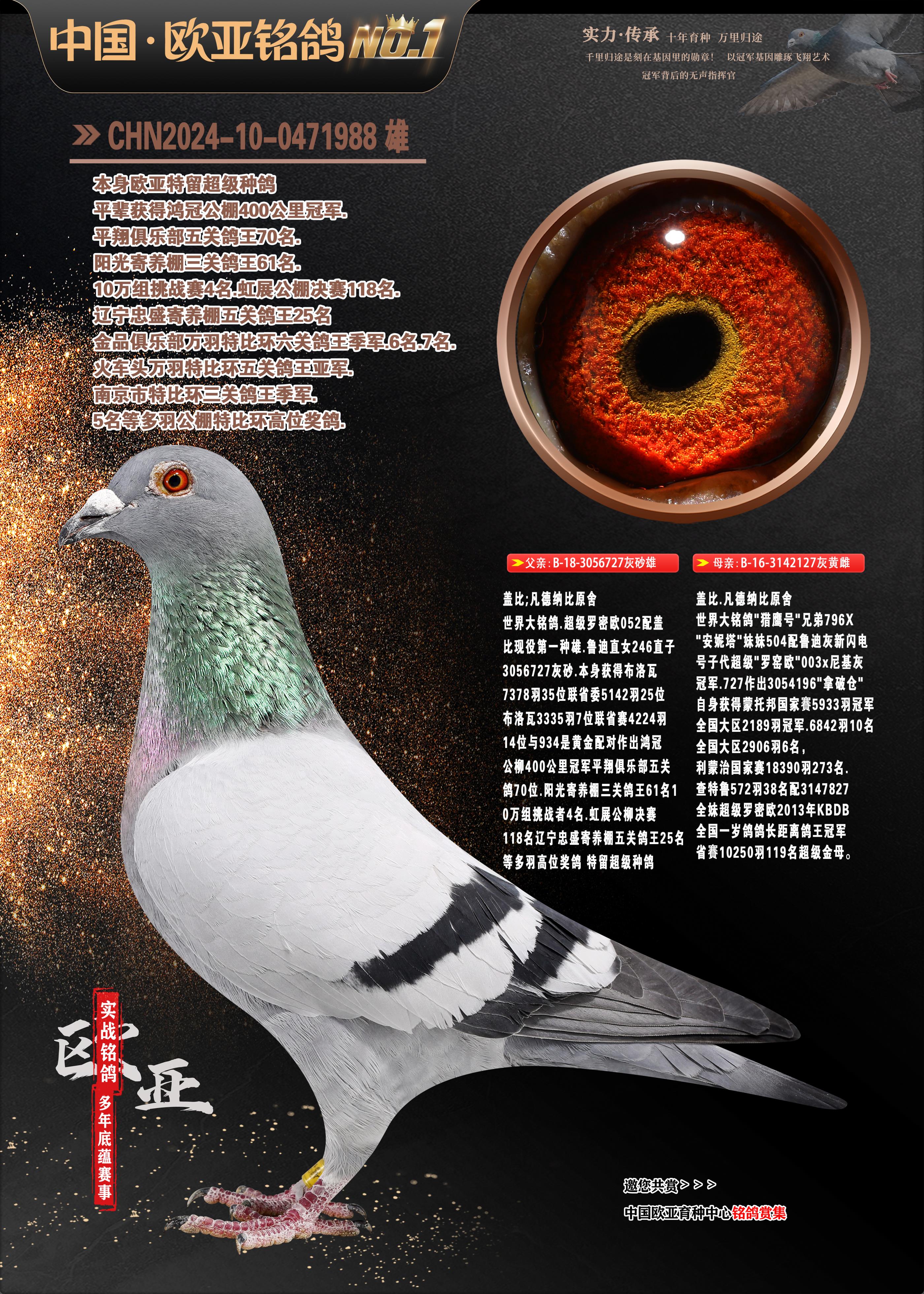 24年秋南京特比環(huán)歐亞榮獲大團(tuán)體冠軍.小團(tuán)體冠軍551公里大特比13名.14名.16名.19名.20名.21名.24名.26名.27名.28名.42名.52名.54名.57名.65名.66名.68名.70名.71名.72名.74名.76名.80名.82名.83名.84名.85名.86名.90名.92名.110名.116名.121名.122名.128名.131名.158名.161名.164名.165名.166名.172名.174名.177名.182名.195名.196名.201名.205名.208名.210名.216名.253名.269名.275名.276名.294名.296名.299名,,24年秋云南天南銅都公棚決賽415名.天南銅都小棚決賽409名.云南玉活公棚決賽102名.490名.團(tuán)體32名上籠二羽進(jìn)二羽,天南銅都大棚506公里決賽445名。熱烈祝賀河北省巨鹿縣李蘭生老師用歐亞泰山號血系連續(xù)十一年奪冠軍,河北省國家賽冠軍.全國季軍等多次前十名高位,揚(yáng)州王軍王總用歐亞利奧24年春季獲山東翔宇公棚決賽33名蓋比53名。南京劉正龍劉總用歐亞蓋比獲得24年秋山東濰坊國際公棚決賽42名.精英賽30名.三關(guān)鴿王71名.決賽86名.加站賽16名.南京市特比環(huán)A組鴿王9名.B組鴿王5名.6名.C組鴿王5名.精英賽冠軍4名.技能賽A組冠軍4名.5名.秦淮區(qū)特比環(huán)榮獲15名.46名.48名.87名。四川西昌徐亮徐總用歐亞利奧獲得涼山州聚友決賽177名.第二關(guān)亞軍雙關(guān)鴿王19名.三關(guān)鴿王105名.云南豪庭公棚決賽603名。熱烈祝賀24年四川重慶翔園鴿舍用歐亞泰山號榮獲春季400公里冠軍.秋季500公里冠軍,河北王總用詹森X利奧獲得千羽千翔公棚400公里冠軍,廣東蔡楷煥榮獲24年秋愛好者 賽鴿俱樂部三關(guān)鴿王季軍.一關(guān)420公里99名.二關(guān)450公里11名.三關(guān)520公里32名.單關(guān)季軍.7名.12名,江西李衛(wèi)興榮獲貴州紅楓公棚8名.共翔俱樂部寄養(yǎng)棚四關(guān)綜合鴿王30名.一關(guān)400公里78名.二關(guān)500公里55名.三關(guān)520公里37名.四關(guān)500公里57名.同父母獲公棚18名.雷鳴獲得武漢黃浦育翔中心冠軍,四川陳文獲得四川明鴻俱樂部300公里夢幻2名.3名.4名.9名.10名.13名.14名.15名.31名.34名.40名.41名.42名.43名.69名.71名.72名.73名.74名.94名.95名.97名.98名.99名.419公里決賽榮獲總冠軍7名.總共歸巢9羽,四川徐亮獲豪庭決賽603名,山西鄭勇獲得山西泰鑫公棚決賽255名詹森紅狐,熱烈祝賀馬總獲得開爾(飛躍隊)決賽9名獲獎金1310000萬元.第一關(guān)52名,天津津福資賽180公里96名.獲獎金429543萬元,歐亞支持全國鴿友24年秋多人報喜 祝大家取得更好成績,給歐亞報喜鴿友歐亞決定給每人贈送一羽超級種鴿。歐亞俱樂部特比環(huán)多關(guān)鴿王成績:15年秋淮安特比環(huán)黑色星期一全會上籠9700多羽,當(dāng)天無鴿歸巢,第二天全會歸巢357羽,本舍歸巢158羽.前十名八羽.前一百名歸巢57羽,16年春季獲五關(guān)鴿王總冠軍,總亞軍四名.六名.七名.九名.十名.晶藝俱樂部520公里冠亞季軍5名.6名.7名.9名.11名等,火車頭冠軍.季軍6名.8名.9名.10名,16年秋晶藝俱樂部特比環(huán)520公里亞軍.季軍4名.6名.7名.9名,15年春南京白下特比環(huán)冠軍.亞軍.季軍6名.7名.8名.9名.10名.指定鴿A B組獲得冠軍.亞軍.季軍4名.5名.,17年淮安特比環(huán)亞軍.4名.5名.7名.8名.10名.六關(guān)鴿王總冠軍.4名.6名.9名.10名,寄養(yǎng)棚宿遷劉總20羽特比環(huán)獲冠軍.季軍.4名.7名.8名.9名等。18年榮獲萬羽特比環(huán)六關(guān)鴿王總冠軍.總亞軍.總季軍.6名.8名.十名.單關(guān)四羽冠軍.二羽亞軍.四羽季軍.前十名27羽。19年秋萬羽特比環(huán)六關(guān)鴿王總亞軍.總季軍.5名.8名等,單關(guān)二羽冠軍.三羽亞軍.一羽季軍前十名31羽。20年秋淮安市鴿會四關(guān)特比環(huán)大賽風(fēng)雨無阻鴿王亞軍.鴿王六名,金品俱樂部萬羽特比環(huán)六關(guān)鴿王總冠軍,總亞軍.四名.五名.六名.七名.八名.十名.前二百名鴿王35羽,單關(guān)冠亞季軍前十名四十多羽,火車頭五關(guān)鴿王季軍.六名.八名.前二百名鴿王十七羽。20年春榮獲淮安五區(qū)一市四關(guān)鴿王總冠軍.亞軍.四名.八名.九名。21年秋榮獲金品萬羽特比環(huán)大賽六關(guān)鴿王總亞軍.總季軍.四名.七名.九名.十名.單關(guān)冠亞軍季軍前十名三十多羽;疖囶^協(xié)會鴿王六名.七名.十名.單關(guān)前十名十七羽。22年秋榮獲鴿王總冠軍.總亞軍.5名.7名.8名.9名.11名.單關(guān)冠亞季軍前十名三十多羽,第一關(guān)單關(guān)前二百名四十多羽,第二關(guān)前二百名三十多羽,第三關(guān)前二百名四十多羽,第四關(guān)前二百名四十多羽,第五關(guān)前一百名53羽。23年秋榮獲鴿王季軍.五名.八名.十名.13名.17名.20名.27名等多羽鴿王.單關(guān)前十名二十多羽。公棚.寄養(yǎng)棚部分成績:16年秋寧夏黃河公棚總冠軍電腦戈馬力指定通炮冠軍,17年送八羽參賽獲得鴿王八名進(jìn)獎四名,支持韓總榮獲八名。支持鴿友榮獲寧夏中衛(wèi)公棚決賽總冠軍.精英賽冠軍,支持18年寧夏黃河公棚決賽冠軍詹森X泰山。安徽鼎博寄養(yǎng)棚院內(nèi)外四關(guān)鴿王總冠軍.鴿王十七名.三十七名同窩,鴿王39名.42名.58名.67名。18年山東公棚預(yù)賽冠軍.決賽65名.送八羽進(jìn)獎五羽.指定獲奔馳汽車一輛。支持鴿友獲得云南藍(lán)云公棚冠軍.蓋比X佛卡門。支持鴿友榮獲云南銀集公棚決賽冠軍 詹森427X520血系 速度賽6700羽冠軍。17年榮獲金馬俱樂部寄養(yǎng)棚四關(guān)鴿王總冠軍.季軍.六名.八名.第一關(guān)冠軍.亞軍.季軍四名.七名.十一名.金牌教練獎。支持鴿