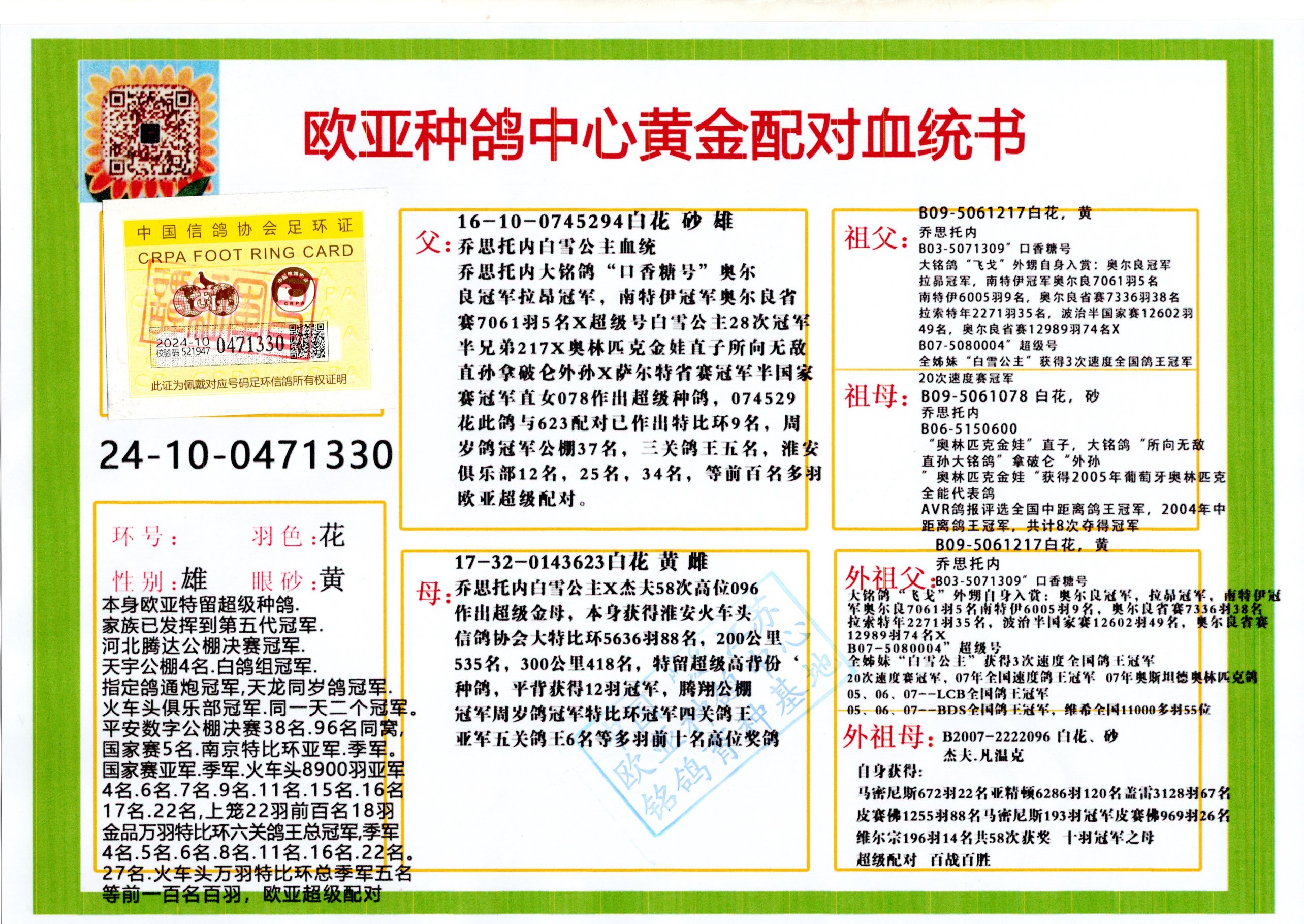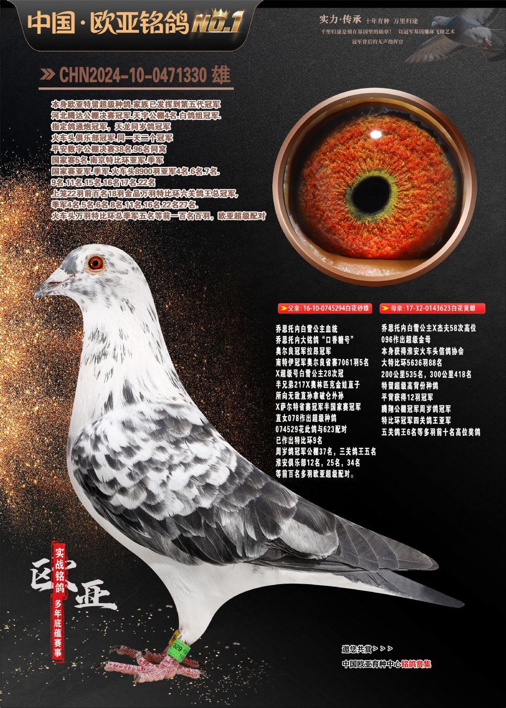 24年秋南京特比環(huán)歐亞榮獲大團體冠軍.小團體冠軍551公里大特比13名.14名.16名.19名.20名.21名.24名.26名.27名.28名.42名.52名.54名.57名.65名.66名.68名.70名.71名.72名.74名.76名.80名.82名.83名.84名.85名.86名.90名.92名.110名.116名.121名.122名.128名.131名.158名.161名.164名.165名.166名.172名.174名.177名.182名.195名.196名.201名.205名.208名.210名.216名.253名.269名.275名.276名.294名.296名.299名,,24年秋云南天南銅都公棚決賽415名.天南銅都小棚決賽409名.云南玉活公棚決賽102名.490名.團體32名上籠二羽進二羽,天南銅都大棚506公里決賽445名。熱烈祝賀河北省巨鹿縣李蘭生老師用歐亞泰山號血系連續(xù)十一年奪冠軍,河北省國家賽冠軍.全國季軍等多次前十名高位,揚州王軍王總用歐亞利奧24年春季獲山東翔宇公棚決賽33名蓋比53名。南京劉正龍劉總用歐亞蓋比獲得24年秋山東濰坊國際公棚決賽42名.精英賽30名.三關鴿王71名.決賽86名.加站賽16名.南京市特比環(huán)A組鴿王9名.B組鴿王5名.6名.C組鴿王5名.精英賽冠軍4名.技能賽A組冠軍4名.5名.秦淮區(qū)特比環(huán)榮獲15名.46名.48名.87名。四川西昌徐亮徐總用歐亞利奧獲得涼山州聚友決賽177名.第二關亞軍雙關鴿王19名.三關鴿王105名.云南豪庭公棚決賽603名。熱烈祝賀24年四川重慶翔園鴿舍用歐亞泰山號榮獲春季400公里冠軍.秋季500公里冠軍,河北王總用詹森X利奧獲得千羽千翔公棚400公里冠軍,廣東蔡楷煥榮獲24年秋愛好者 賽鴿俱樂部三關鴿王季軍.一關420公里99名.二關450公里11名.三關520公里32名.單關季軍.7名.12名,江西李衛(wèi)興榮獲貴州紅楓公棚8名.共翔俱樂部寄養(yǎng)棚四關綜合鴿王30名.一關400公里78名.二關500公里55名.三關520公里37名.四關500公里57名.同父母獲公棚18名.雷鳴獲得武漢黃浦育翔中心冠軍,四川陳文獲得四川明鴻俱樂部300公里夢幻2名.3名.4名.9名.10名.13名.14名.15名.31名.34名.40名.41名.42名.43名.69名.71名.72名.73名.74名.94名.95名.97名.98名.99名.419公里決賽榮獲總冠軍7名.總共歸巢9羽,四川徐亮獲豪庭決賽603名,山西鄭勇獲得山西泰鑫公棚決賽255名詹森紅狐,熱烈祝賀馬總獲得開爾(飛躍隊)決賽9名獲獎金1310000萬元.第一關52名,天津津福資賽180公里96名.獲獎金429543萬元,歐亞支持全國鴿友24年秋多人報喜 祝大家取得更好成績,給歐亞報喜鴿友歐亞決定給每人贈送一羽超級種鴿。歐亞俱樂部特比環(huán)多關鴿王成績:15年秋淮安特比環(huán)黑色星期一全會上籠9700多羽,當天無鴿歸巢,第二天全會歸巢357羽,本舍歸巢158羽.前十名八羽.前一百名歸巢57羽,16年春季獲五關鴿王總冠軍,總亞軍四名.六名.七名.九名.十名.晶藝俱樂部520公里冠亞季軍5名.6名.7名.9名.11名等,火車頭冠軍.季軍6名.8名.9名.10名,16年秋晶藝俱樂部特比環(huán)520公里亞軍.季軍4名.6名.7名.9名,15年春南京白下特比環(huán)冠軍.亞軍.季軍6名.7名.8名.9名.10名.指定鴿A B組獲得冠軍.亞軍.季軍4名.5名.,17年淮安特比環(huán)亞軍.4名.5名.7名.8名.10名.六關鴿王總冠軍.4名.6名.9名.10名,寄養(yǎng)棚宿遷劉總20羽特比環(huán)獲冠軍.季軍.4名.7名.8名.9名等。18年榮獲萬羽特比環(huán)六關鴿王總冠軍.總亞軍.總季軍.6名.8名.十名.單關四羽冠軍.二羽亞軍.四羽季軍.前十名27羽。19年秋萬羽特比環(huán)六關鴿王總亞軍.總季軍.5名.8名等,單關二羽冠軍.三羽亞軍.一羽季軍前十名31羽。20年秋淮安市鴿會四關特比環(huán)大賽風雨無阻鴿王亞軍.鴿王六名,金品俱樂部萬羽特比環(huán)六關鴿王總冠軍,總亞軍.四名.五名.六名.七名.八名.十名.前二百名鴿王35羽,單關冠亞季軍前十名四十多羽,火車頭五關鴿王季軍.六名.八名.前二百名鴿王十七羽。20年春榮獲淮安五區(qū)一市四關鴿王總冠軍.亞軍.四名.八名.九名。21年秋榮獲金品萬羽特比環(huán)大賽六關鴿王總亞軍.總季軍.四名.七名.九名.十名.單關冠亞軍季軍前十名三十多羽。火車頭協(xié)會鴿王六名.七名.十名.單關前十名十七羽。22年秋榮獲鴿王總冠軍.總亞軍.5名.7名.8名.9名.11名.單關冠亞季軍前十名三十多羽,第一關單關前二百名四十多羽,第二關前二百名三十多羽,第三關前二百名四十多羽,第四關前二百名四十多羽,第五關前一百名53羽。23年秋榮獲鴿王季軍.五名.八名.十名.13名.17名.20名.27名等多羽鴿王.單關前十名二十多羽。公棚.寄養(yǎng)棚部分成績:16年秋寧夏黃河公棚總冠軍電腦戈馬力指定通炮冠軍,17年送八羽參賽獲得鴿王八名進獎四名,支持韓總榮獲八名。支持鴿友榮獲寧夏中衛(wèi)公棚決賽總冠軍.精英賽冠軍,支持18年寧夏黃河公棚決賽冠軍詹森X泰山。安徽鼎博寄養(yǎng)棚院內外四關鴿王總冠軍.鴿王十七名.三十七名同窩,鴿王39名.42名.58名.67名。18年山東公棚預賽冠軍.決賽65名.送八羽進獎五羽.指定獲奔馳汽車一輛。支持鴿友獲得云南藍云公棚冠軍.蓋比X佛卡門。支持鴿友榮獲云南銀集公棚決賽冠軍 詹森427X520血系 速度賽6700羽冠軍。17年榮獲金馬俱樂部寄養(yǎng)棚四關鴿王總冠軍.季軍.六名.八名.第一關冠軍.亞軍.季軍四名.七名.十一名.金牌教練獎。支持鴿友18年北京費翔公棚預賽九名電腦X桑杰士,支持鴿友榮獲陜西威力公棚決賽11名.內蒙古臨河寄養(yǎng)棚四關鴿王六名.詹森配泰山,支持河北王總用歐亞詹森427配胡本喜獲20年秋開爾青年棚季軍。云南東榮公棚16年預賽冠軍.決賽77名.17年決賽12名.詹森紅狐X泰山,17年平安公棚決賽