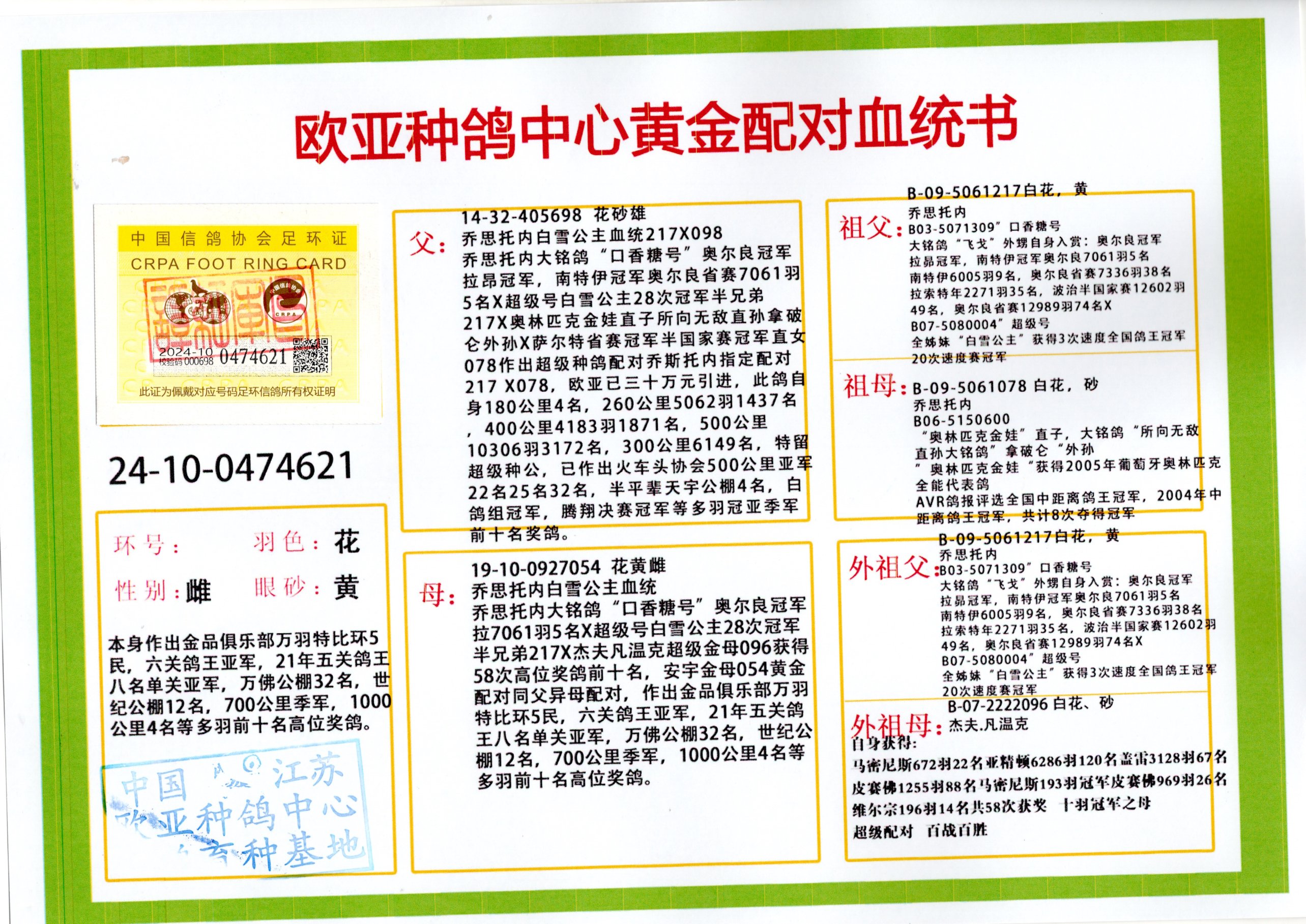 24年秋南京特比環(huán)歐亞榮獲大團(tuán)體冠軍.小團(tuán)體冠軍551公里大特比13名.14名.16名.19名.20名.21名.24名.26名.27名.28名.42名.52名.54名.57名.65名.66名.68名.70名.71名.72名.74名.76名.80名.82名.83名.84名.85名.86名.90名.92名.110名.116名.121名.122名.128名.131名.158名.161名.164名.165名.166名.172名.174名.177名.182名.195名.196名.201名.205名.208名.210名.216名.253名.269名.275名.276名.294名.296名.299名,,24年秋云南天南銅都公棚決賽415名.天南銅都小棚決賽409名.云南玉活公棚決賽102名.490名.團(tuán)體32名上籠二羽進(jìn)二羽,天南銅都大棚506公里決賽445名。熱烈祝賀河北省巨鹿縣李蘭生老師用歐亞泰山號(hào)血系連續(xù)十一年奪冠軍,河北省國(guó)家賽冠軍.全國(guó)季軍等多次前十名高位,揚(yáng)州王軍王總用歐亞利奧24年春季獲山東翔宇公棚決賽33名蓋比53名。南京劉正龍劉總用歐亞蓋比獲得24年秋山東濰坊國(guó)際公棚決賽42名.精英賽30名.三關(guān)鴿王71名.決賽86名.加站賽16名.南京市特比環(huán)A組鴿王9名.B組鴿王5名.6名.C組鴿王5名.精英賽冠軍4名.技能賽A組冠軍4名.5名.秦淮區(qū)特比環(huán)榮獲15名.46名.48名.87名。四川西昌徐亮徐總用歐亞利奧獲得涼山州聚友決賽177名.第二關(guān)亞軍雙關(guān)鴿王19名.三關(guān)鴿王105名.云南豪庭公棚決賽603名。熱烈祝賀24年四川重慶翔園鴿舍用歐亞泰山號(hào)榮獲春季400公里冠軍.秋季500公里冠軍,河北王總用詹森X利奧獲得千羽千翔公棚400公里冠軍,廣東蔡楷煥榮獲24年秋愛好者 賽鴿俱樂部三關(guān)鴿王季軍.一關(guān)420公里99名.二關(guān)450公里11名.三關(guān)520公里32名.單關(guān)季軍.7名.12名,江西李衛(wèi)興榮獲貴州紅楓公棚8名.共翔俱樂部寄養(yǎng)棚四關(guān)綜合鴿王30名.一關(guān)400公里78名.二關(guān)500公里55名.三關(guān)520公里37名.四關(guān)500公里57名.同父母獲公棚18名.雷鳴獲得武漢黃浦育翔中心冠軍,四川陳文獲得四川明鴻俱樂部300公里夢(mèng)幻2名.3名.4名.9名.10名.13名.14名.15名.31名.34名.40名.41名.42名.43名.69名.71名.72名.73名.74名.94名.95名.97名.98名.99名.419公里決賽榮獲總冠軍7名.總共歸巢9羽,四川徐亮獲豪庭決賽603名,山西鄭勇獲得山西泰鑫公棚決賽255名詹森紅狐,熱烈祝賀馬總獲得開爾(飛躍隊(duì))決賽9名獲獎(jiǎng)金1310000萬元.第一關(guān)52名,天津津福資賽180公里96名.獲獎(jiǎng)金429543萬元,歐亞支持全國(guó)鴿友24年秋多人報(bào)喜 祝大家取得更好成績(jī),給歐亞報(bào)喜鴿友歐亞決定給每人贈(zèng)送一羽超級(jí)種鴿。歐亞俱樂部特比環(huán)多關(guān)鴿王成績(jī):15年秋淮安特比環(huán)黑色星期一全會(huì)上籠9700多羽,當(dāng)天無鴿歸巢,第二天全會(huì)歸巢357羽,本舍歸巢158羽.前十名八羽.前一百名歸巢57羽,16年春季獲五關(guān)鴿王總冠軍,總亞軍四名.六名.七名.九名.十名.晶藝俱樂部520公里冠亞季軍5名.6名.7名.9名.11名等,火車頭冠軍.季軍6名.8名.9名.10名,16年秋晶藝俱樂部特比環(huán)520公里亞軍.季軍4名.6名.7名.9名,15年春南京白下特比環(huán)冠軍.亞軍.季軍6名.7名.8名.9名.10名.指定鴿A B組獲得冠軍.亞軍.季軍4名.5名.,17年淮安特比環(huán)亞軍.4名.5名.7名.8名.10名.六關(guān)鴿王總冠軍.4名.6名.9名.10名,寄養(yǎng)棚宿遷劉總20羽特比環(huán)獲冠軍.季軍.4名.7名.8名.9名等。18年榮獲萬羽特比環(huán)六關(guān)鴿王總冠軍.總亞軍.總季軍.6名.8名.十名.單關(guān)四羽冠軍.二羽亞軍.四羽季軍.前十名27羽。19年秋萬羽特比環(huán)六關(guān)鴿王總亞軍.總季軍.5名.8名等,單關(guān)二羽冠軍.三羽亞軍.一羽季軍前十名31羽。20年秋淮安市鴿會(huì)四關(guān)特比環(huán)大賽風(fēng)雨無阻鴿王亞軍.鴿王六名,金品俱樂部萬羽特比環(huán)六關(guān)鴿王總冠軍,總亞軍.四名.五名.六名.七名.八名.十名.前二百名鴿王35羽,單關(guān)冠亞季軍前十名四十多羽,火車頭五關(guān)鴿王季軍.六名.八名.前二百名鴿王十七羽。20年春榮獲淮安五區(qū)一市四關(guān)鴿王總冠軍.亞軍.四名.八名.九名。21年秋榮獲金品萬羽特比環(huán)大賽六關(guān)鴿王總亞軍.總季軍.四名.七名.九名.十名.單關(guān)冠亞軍季軍前十名三十多羽。火車頭協(xié)會(huì)鴿王六名.七名.十名.單關(guān)前十名十七羽。22年秋榮獲鴿王總冠軍.總亞軍.5名.7名.8名.9名.11名.單關(guān)冠亞季軍前十名三十多羽,第一關(guān)單關(guān)前二百名四十多羽,第二關(guān)前二百名三十多羽,第三關(guān)前二百名四十多羽,第四關(guān)前二百名四十多羽,第五關(guān)前一百名53羽。23年秋榮獲鴿王季軍.五名.八名.十名.13名.17名.20名.27名等多羽鴿王.單關(guān)前十名二十多羽。公棚.寄養(yǎng)棚部分成績(jī):16年秋寧夏黃河公棚總冠軍電腦戈馬力指定通炮冠軍,17年送八羽參賽獲得鴿王八名進(jìn)獎(jiǎng)四名,支持韓總榮獲八名。支持鴿友榮獲寧夏中衛(wèi)公棚決賽總冠軍.精英賽冠軍,支持18年寧夏黃河公棚決賽冠軍詹森X泰山。安徽鼎博寄養(yǎng)棚院內(nèi)外四關(guān)鴿王總冠軍.鴿王十七名.三十七名同窩,鴿王39名.42名.58名.67名。18年山東公棚預(yù)賽冠軍.決賽65名.送八羽進(jìn)獎(jiǎng)五羽.指定獲奔馳汽車一輛。支持鴿友獲得云南藍(lán)云公棚冠軍.蓋比X佛卡門。支持鴿友榮獲云南銀集公棚決賽冠軍 詹森427X520血系 速度賽6700羽冠軍。17年榮獲金馬俱樂部寄