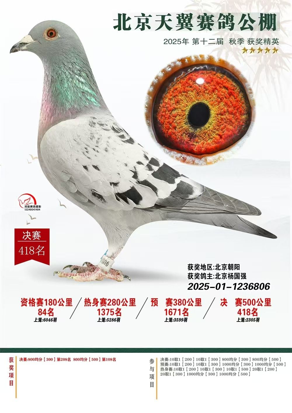 北京天翼賽鴿公棚280公里熱身賽1375名;參與指定:2300元;