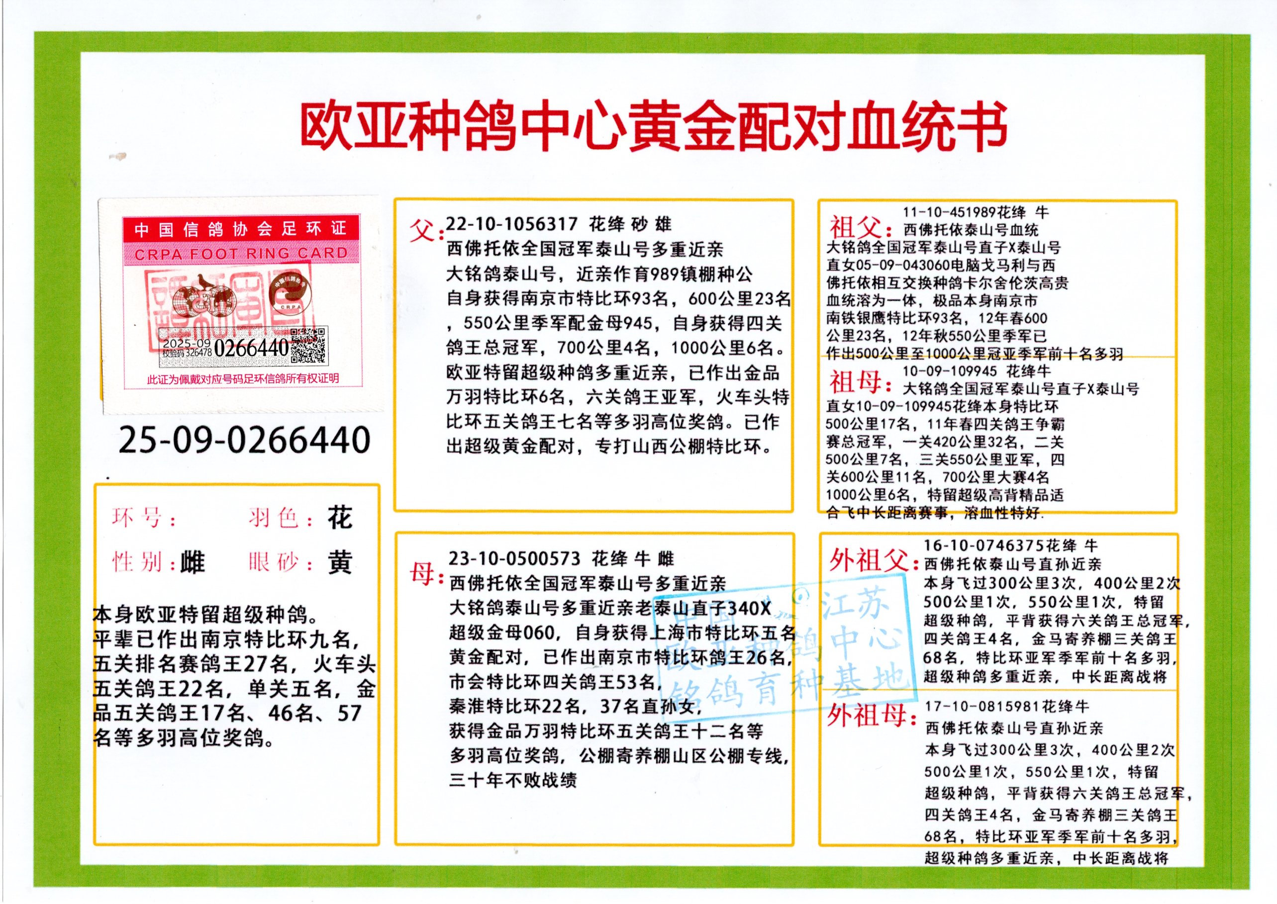 24年秋南京特比環(huán)歐亞榮獲大團(tuán)體冠軍.小團(tuán)體冠軍551公里大特比13名.14名.16名.19名.20名.21名.24名.26名.27名.28名.42名.52名.54名.57名.65名.66名.68名.70名.71名.72名.74名.76名.80名.82名.83名.84名.85名.86名.90名.92名.110名.116名.121名.122名.128名.131名.158名.161名.164名.165名.166名.172名.174名.177名.182名.195名.196名.201名.205名.208名.210名.216名.253名.269名.275名.276名.294名.296名.299名,,24年秋云南天南銅都公棚決賽415名.天南銅都小棚決賽409名.云南玉活公棚決賽102名.490名.團(tuán)體32名上籠二羽進(jìn)二羽,天南銅都大棚506公里決賽445名。熱烈祝賀河北省巨鹿縣李蘭生老師用歐亞泰山號血系連續(xù)十一年奪冠軍,河北省國家賽冠軍.全國季軍等多次前十名高位,揚(yáng)州王軍王總用歐亞利奧24年春季獲山東翔宇公棚決賽33名蓋比53名。南京劉正龍劉總用歐亞蓋比獲得24年秋山東濰坊國際公棚決賽42名.精英賽30名.三關(guān)鴿王71名.決賽86名.加站賽16名.南京市特比環(huán)A組鴿王9名.B組鴿王5名.6名.C組鴿王5名.精英賽冠軍4名.技能賽A組冠軍4名.5名.秦淮區(qū)特比環(huán)榮獲15名.46名.48名.87名。四川西昌徐亮徐總用歐亞利奧獲得涼山州聚友決賽177名.第二關(guān)亞軍雙關(guān)鴿王19名.三關(guān)鴿王105名.云南豪庭公棚決賽603名。熱烈祝賀24年四川重慶翔園鴿舍用歐亞泰山號榮獲春季400公里冠軍.秋季500公里冠軍,河北王總用詹森X利奧獲得千羽千翔公棚400公里冠軍,廣東蔡楷煥榮獲24年秋愛好者 賽鴿俱樂部三關(guān)鴿王季軍.一關(guān)420公里99名.二關(guān)450公里11名.三關(guān)520公里32名.單關(guān)季軍.7名.12名,江西李衛(wèi)興榮獲貴州紅楓公棚8名.共翔俱樂部寄養(yǎng)棚四關(guān)綜合鴿王30名.一關(guān)400公里78名.二關(guān)500公里55名.三關(guān)520公里37名.四關(guān)500公里57名.同父母獲公棚18名.雷鳴獲得武漢黃浦育翔中心冠軍,四川陳文獲得四川明鴻俱樂部300公里夢幻2名.3名.4名.9名.10名.13名.14名.15名.31名.34名.40名.41名.42名.43名.69名.71名.72名.73名.74名.94名.95名.97名.98名.99名.419公里決賽榮獲總冠軍7名.總共歸巢9羽,四川徐亮獲豪庭決賽603名,山西鄭勇獲得山西泰鑫公棚決賽255名詹森紅狐,熱烈祝賀馬總獲得開爾(飛躍隊(duì))決賽9名獲獎金1310000萬元.第一關(guān)52名,天津津福資賽180公里96名.獲獎金429543萬元,歐亞支持全國鴿友24年秋多人報喜 祝大家取得更好成績,給歐亞報喜鴿友歐亞決定給每人贈送一羽超級種鴿。歐亞俱樂部特比環(huán)多關(guān)鴿王成績:15年秋淮安特比環(huán)黑色星期一全會上籠9700多羽,當(dāng)天無鴿歸巢,第二天全會歸巢357羽,本舍歸巢158羽.前十名八羽.前一百名歸巢57羽,16年春季獲五關(guān)鴿王總冠軍,總亞軍四名.六名.七名.九名.十名.晶藝俱樂部520公里冠亞季軍5名.6名.7名.9名.11名等,火車頭冠軍.季軍6名.8名.9名.10名,16年秋晶藝俱樂部特比環(huán)520公里亞軍.季軍4名.6名.7名.9名,15年春南京白下特比環(huán)冠軍.亞軍.季軍6名.7名.8名.9名.10名.指定鴿A B組獲得冠軍.亞軍.季軍4名.5名.,17年淮安特比環(huán)亞軍.4名.5名.7名.8名.10名.六關(guān)鴿王總冠軍.4名.6名.9名.10名,寄養(yǎng)棚宿遷劉總20羽特比環(huán)獲冠軍.季軍.4名.7名.8名.9名等。18年榮獲萬羽特比環(huán)六關(guān)鴿王總冠軍.總亞軍.總季軍.6名.8名.十名.單關(guān)四羽冠軍.二羽亞軍.四羽季軍.前十名27羽。19年秋萬羽特比環(huán)六關(guān)鴿王總亞軍.總季軍.5名.8名等,單關(guān)二羽冠軍.三羽亞軍.一羽季軍前十名31羽。20年秋淮安市鴿會四關(guān)特比環(huán)大賽風(fēng)雨無阻鴿王亞軍.鴿王六名,金品俱樂部萬羽特比環(huán)六關(guān)鴿王總冠軍,總亞軍.四名.五名.六名.七名.八名.十名.前二百名鴿王35羽,單關(guān)冠亞季軍前十名四十多羽,火車頭五關(guān)鴿王季軍.六名.八名.前二百名鴿王十七羽。20年春榮獲淮安五區(qū)一市四關(guān)鴿王總冠軍.亞軍.四名.八名.九名。21年秋榮獲金品萬羽特比環(huán)大賽六關(guān)鴿王總亞軍.總季軍.四名.七名.九名.十名.單關(guān)冠亞軍季軍前十名三十多羽;疖囶^協(xié)會鴿王六名.七名.十名.單關(guān)前十名十七羽。22年秋榮獲鴿王總冠軍.總亞軍.5名.7名.8名.9名.11名.單關(guān)冠亞季軍前十名三十多羽,第一關(guān)單關(guān)前二百名四十多羽,第二關(guān)前二百名三十多羽,第三關(guān)前二百名四十多羽,第四關(guān)前二百名四十多羽,第五關(guān)前一百名53羽。23年秋榮獲鴿王季軍.五名.八名.十名.13名.17名.20名.27名等多羽鴿王.單關(guān)前十名二十多羽。公棚.寄養(yǎng)棚部分成績:16年秋寧夏黃河公棚總冠軍電腦戈馬力指定通炮冠軍,17年送八羽參賽獲得鴿王八名進(jìn)獎四名,支持韓總榮獲八名。支持鴿友榮獲寧夏中衛(wèi)公棚決賽總冠軍.精英賽冠軍,支持18年寧夏黃河公棚決賽冠軍詹森X泰山。安徽鼎博寄養(yǎng)棚院內(nèi)外四關(guān)鴿王總冠軍.鴿王十七名.三十七名同窩,鴿王39名.42名.58名.67名。18年山東公棚預(yù)賽冠軍.決賽65名.送八羽進(jìn)獎五羽.指定獲奔馳汽車一輛。支持鴿友獲得云南藍(lán)云公棚冠軍.蓋比X佛卡門。支持鴿友榮獲云南銀集公棚決賽冠軍 詹森427X520血系 速度賽6700羽冠軍。17年榮獲金馬俱樂部寄養(yǎng)棚四關(guān)鴿王總冠軍.季軍.六名.八名.第一關(guān)冠軍.亞軍.季軍四名.七名.十一名.金牌教練獎。支