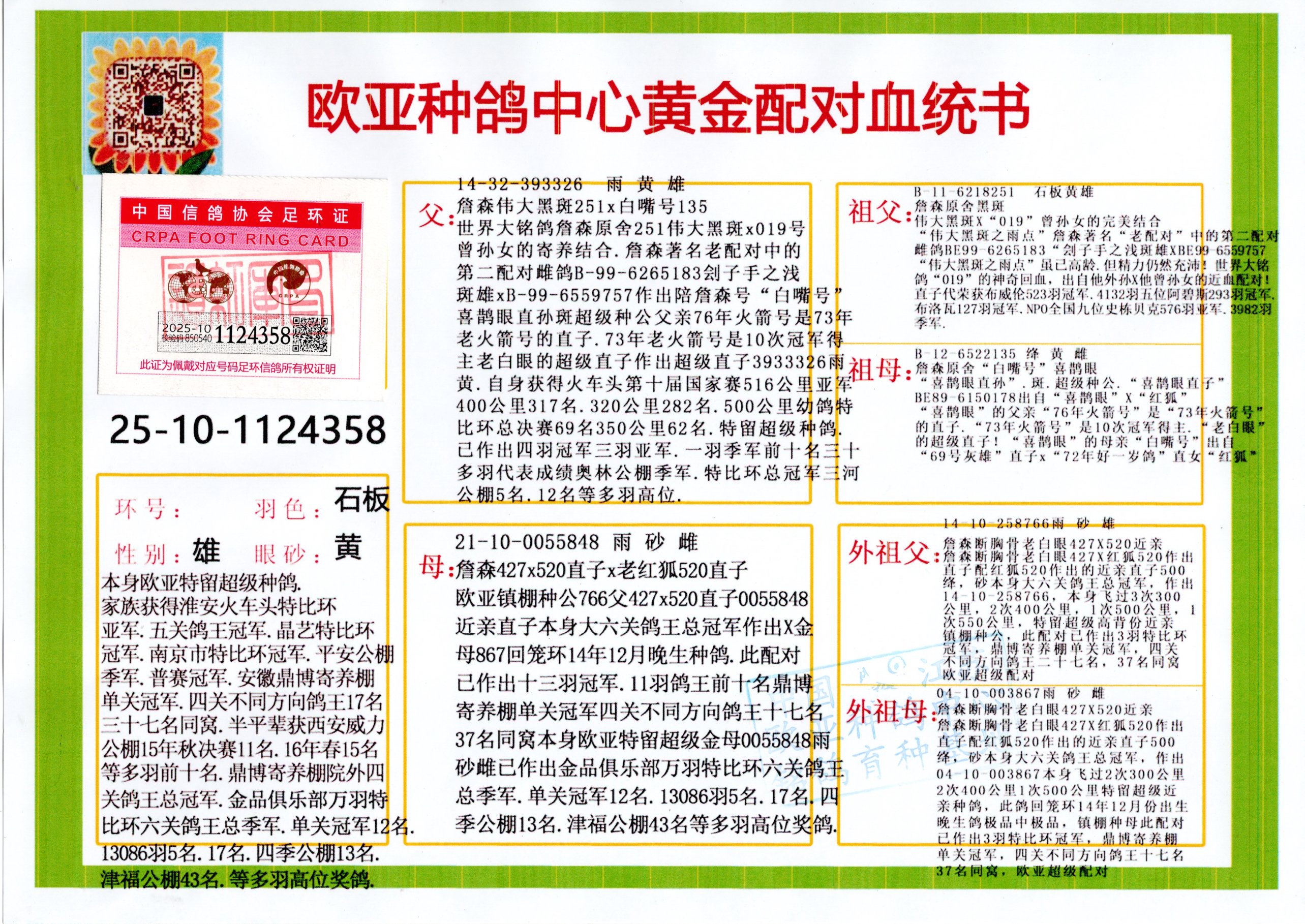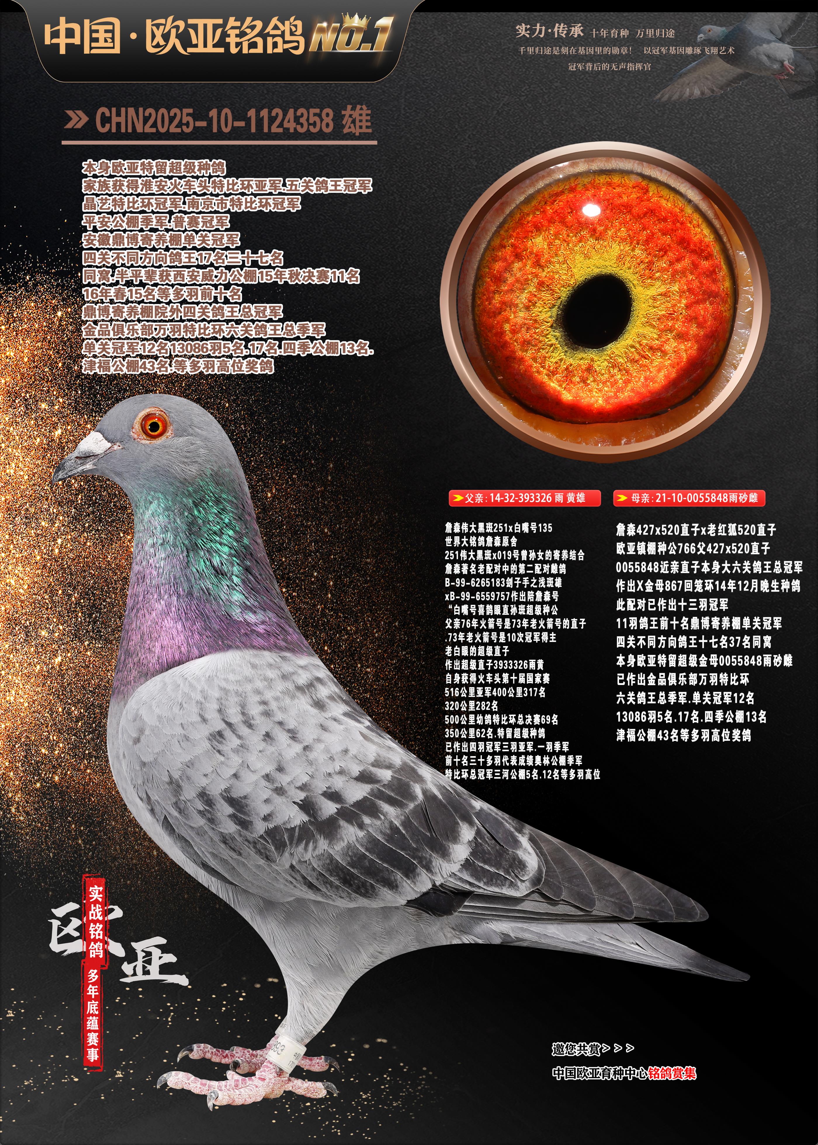 24年秋南京特比環(huán)歐亞榮獲大團體冠軍.小團體冠軍551公里大特比13名.14名.16名.19名.20名.21名.24名.26名.27名.28名.42名.52名.54名.57名.65名.66名.68名.70名.71名.72名.74名.76名.80名.82名.83名.84名.85名.86名.90名.92名.110名.116名.121名.122名.128名.131名.158名.161名.164名.165名.166名.172名.174名.177名.182名.195名.196名.201名.205名.208名.210名.216名.253名.269名.275名.276名.294名.296名.299名,,24年秋云南天南銅都公棚決賽415名.天南銅都小棚決賽409名.云南玉活公棚決賽102名.490名.團體32名上籠二羽進二羽,天南銅都大棚506公里決賽445名。熱烈祝賀河北省巨鹿縣李蘭生老師用歐亞泰山號血系連續(xù)十一年奪冠軍,河北省國家賽冠軍.全國季軍等多次前十名高位,揚州王軍王總用歐亞利奧24年春季獲山東翔宇公棚決賽33名蓋比53名。南京劉正龍劉總用歐亞蓋比獲得24年秋山東濰坊國際公棚決賽42名.精英賽30名.三關鴿王71名.決賽86名.加站賽16名.南京市特比環(huán)A組鴿王9名.B組鴿王5名.6名.C組鴿王5名.精英賽冠軍4名.技能賽A組冠軍4名.5名.秦淮區(qū)特比環(huán)榮獲15名.46名.48名.87名。四川西昌徐亮徐總用歐亞利奧獲得涼山州聚友決賽177名.第二關亞軍雙關鴿王19名.三關鴿王105名.云南豪庭公棚決賽603名。熱烈祝賀24年四川重慶翔園鴿舍用歐亞泰山號榮獲春季400公里冠軍.秋季500公里冠軍,河北王總用詹森X利奧獲得千羽千翔公棚400公里冠軍,廣東蔡楷煥榮獲24年秋愛好者 賽鴿俱樂部三關鴿王季軍.一關420公里99名.二關450公里11名.三關520公里32名.單關季軍.7名.12名,江西李衛(wèi)興榮獲貴州紅楓公棚8名.共翔俱樂部寄養(yǎng)棚四關綜合鴿王30名.一關400公里78名.二關500公里55名.三關520公里37名.四關500公里57名.同父母獲公棚18名.雷鳴獲得武漢黃浦育翔中心冠軍,四川陳文獲得四川明鴻俱樂部300公里夢幻2名.3名.4名.9名.10名.13名.14名.15名.31名.34名.40名.41名.42名.43名.69名.71名.72名.73名.74名.94名.95名.97名.98名.99名.419公里決賽榮獲總冠軍7名.總共歸巢9羽,四川徐亮獲豪庭決賽603名,山西鄭勇獲得山西泰鑫公棚決賽255名詹森紅狐,熱烈祝賀馬總獲得開爾(飛躍隊)決賽9名獲獎金1310000萬元.第一關52名,天津津福資賽180公里96名.獲獎金429543萬元,歐亞支持全國鴿友24年秋多人報喜 祝大家取得更好成績,給歐亞報喜鴿友歐亞決定給每人贈送一羽超級種鴿。歐亞俱樂部特比環(huán)多關鴿王成績:15年秋淮安特比環(huán)黑色星期一全會上籠9700多羽,當天無鴿歸巢,第二天全會歸巢357羽,本舍歸巢158羽.前十名八羽.前一百名歸巢57羽,16年春季獲五關鴿王總冠軍,總亞軍四名.六名.七名.九名.十名.晶藝俱樂部520公里冠亞季軍5名.6名.7名.9名.11名等,火車頭冠軍.季軍6名.8名.9名.10名,16年秋晶藝俱樂部特比環(huán)520公里亞軍.季軍4名.6名.7名.9名,15年春南京白下特比環(huán)冠軍.亞軍.季軍6名.7名.8名.9名.10名.指定鴿A B組獲得冠軍.亞軍.季軍4名.5名.,17年淮安特比環(huán)亞軍.4名.5名.7名.8名.10名.六關鴿王總冠軍.4名.6名.9名.10名,寄養(yǎng)棚宿遷劉總20羽特比環(huán)獲冠軍.季軍.4名.7名.8名.9名等。18年榮獲萬羽特比環(huán)六關鴿王總冠軍.總亞軍.總季軍.6名.8名.十名.單關四羽冠軍.二羽亞軍.四羽季軍.前十名27羽。19年秋萬羽特比環(huán)六關鴿王總亞軍.總季軍.5名.8名等,單關二羽冠軍.三羽亞軍.一羽季軍前十名31羽。20年秋淮安市鴿會四關特比環(huán)大賽風雨無阻鴿王亞軍.鴿王六名,金品俱樂部萬羽特比環(huán)六關鴿王總冠軍,總亞軍.四名.五名.六名.七名.八名.十名.前二百名鴿王35羽,單關冠亞季軍前十名四十多羽,火車頭五關鴿王季軍.六名.八名.前二百名鴿王十七羽。20年春榮獲淮安五區(qū)一市四關鴿王總冠軍.亞軍.四名.八名.九名。21年秋榮獲金品萬羽特比環(huán)大賽六關鴿王總亞軍.總季軍.四名.七名.九名.十名.單關冠亞軍季軍前十名三十多羽;疖囶^協(xié)會鴿王六名.七名.十名.單關前十名十七羽。22年秋榮獲鴿王總冠軍.總亞軍.5名.7名.8名.9名.11名.單關冠亞季軍前十名三十多羽,第一關單關前二百名四十多羽,第二關前二百名三十多羽,第三關前二百名四十多羽,第四關前二百名四十多羽,第五關前一百名53羽。23年秋榮獲鴿王季軍.五名.八名.十名.13名.17名.20名.27名等多羽鴿王.單關前十名二十多羽。公棚.寄養(yǎng)棚部分成績:16年秋寧夏黃河公棚總冠軍電腦戈馬力指定通炮冠軍,17年送八羽參賽獲得鴿王八名進獎四名,支持韓總榮獲八名。支持鴿友榮獲寧夏中衛(wèi)公棚決賽總冠軍.精英賽冠軍,支持18年寧夏黃河公棚決賽冠軍詹森X泰山。安徽鼎博寄養(yǎng)棚院內外四關鴿王總冠軍.鴿王十七名.三十七名同窩,鴿王39名.42名.58名.67名。18年山東公棚預賽冠軍.決賽65名.送八羽進獎五羽.指定獲奔馳汽車一輛。支持鴿友獲得云南藍云公棚冠軍.蓋比X佛卡門。支持鴿友榮獲云南銀集公棚決賽冠軍 詹森427X520血系 速度賽6700羽冠軍。17年榮獲金馬俱樂部寄養(yǎng)棚四關鴿王總冠軍.季軍.六名.八名.第一關冠軍.亞軍.季軍四名.七名.十一名.金牌教練獎。支持鴿友18年北京費翔公棚預賽九名電腦X桑杰士,支持鴿友榮獲陜西威力公棚決賽11名.內蒙古臨河寄養(yǎng)棚四關鴿王六名.詹森配泰山,支持河北王總用歐亞詹森427配胡本喜獲20年秋開爾青年棚季軍。云南東榮公棚16年預賽冠軍.決賽77名.17年決賽12名.詹森紅狐X泰山,17年平安公棚決賽4名