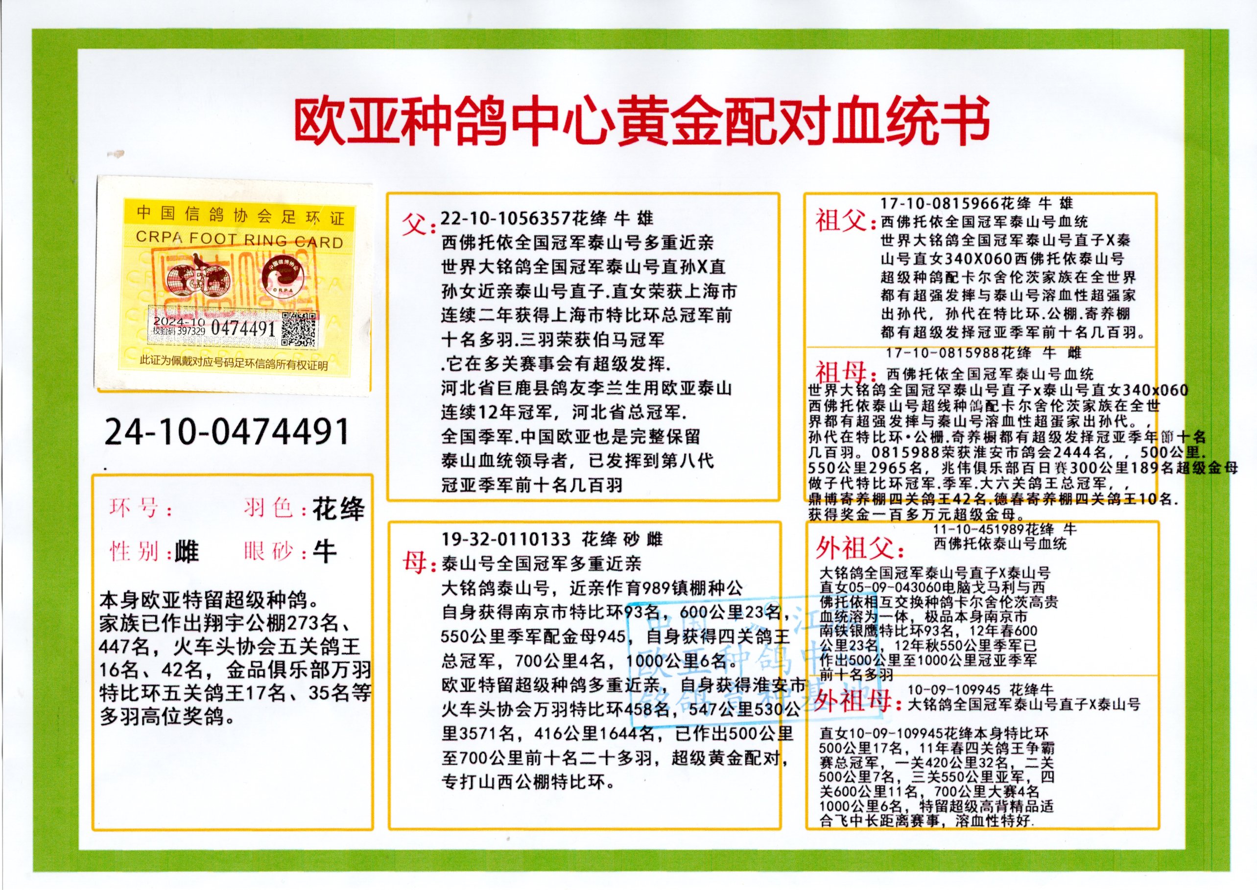 24年秋南京特比環(huán)歐亞榮獲大團(tuán)體冠軍.小團(tuán)體冠軍551公里大特比13名.14名.16名.19名.20名.21名.24名.26名.27名.28名.42名.52名.54名.57名.65名.66名.68名.70名.71名.72名.74名.76名.80名.82名.83名.84名.85名.86名.90名.92名.110名.116名.121名.122名.128名.131名.158名.161名.164名.165名.166名.172名.174名.177名.182名.195名.196名.201名.205名.208名.210名.216名.253名.269名.275名.276名.294名.296名.299名,,24年秋云南天南銅都公棚決賽415名.天南銅都小棚決賽409名.云南玉活公棚決賽102名.490名.團(tuán)體32名上籠二羽進(jìn)二羽,天南銅都大棚506公里決賽445名。熱烈祝賀河北省巨鹿縣李蘭生老師用歐亞泰山號(hào)血系連續(xù)十一年奪冠軍,河北省國(guó)家賽冠軍.全國(guó)季軍等多次前十名高位,揚(yáng)州王軍王總用歐亞利奧24年春季獲山東翔宇公棚決賽33名蓋比53名。南京劉正龍劉總用歐亞蓋比獲得24年秋山東濰坊國(guó)際公棚決賽42名.精英賽30名.三關(guān)鴿王71名.決賽86名.加站賽16名.南京市特比環(huán)A組鴿王9名.B組鴿王5名.6名.C組鴿王5名.精英賽冠軍4名.技能賽A組冠軍4名.5名.秦淮區(qū)特比環(huán)榮獲15名.46名.48名.87名。四川西昌徐亮徐總用歐亞利奧獲得涼山州聚友決賽177名.第二關(guān)亞軍雙關(guān)鴿王19名.三關(guān)鴿王105名.云南豪庭公棚決賽603名。熱烈祝賀24年四川重慶翔園鴿舍用歐亞泰山號(hào)榮獲春季400公里冠軍.秋季500公里冠軍,河北王總用詹森X利奧獲得千羽千翔公棚400公里冠軍,廣東蔡楷煥榮獲24年秋愛(ài)好者 賽鴿俱樂(lè)部三關(guān)鴿王季軍.一關(guān)420公里99名.二關(guān)450公里11名.三關(guān)520公里32名.單關(guān)季軍.7名.12名,江西李衛(wèi)興榮獲貴州紅楓公棚8名.共翔俱樂(lè)部寄養(yǎng)棚四關(guān)綜合鴿王30名.一關(guān)400公里78名.二關(guān)500公里55名.三關(guān)520公里37名.四關(guān)500公里57名.同父母獲公棚18名.雷鳴獲得武漢黃浦育翔中心冠軍,四川陳文獲得四川明鴻俱樂(lè)部300公里夢(mèng)幻2名.3名.4名.9名.10名.13名.14名.15名.31名.34名.40名.41名.42名.43名.69名.71名.72名.73名.74名.94名.95名.97名.98名.99名.419公里決賽榮獲總冠軍7名.總共歸巢9羽,四川徐亮獲豪庭決賽603名,山西鄭勇獲得山西泰鑫公棚決賽255名詹森紅狐,熱烈祝賀馬總獲得開(kāi)爾(飛躍隊(duì))決賽9名獲獎(jiǎng)金1310000萬(wàn)元.第一關(guān)52名,天津津福資賽180公里96名.獲獎(jiǎng)金429543萬(wàn)元,歐亞支持全國(guó)鴿友24年秋多人報(bào)喜 祝大家取得更好成績(jī),給歐亞報(bào)喜鴿友歐亞決定給每人贈(zèng)送一羽超級(jí)種鴿。歐亞俱樂(lè)部特比環(huán)多關(guān)鴿王成績(jī):15年秋淮安特比環(huán)黑色星期一全會(huì)上籠9700多羽,當(dāng)天無(wú)鴿歸巢,第二天全會(huì)歸巢357羽,本舍歸巢158羽.前十名八羽.前一百名歸巢57羽,16年春季獲五關(guān)鴿王總冠軍,總亞軍四名.六名.七名.九名.十名.晶藝俱樂(lè)部520公里冠亞季軍5名.6名.7名.9名.11名等,火車頭冠軍.季軍6名.8名.9名.10名,16年秋晶藝俱樂(lè)部特比環(huán)520公里亞軍.季軍4名.6名.7名.9名,15年春南京白下特比環(huán)冠軍.亞軍.季軍6名.7名.8名.9名.10名.指定鴿A B組獲得冠軍.亞軍.季軍4名.5名.,17年淮安特比環(huán)亞軍.4名.5名.7名.8名.10名.六關(guān)鴿王總冠軍.4名.6名.9名.10名,寄養(yǎng)棚宿遷劉總20羽特比環(huán)獲冠軍.季軍.4名.7名.8名.9名等。18年榮獲萬(wàn)羽特比環(huán)六關(guān)鴿王總冠軍.總亞軍.總季軍.6名.8名.十名.單關(guān)四羽冠軍.二羽亞軍.四羽季軍.前十名27羽。19年秋萬(wàn)羽特比環(huán)六關(guān)鴿王總亞軍.總季軍.5名.8名等,單關(guān)二羽冠軍.三羽亞軍.一羽季軍前十名31羽。20年秋淮安市鴿會(huì)四關(guān)特比環(huán)大賽風(fēng)雨無(wú)阻鴿王亞軍.鴿王六名,金品俱樂(lè)部萬(wàn)羽特比環(huán)六關(guān)鴿王總冠軍,總亞軍.四名.五名.六名.七名.八名.十名.前二百名鴿王35羽,單關(guān)冠亞季軍前十名四十多羽,火車頭五關(guān)鴿王季軍.六名.八名.前二百名鴿王十七羽。20年春榮獲淮安五區(qū)一市四關(guān)鴿王總冠軍.亞軍.四名.八名.九名。21年秋榮獲金品萬(wàn)羽特比環(huán)大賽六關(guān)鴿王總亞軍.總季軍.四名.七名.九名.十名.單關(guān)冠亞軍季軍前十名三十多羽;疖囶^協(xié)會(huì)鴿王六名.七名.十名.單關(guān)前十名十七羽。22年秋榮獲鴿王總冠軍.總亞軍.5名.7名.8名.9名.11名.單關(guān)冠亞季軍前十名三十多羽,第一關(guān)單關(guān)前二百名四十多羽,第二關(guān)前二百名三十多羽,第三關(guān)前二百名四十多羽,第四關(guān)前二百名四十多羽,第五關(guān)前一百名53羽。23年秋榮獲鴿王季軍.五名.八名.十名.13名.17名.20名.27名等多羽鴿王.單關(guān)前十名二十多羽。公棚.寄養(yǎng)棚部分成績(jī):16年秋寧夏黃河公棚總冠軍電腦戈馬力指定通炮冠軍,17年送八羽參賽獲得鴿王八名進(jìn)獎(jiǎng)四名,支持韓總榮獲八名。支持鴿友榮獲寧夏中衛(wèi)公棚決賽總冠軍.精英賽冠軍,支持18年寧夏黃河公棚決賽冠軍詹森X泰山。安徽鼎博寄養(yǎng)棚院內(nèi)外四關(guān)鴿王總冠軍.鴿王十七名.三十七名同窩,鴿王39名.42名.58名.67名。18年山東公棚預(yù)賽冠軍.決賽65名.送八羽進(jìn)獎(jiǎng)五羽.指定獲奔馳汽車一輛。支持鴿友獲得云南藍(lán)云公棚冠軍.蓋比X佛卡門(mén)。支持鴿友榮獲云南銀集