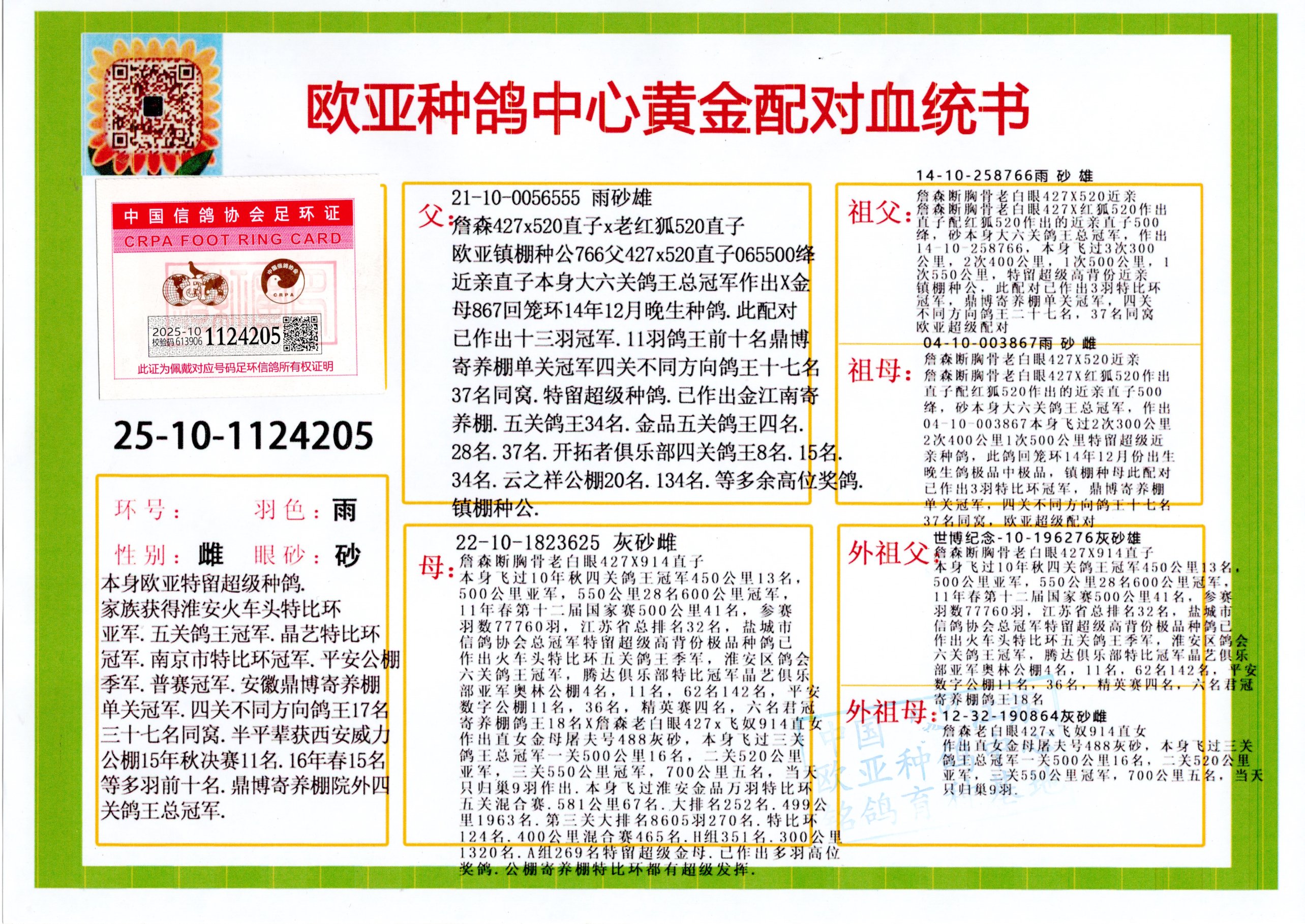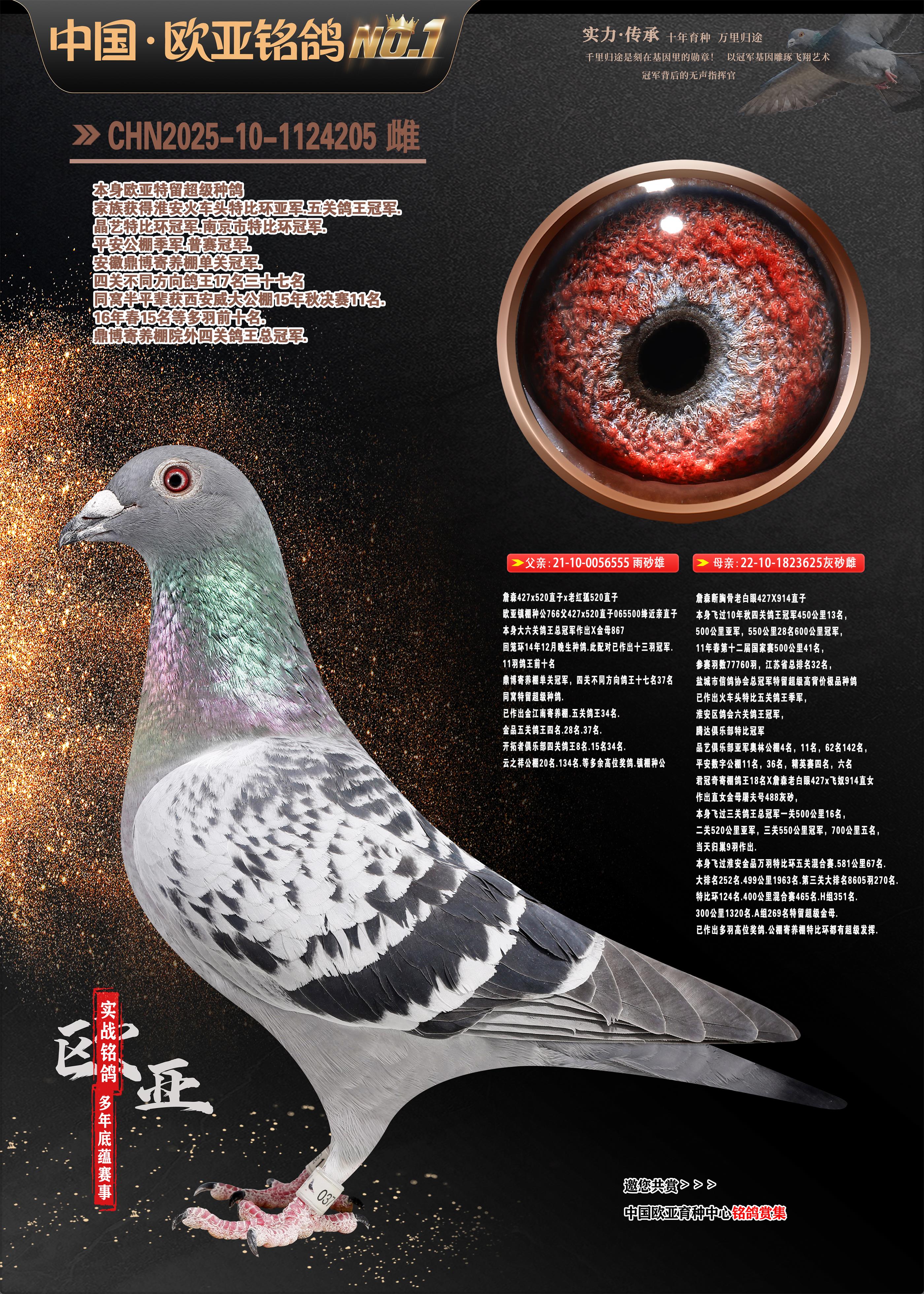 24年秋南京特比環(huán)歐亞榮獲大團體冠軍.小團體冠軍551公里大特比13名.14名.16名.19名.20名.21名.24名.26名.27名.28名.42名.52名.54名.57名.65名.66名.68名.70名.71名.72名.74名.76名.80名.82名.83名.84名.85名.86名.90名.92名.110名.116名.121名.122名.128名.131名.158名.161名.164名.165名.166名.172名.174名.177名.182名.195名.196名.201名.205名.208名.210名.216名.253名.269名.275名.276名.294名.296名.299名,,24年秋云南天南銅都公棚決賽415名.天南銅都小棚決賽409名.云南玉活公棚決賽102名.490名.團體32名上籠二羽進二羽,天南銅都大棚506公里決賽445名。熱烈祝賀河北省巨鹿縣李蘭生老師用歐亞泰山號血系連續(xù)十一年奪冠軍,河北省國家賽冠軍.全國季軍等多次前十名高位,揚州王軍王總用歐亞利奧24年春季獲山東翔宇公棚決賽33名蓋比53名。南京劉正龍劉總用歐亞蓋比獲得24年秋山東濰坊國際公棚決賽42名.精英賽30名.三關鴿王71名.決賽86名.加站賽16名.南京市特比環(huán)A組鴿王9名.B組鴿王5名.6名.C組鴿王5名.精英賽冠軍4名.技能賽A組冠軍4名.5名.秦淮區(qū)特比環(huán)榮獲15名.46名.48名.87名。四川西昌徐亮徐總用歐亞利奧獲得涼山州聚友決賽177名.第二關亞軍雙關鴿王19名.三關鴿王105名.云南豪庭公棚決賽603名。熱烈祝賀24年四川重慶翔園鴿舍用歐亞泰山號榮獲春季400公里冠軍.秋季500公里冠軍,河北王總用詹森X利奧獲得千羽千翔公棚400公里冠軍,廣東蔡楷煥榮獲24年秋愛好者 賽鴿俱樂部三關鴿王季軍.一關420公里99名.二關450公里11名.三關520公里32名.單關季軍.7名.12名,江西李衛(wèi)興榮獲貴州紅楓公棚8名.共翔俱樂部寄養(yǎng)棚四關綜合鴿王30名.一關400公里78名.二關500公里55名.三關520公里37名.四關500公里57名.同父母獲公棚18名.雷鳴獲得武漢黃浦育翔中心冠軍,四川陳文獲得四川明鴻俱樂部300公里夢幻2名.3名.4名.9名.10名.13名.14名.15名.31名.34名.40名.41名.42名.43名.69名.71名.72名.73名.74名.94名.95名.97名.98名.99名.419公里決賽榮獲總冠軍7名.總共歸巢9羽,四川徐亮獲豪庭決賽603名,山西鄭勇獲得山西泰鑫公棚決賽255名詹森紅狐,熱烈祝賀馬總獲得開爾(飛躍隊)決賽9名獲獎金1310000萬元.第一關52名,天津津福資賽180公里96名.獲獎金429543萬元,歐亞支持全國鴿友24年秋多人報喜 祝大家取得更好成績,給歐亞報喜鴿友歐亞決定給每人贈送一羽超級種鴿。歐亞俱樂部特比環(huán)多關鴿王成績:15年秋淮安特比環(huán)黑色星期一全會上籠9700多羽,當天無鴿歸巢,第二天全會歸巢357羽,本舍歸巢158羽.前十名八羽.前一百名歸巢57羽,16年春季獲五關鴿王總冠軍,總亞軍四名.六名.七名.九名.十名.晶藝俱樂部520公里冠亞季軍5名.6名.7名.9名.11名等,火車頭冠軍.季軍6名.8名.9名.10名,16年秋晶藝俱樂部特比環(huán)520公里亞軍.季軍4名.6名.7名.9名,15年春南京白下特比環(huán)冠軍.亞軍.季軍6名.7名.8名.9名.10名.指定鴿A B組獲得冠軍.亞軍.季軍4名.5名.,17年淮安特比環(huán)亞軍.4名.5名.7名.8名.10名.六關鴿王總冠軍.4名.6名.9名.10名,寄養(yǎng)棚宿遷劉總20羽特比環(huán)獲冠軍.季軍.4名.7名.8名.9名等。18年榮獲萬羽特比環(huán)六關鴿王總冠軍.總亞軍.總季軍.6名.8名.十名.單關四羽冠軍.二羽亞軍.四羽季軍.前十名27羽。19年秋萬羽特比環(huán)六關鴿王總亞軍.總季軍.5名.8名等,單關二羽冠軍.三羽亞軍.一羽季軍前十名31羽。20年秋淮安市鴿會四關特比環(huán)大賽風雨無阻鴿王亞軍.鴿王六名,金品俱樂部萬羽特比環(huán)六關鴿王總冠軍,總亞軍.四名.五名.六名.七名.八名.十名.前二百名鴿王35羽,單關冠亞季軍前十名四十多羽,火車頭五關鴿王季軍.六名.八名.前二百名鴿王十七羽。20年春榮獲淮安五區(qū)一市四關鴿王總冠軍.亞軍.四名.八名.九名。21年秋榮獲金品萬羽特比環(huán)大賽六關鴿王總亞軍.總季軍.四名.七名.九名.十名.單關冠亞軍季軍前十名三十多羽;疖囶^協(xié)會鴿王六名.七名.十名.單關前十名十七羽。22年秋榮獲鴿王總冠軍.總亞軍.5名.7名.8名.9名.11名.單關冠亞季軍前十名三十多羽,第一關單關前二百名四十多羽,第二關前二百名三十多羽,第三關前二百名四十多羽,第四關前二百名四十多羽,第五關前一百名53羽。23年秋榮獲鴿王季軍.五名.八名.十名.13名.17名.20名.27名等多羽鴿王.單關前十名二十多羽。公棚.寄養(yǎng)棚部分成績:16年秋寧夏黃河公棚總冠軍電腦戈馬力指定通炮冠軍,17年送八羽參賽獲得鴿王八名進獎四名,支持韓總榮獲八名。支持鴿友榮獲寧夏中衛(wèi)公棚決賽總冠軍.精英賽冠軍,支持18年寧夏黃河公棚決賽冠軍詹森X泰山。安徽鼎博寄養(yǎng)棚院內外四關鴿王總冠軍.鴿王十七名.三十七名同窩,鴿王39名.42名.58名.67名。18年山東公棚預賽冠軍.決賽65名.送八羽進獎五羽.指定獲奔馳汽車一輛。支持鴿友獲得云南藍云公棚冠軍.蓋比X佛卡門。支持鴿友榮獲云南銀集公棚決賽冠軍 詹森427X520血系 速度賽6700羽冠軍。17年榮獲金馬俱樂部寄養(yǎng)棚四關鴿王總冠軍.季軍.六名.八名.第一關冠軍.亞軍.季軍四名.七名.十一名.金牌教練獎。支持鴿友18年北京費翔公棚預賽九名電腦X桑杰士,支持鴿友榮獲陜西威力公棚決賽11名.內蒙古臨河寄養(yǎng)棚四關鴿王六名.詹森配泰山,支持河北王總用歐亞詹森427配胡本喜獲20年秋開爾青年棚季軍。云南東榮公棚16年預賽冠軍.決賽77名.17年決賽12名.詹森紅狐X泰山,17年平安公棚決賽4名