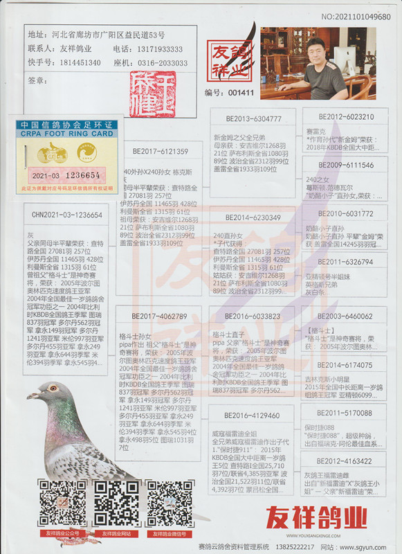 3、注明:請注意看種鴿和血統(tǒng)圖片,有的種鴿環(huán)卡丟失,有些獎鴿無環(huán)卡和獎狀和血統(tǒng),介意請勿出價;