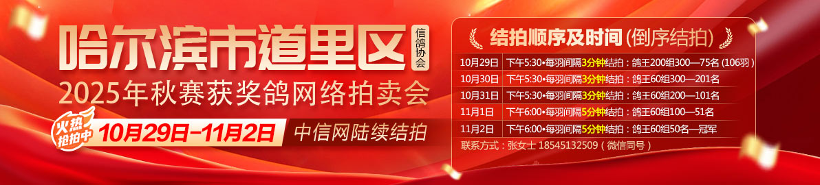 黑龍江哈爾濱道里區(qū)信鴿協(xié)會(huì)2025年秋季獲獎(jiǎng)鴿網(wǎng)絡(luò)拍賣會(huì)已定于2025年10月27日-11月2日進(jìn)行,歡迎各界鴿友蒞臨。