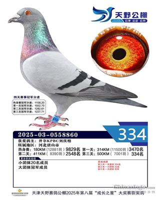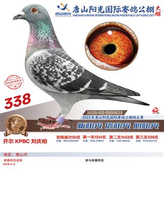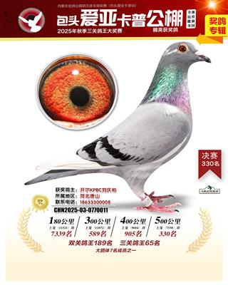 25年秋唐山陽光寄養(yǎng)棚五關鴿王277名 CHN2025-03-1021720 本身賽績:25年秋唐山陽光寄養(yǎng)棚五關綜合鴿王277名,第四關115名親兄妹賽績:25年秋遼寧神州輝煌1號棚決賽510公里384名 瀏覽量:585 次 [詳細介紹] [詢價]