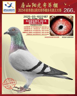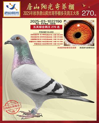 25年秋唐山陽光寄養(yǎng)棚五關鴿王270名 CHN2025-03-1022190 本身賽績:25年秋唐山陽光寄養(yǎng)棚五關綜合鴿王270名 瀏覽量:738 次 [詳細介紹] [詢價]