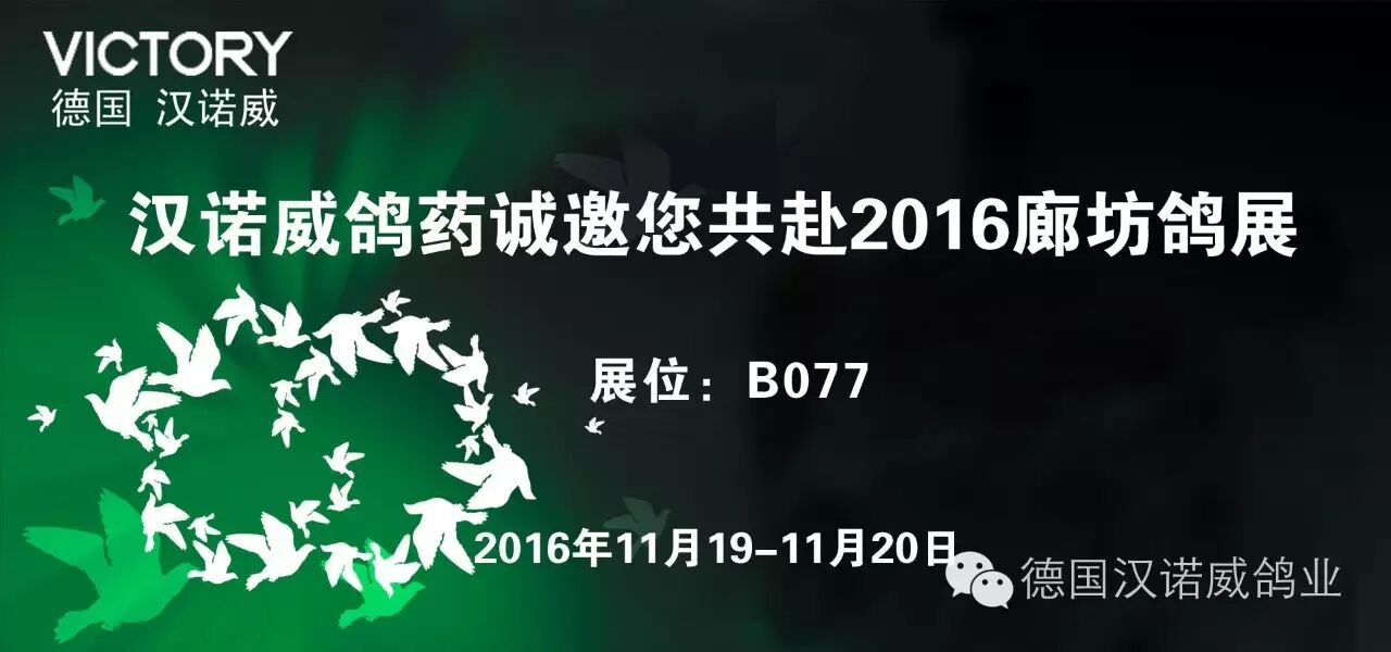 2016年中國廊坊(國際)鴿展于11月19日-11月20日在河北省廊坊市藝術(shù)大道與友誼路交叉口廊坊國際會展中心隆重召開,德國漢諾威鴿藥展位號為B077,歡迎廣大經(jīng)銷商與鴿友蒞臨指導(dǎo)。