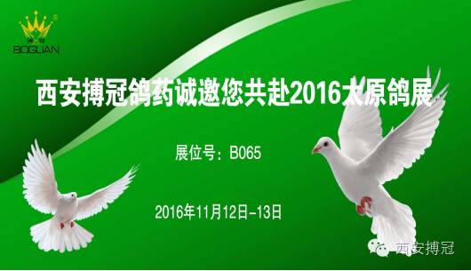 山西省信鴿養(yǎng)殖者及鴿友眾多,且極具規(guī)模。為促進(jìn)西部地區(qū)信鴿產(chǎn)業(yè)的發(fā)展,2016年第三屆太原國際銘鴿展覽會(huì)將在山西省展覽館中心舉辦,西安搏冠與您再次相約,歡迎您蒞臨展位,指導(dǎo)工作,預(yù)祝太原鴿展圓滿成功!