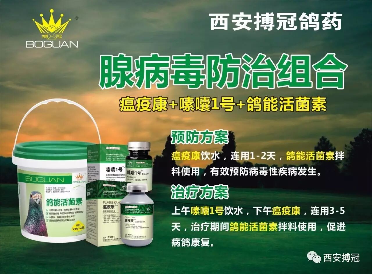 ⑵適度進(jìn)行藥物預(yù)防,健康鴿、賽鴿集鴿當(dāng)天及歸巢后使用瘟疫康飲水,可預(yù)防腺病毒發(fā)作。隔離比賽歸返選手鴿、新引進(jìn)鴿,觀察2-3天后沒有癥狀再合群,出現(xiàn)輕微癥狀使用腺疫清進(jìn)行隔離治療。