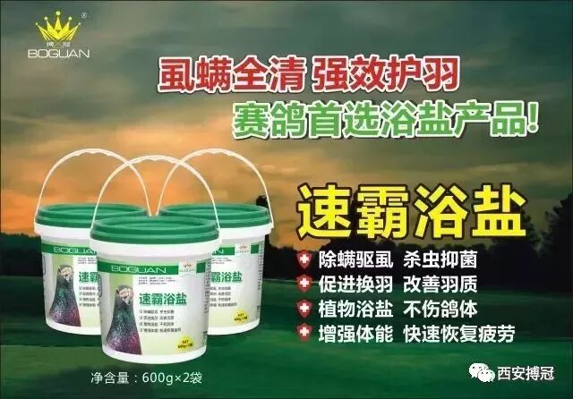 速霸浴鹽:天然植物提取配方,適用于21日齡的幼鴿,取本品一勺(約15g),加水10L攪勻,讓其自由沐浴10分鐘左右。日常保。好恐1-2天。炎熱潮濕的夏季:每周2-3天,防中暑,去虱螨。換羽期:每周3天,加速換羽,強化羽質,使新生羽毛亮麗富有光澤。 訓賽期:每周3天;交鴿前半天冷水洗浴,加速血液循環(huán),激發(fā)潛能;歸返后1-2小時溫水洗浴,幫助肌肉按摩,迅速恢復體力。 種鴿配對前兩周:每周3天。
