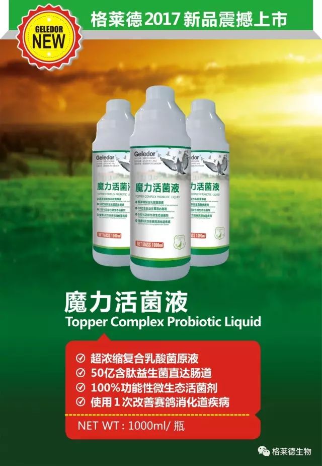 魔力活菌液-----本品富含乳酸菌、活性噬菌體、免疫多糖、益多肽等專為愛(ài)鴿研制的超濃縮復(fù)合益生菌,可直達(dá)腸道,抑制致病菌的入侵和定植,對(duì)賽鴿集訓(xùn)歸巢、交叉感染及各種原因引起的嘔吐、腹瀉水便、精神萎靡等消化系統(tǒng)混亂有效,是賽鴿腸道健康守護(hù)神。
