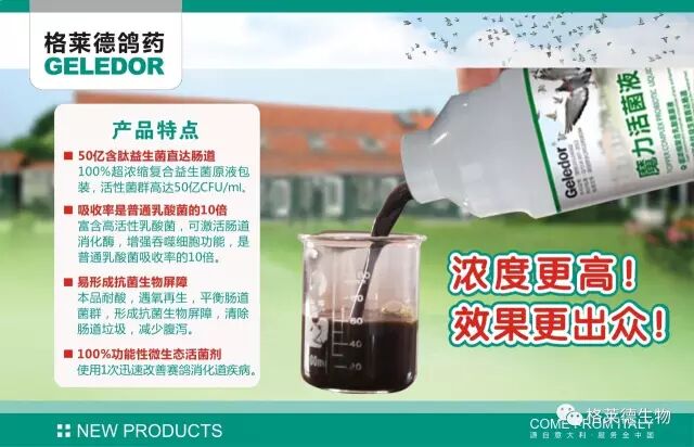 1、50億含肽益生菌直達(dá)腸道:富含噬菌體活菌、免疫多肽,100%原液包裝,無(wú)毒無(wú)副作用,遇氧再生,活性菌群高達(dá)50億CFU/ml,使用1次迅速改善賽鴿消化道疾病。