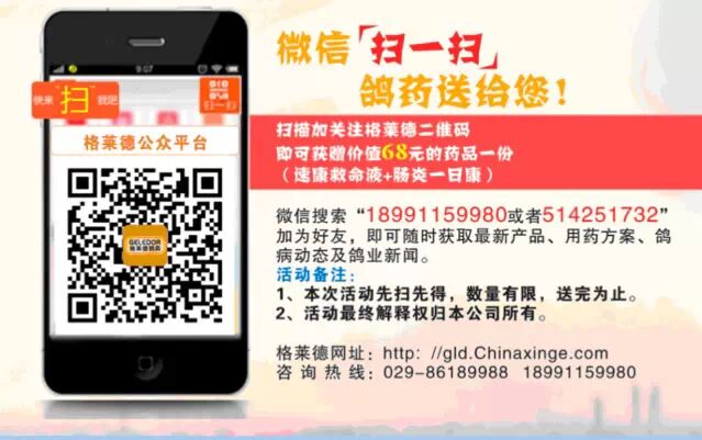 掃描加關(guān)注以下二維碼即可加我公司微信賬號,了解更多朋友圈動態(tài),感謝您關(guān)注格萊德鴿藥!