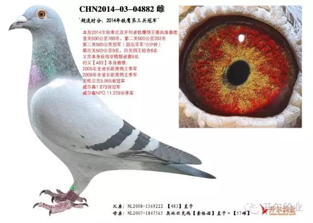 這兩羽賽鴿是同父母雙雄,2005和2006年、超級(jí)483號(hào)和超級(jí)484號(hào)分別獲得短距離鴿王冠軍和超長(zhǎng)距離鴿王冠軍,出自于同一父母的兩羽鴿子,卻在兩個(gè)不同級(jí)別的比賽中榮獲鴿王冠軍,這在賽鴿史上是獨(dú)一無(wú)二的,此血系來(lái)自于老詹森。